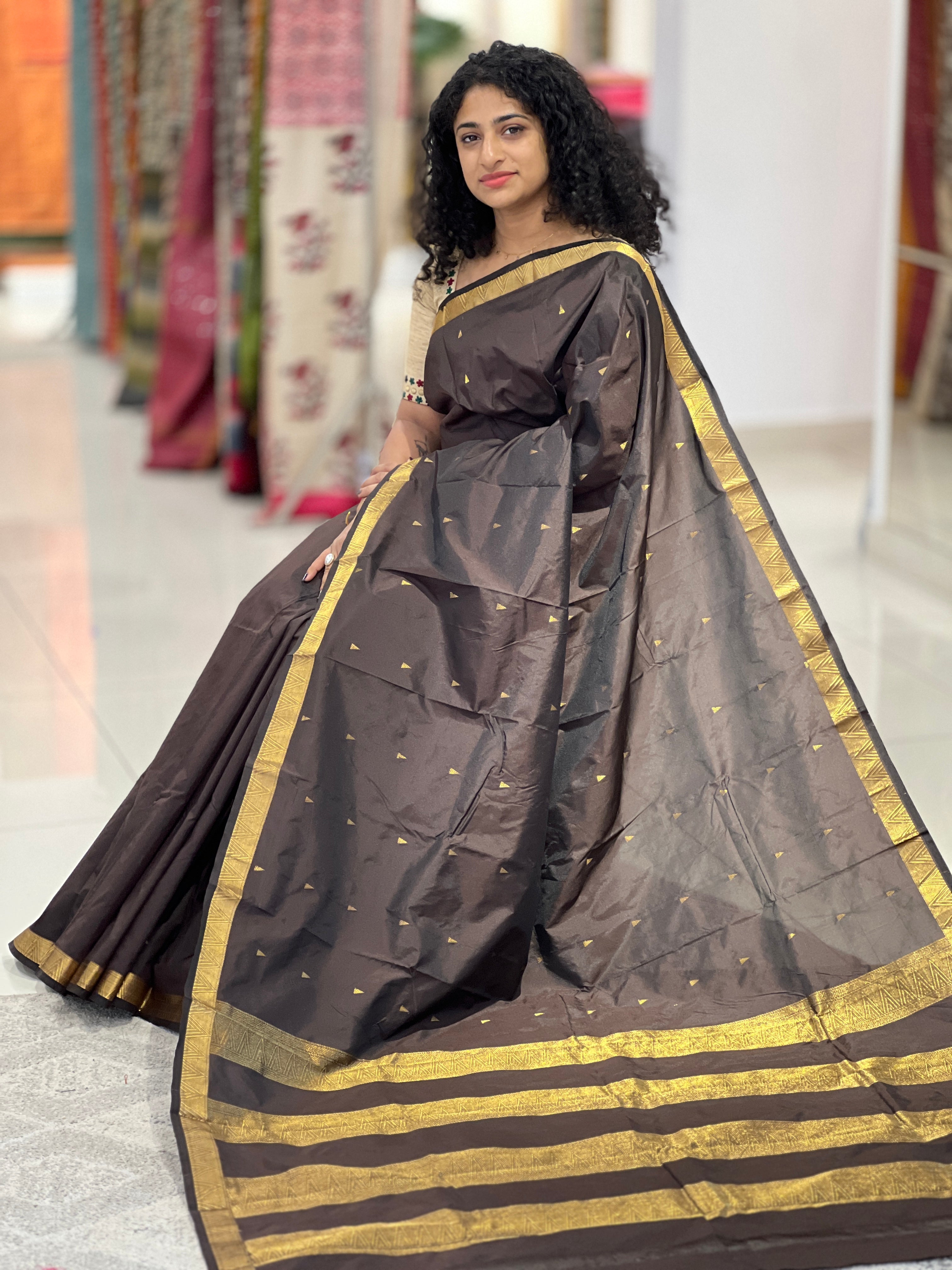 • Style: Zari Woven, Scattered Triangular Motifs, Zari Borders, Zari Stripe Patterned Pallu