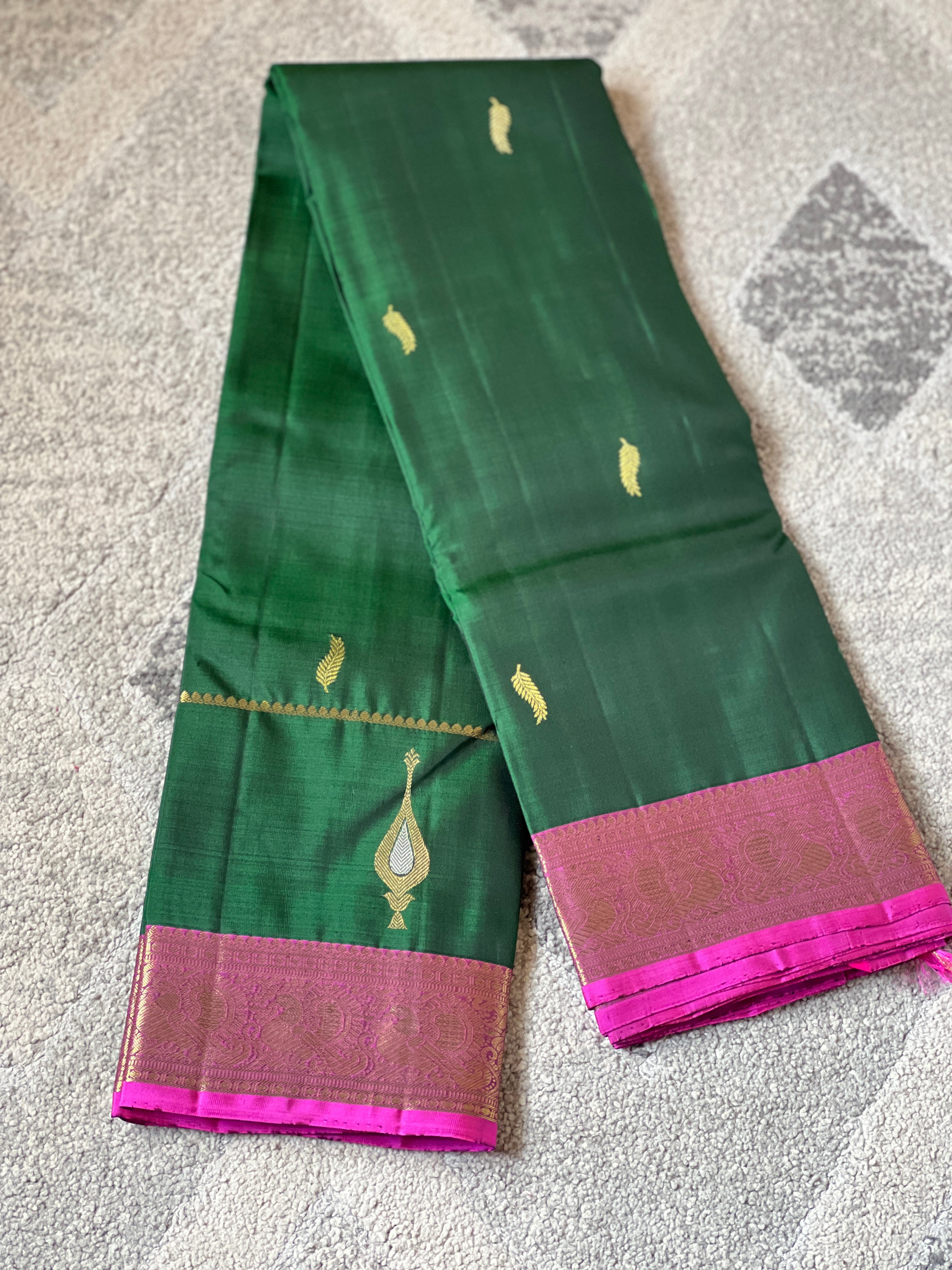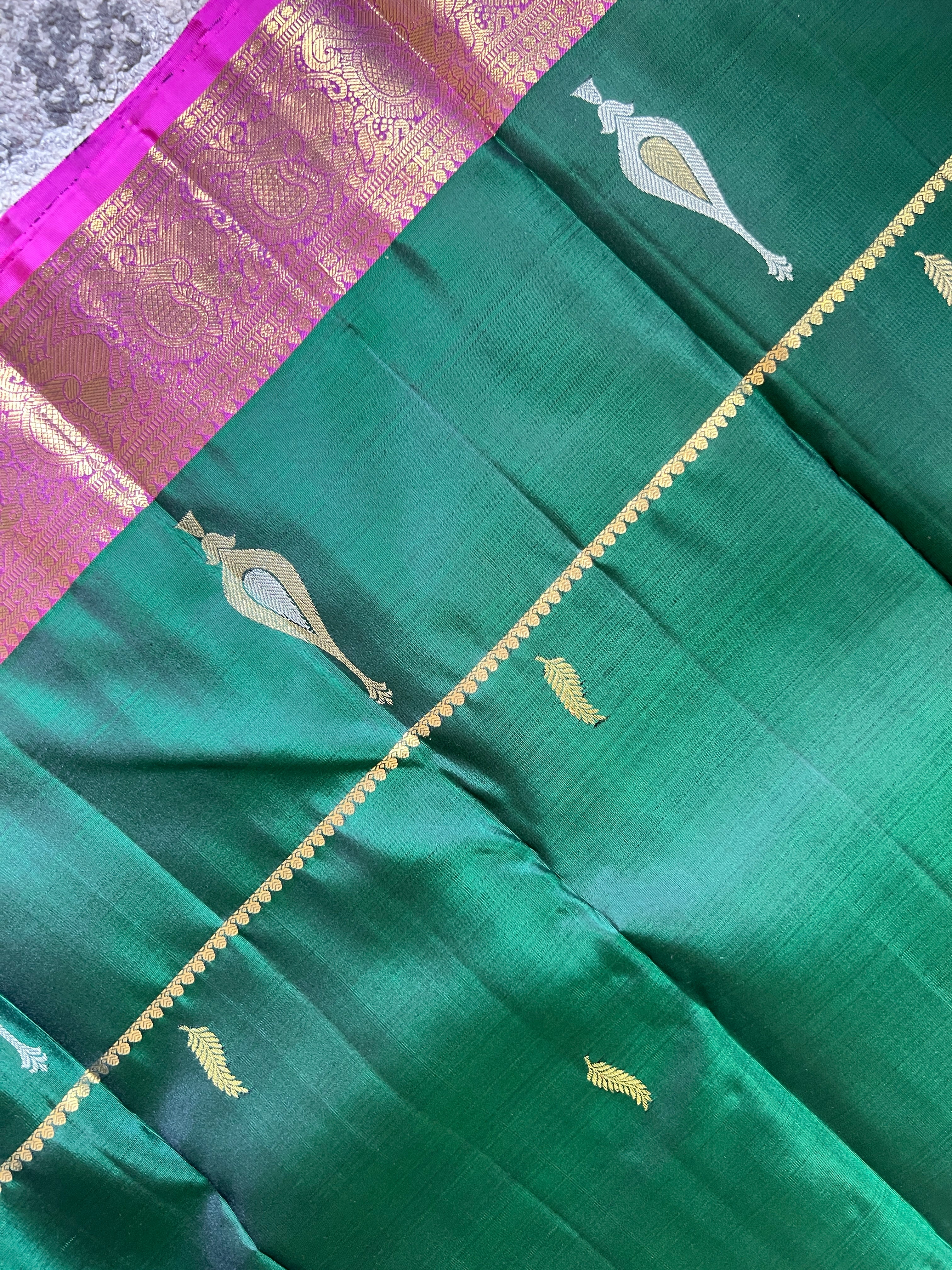 - Style: Silver & Golden Zari Woven Butas Detailing, Handloom, Traditional Leaf Patterned Pallu, Traditional Borders