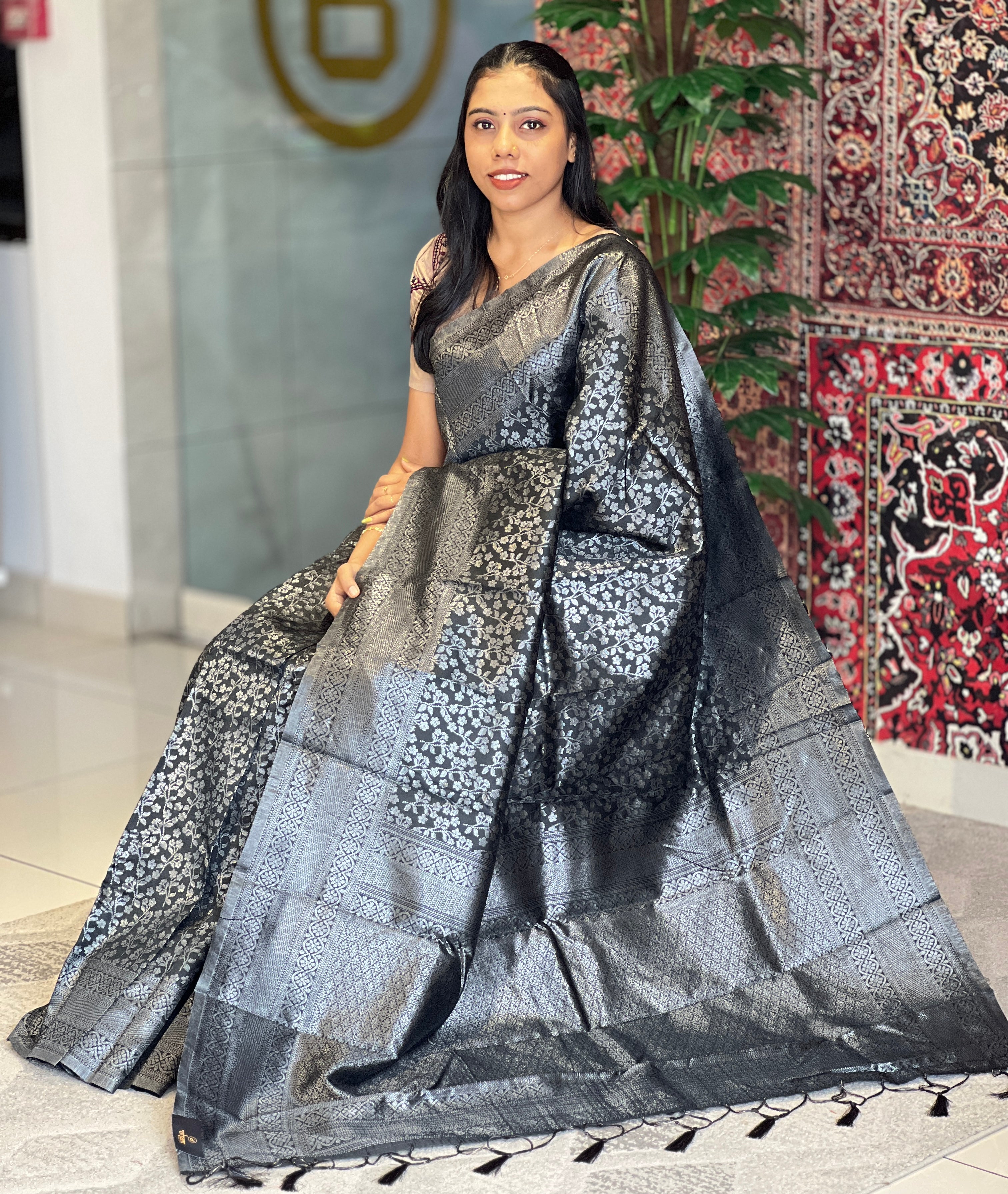 • Style: Silver Zari & Thread Weaved, Brocade Floral Pattern, Traditional Borders, Geometric Patterned Pallu, Tassels Detailing