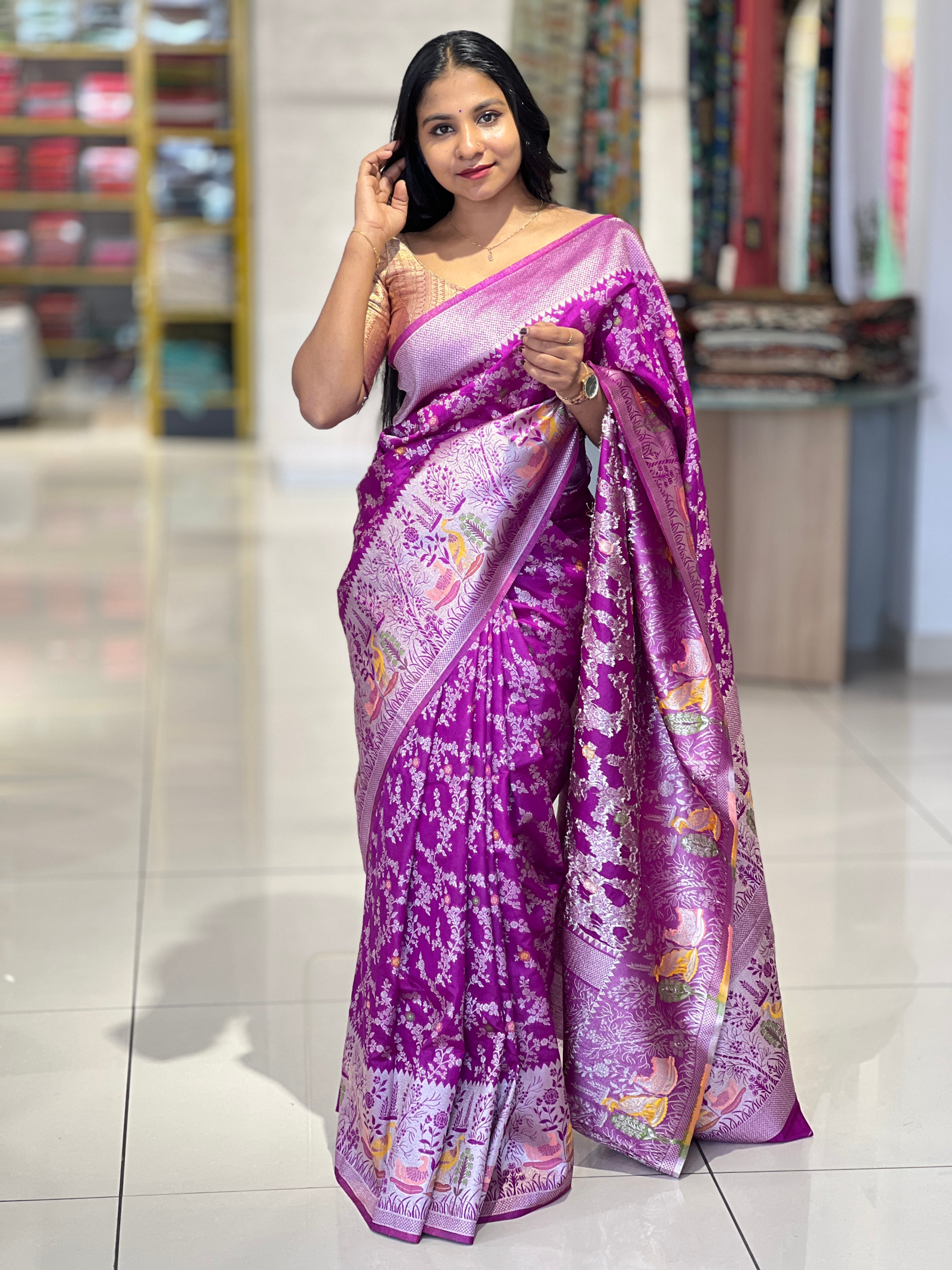 - Style: Silver Zari Weaving, Leaf&Floral Jaal Pattern Highlighted with Multicolour Threads , Floral & Birds Patterned Pallu & Border Detailing