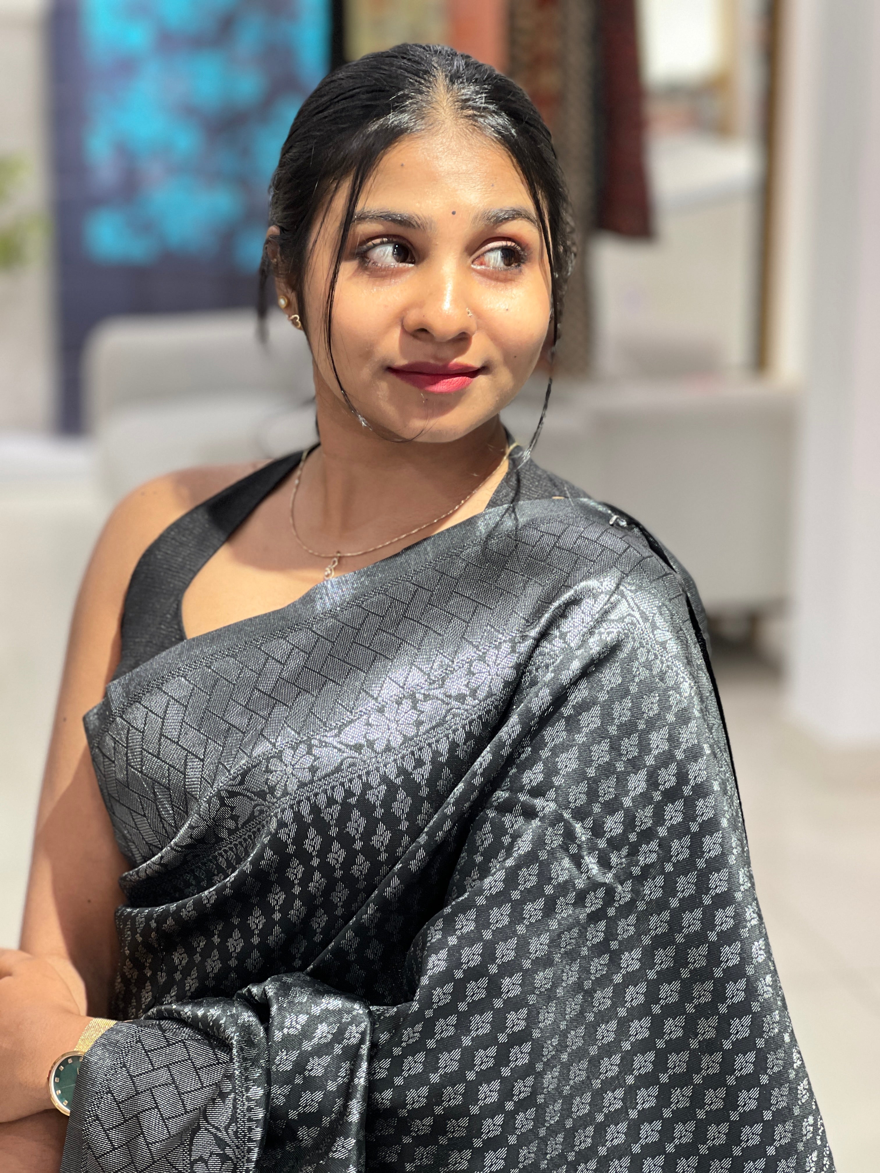 - Style: Silver Zari Weaved, Brocade Pallu, Border Detailing, Tassels Attached
