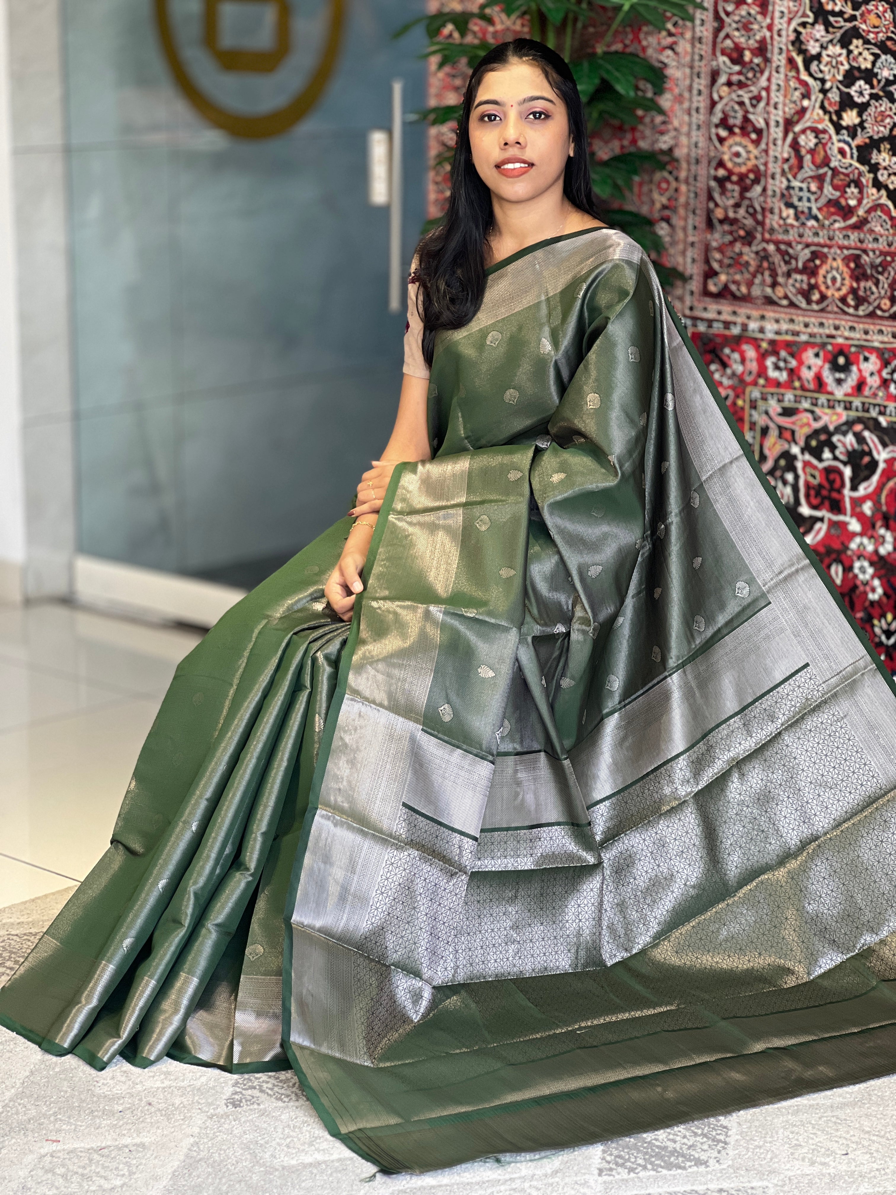 - Style: Silver Zari Weaving , Brocade Pallu with Floral Pattern, Scattered Buttas, Geometric Border Detailing