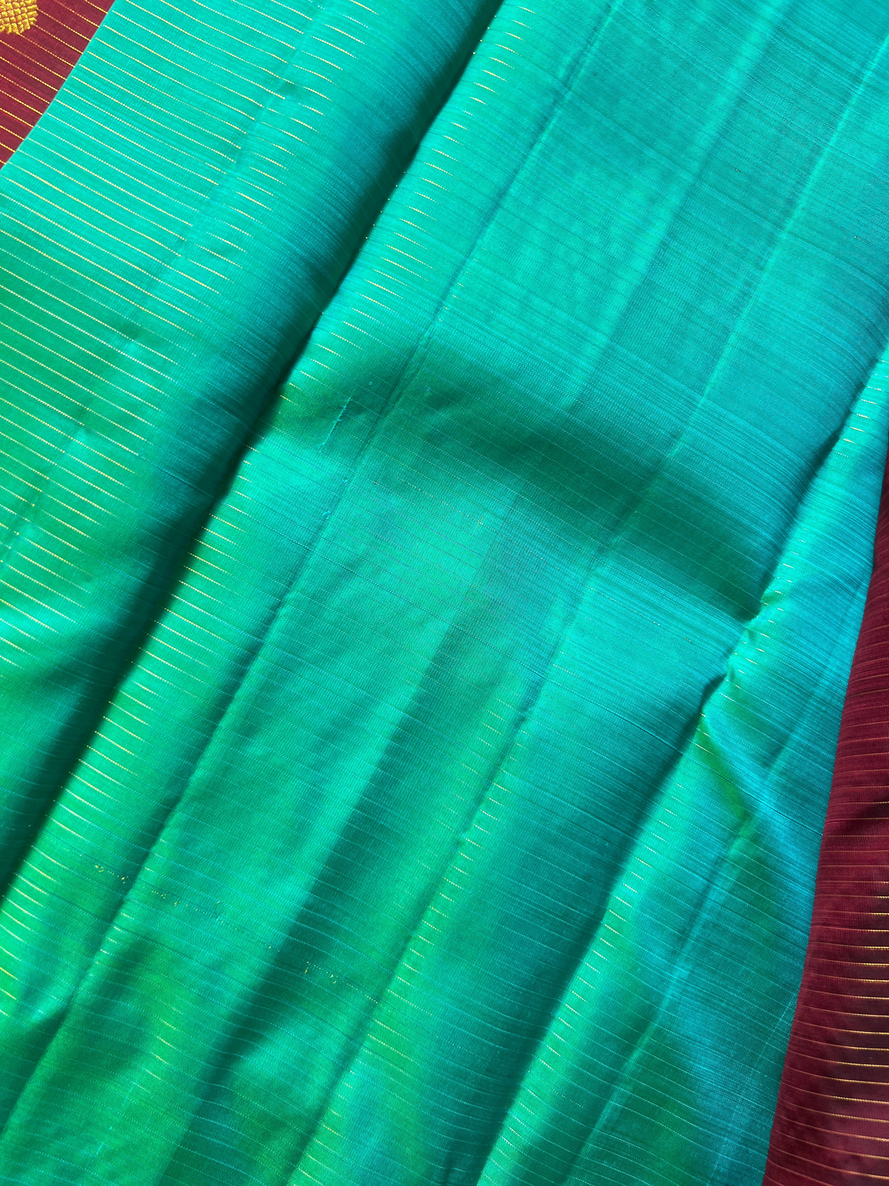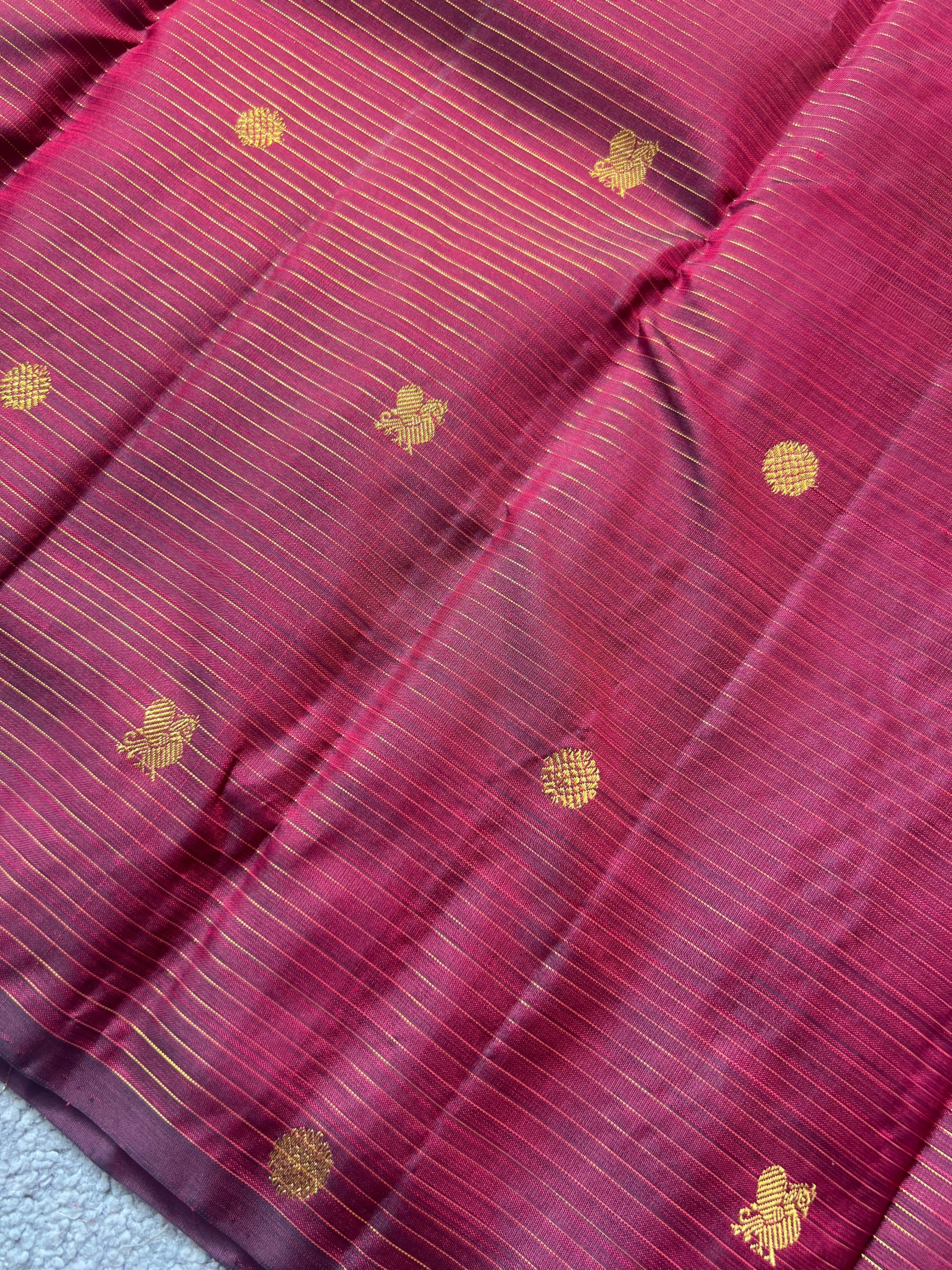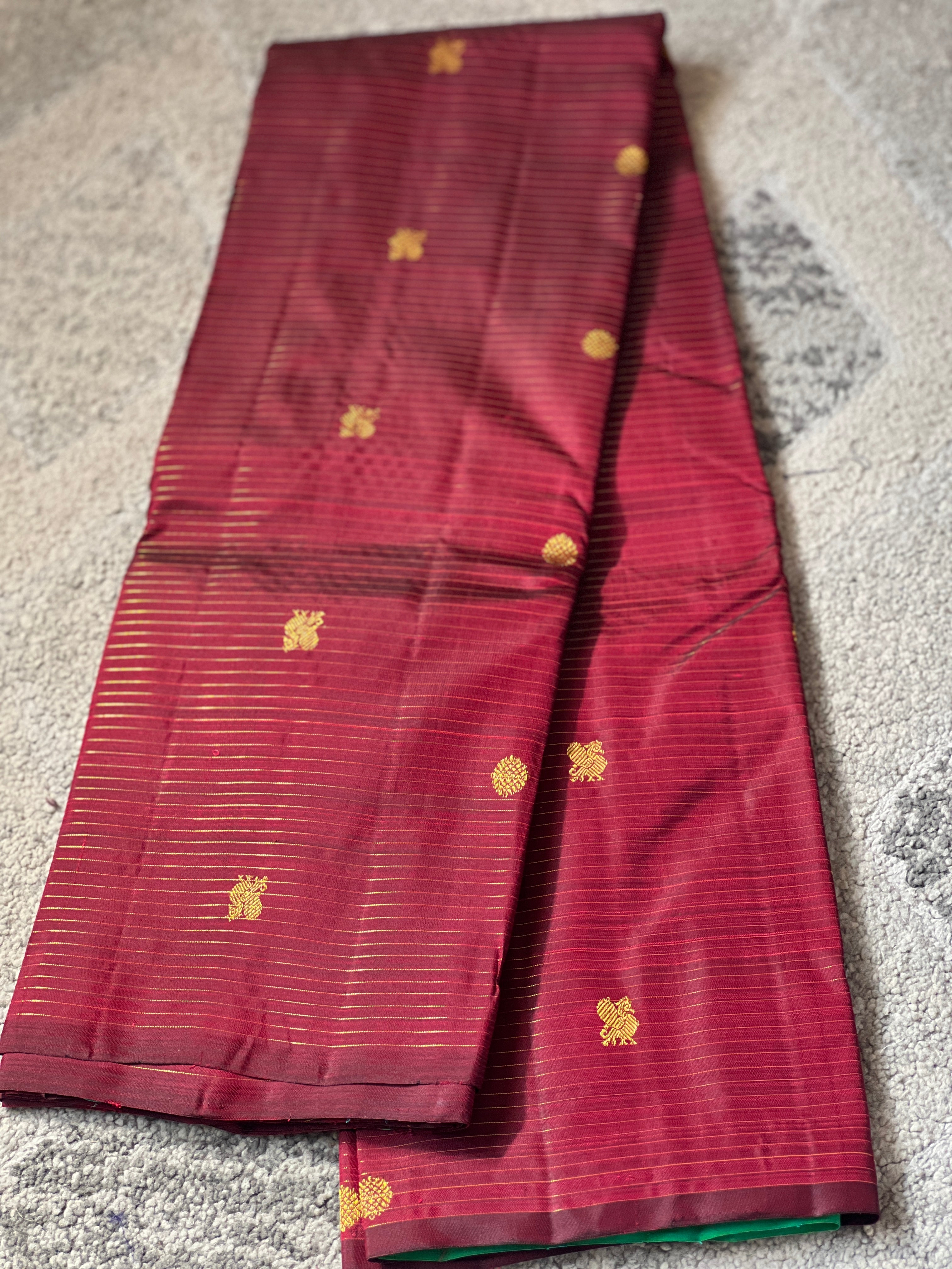 - Style: Golden Zari Woven, Handloom, Stripe With Traditional Buta Pattern, Diamond With Zig Zag Patterned Pallu