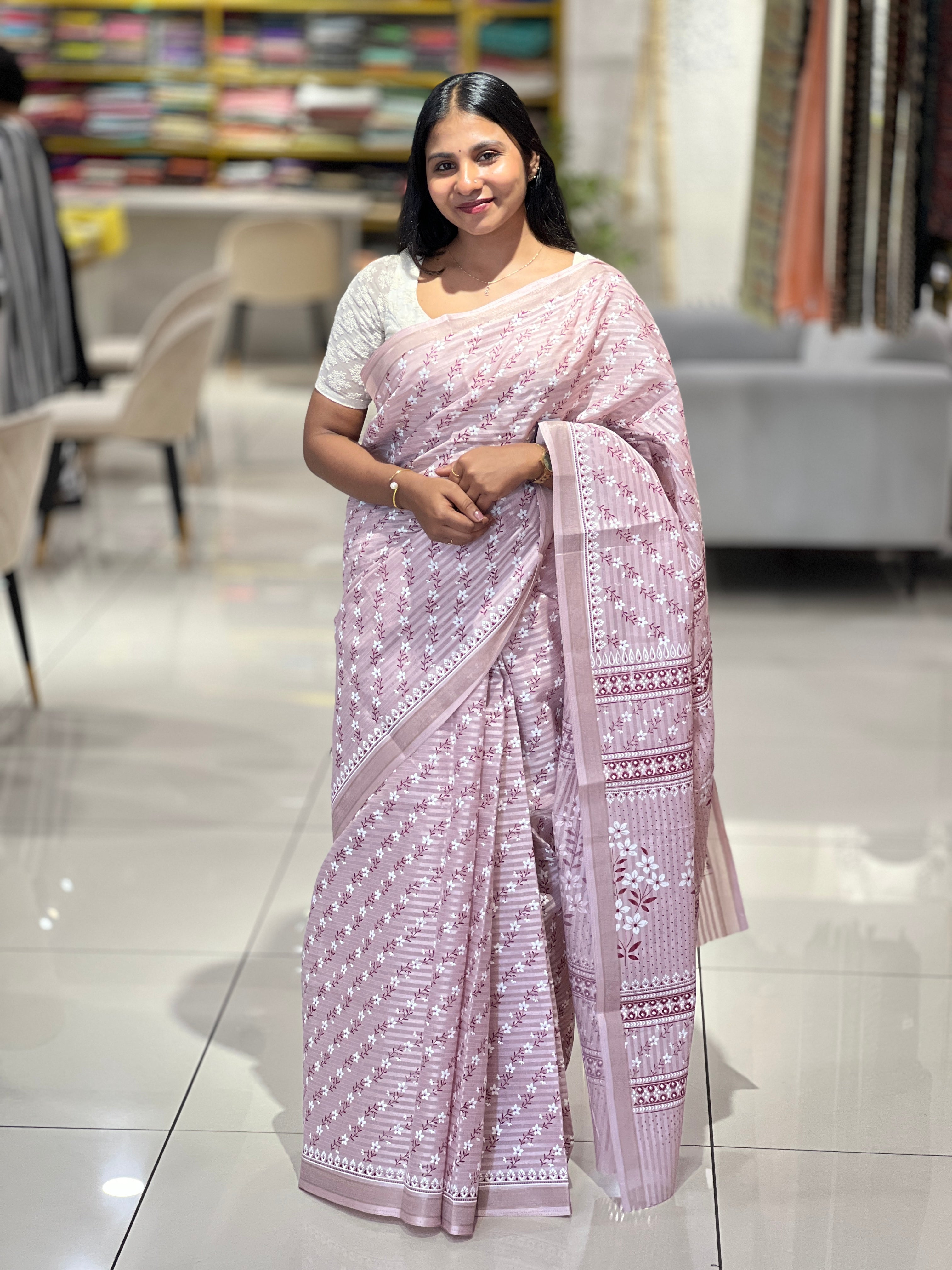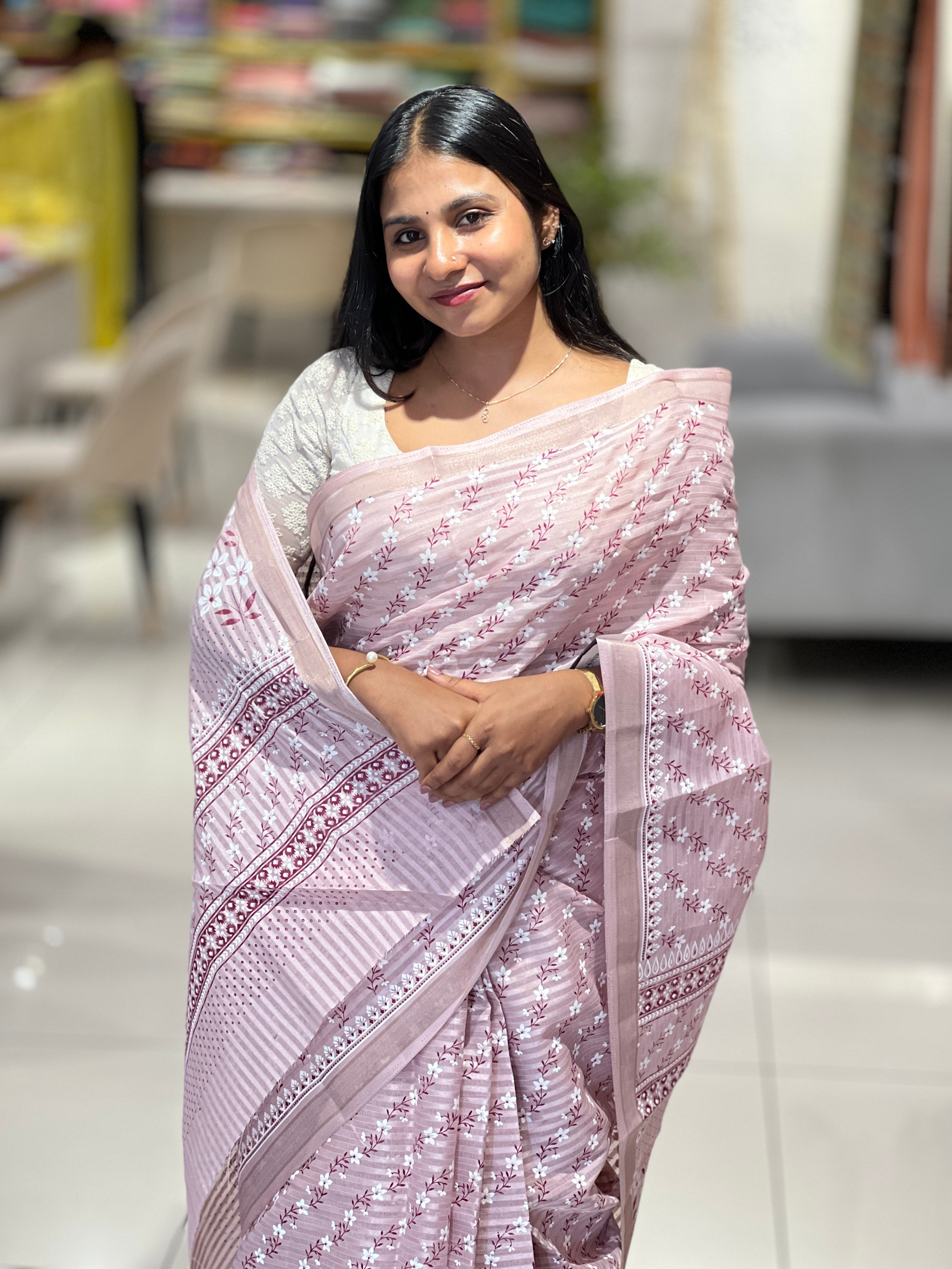 - Style: Stripe Pattern, Floral Jaal Patterned Print Detailing, Floral Printed Pallu, Zari Detailed Borders