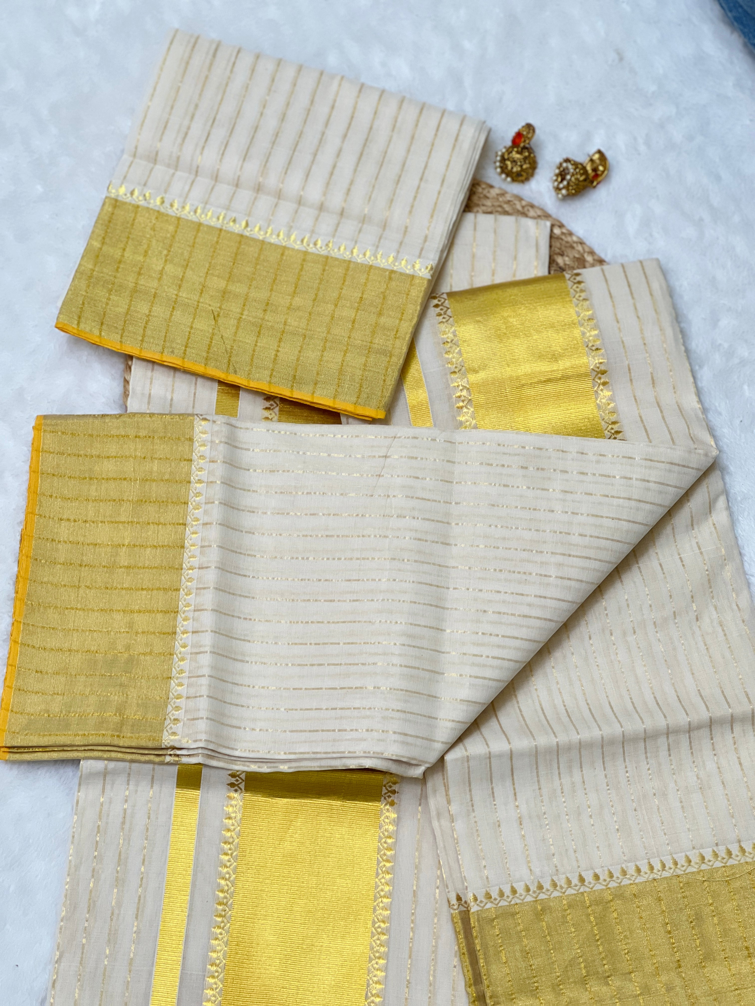 - Style: Handloom, Stripe Weaving Pattern , Golden Kasavu Border Detailing