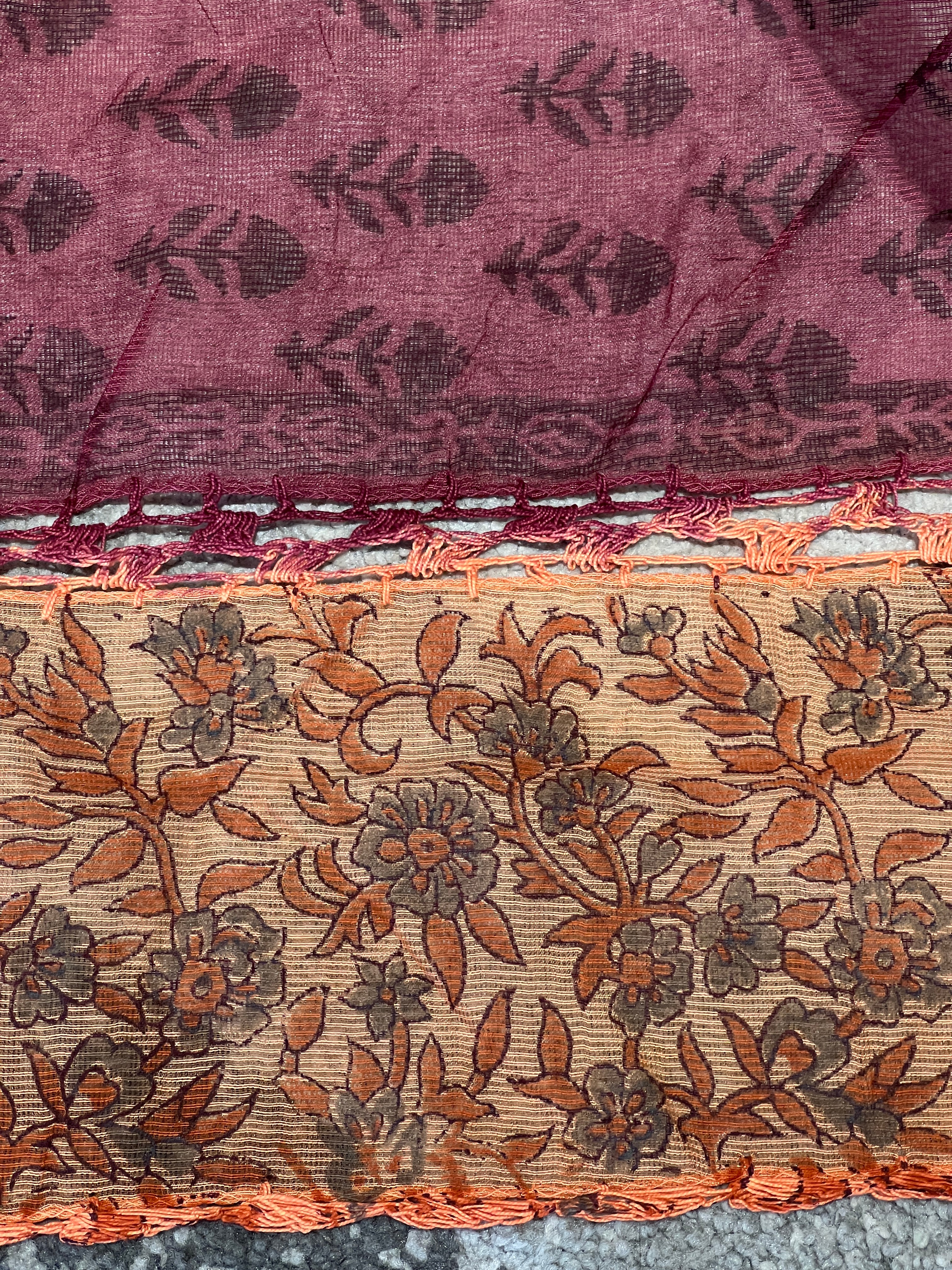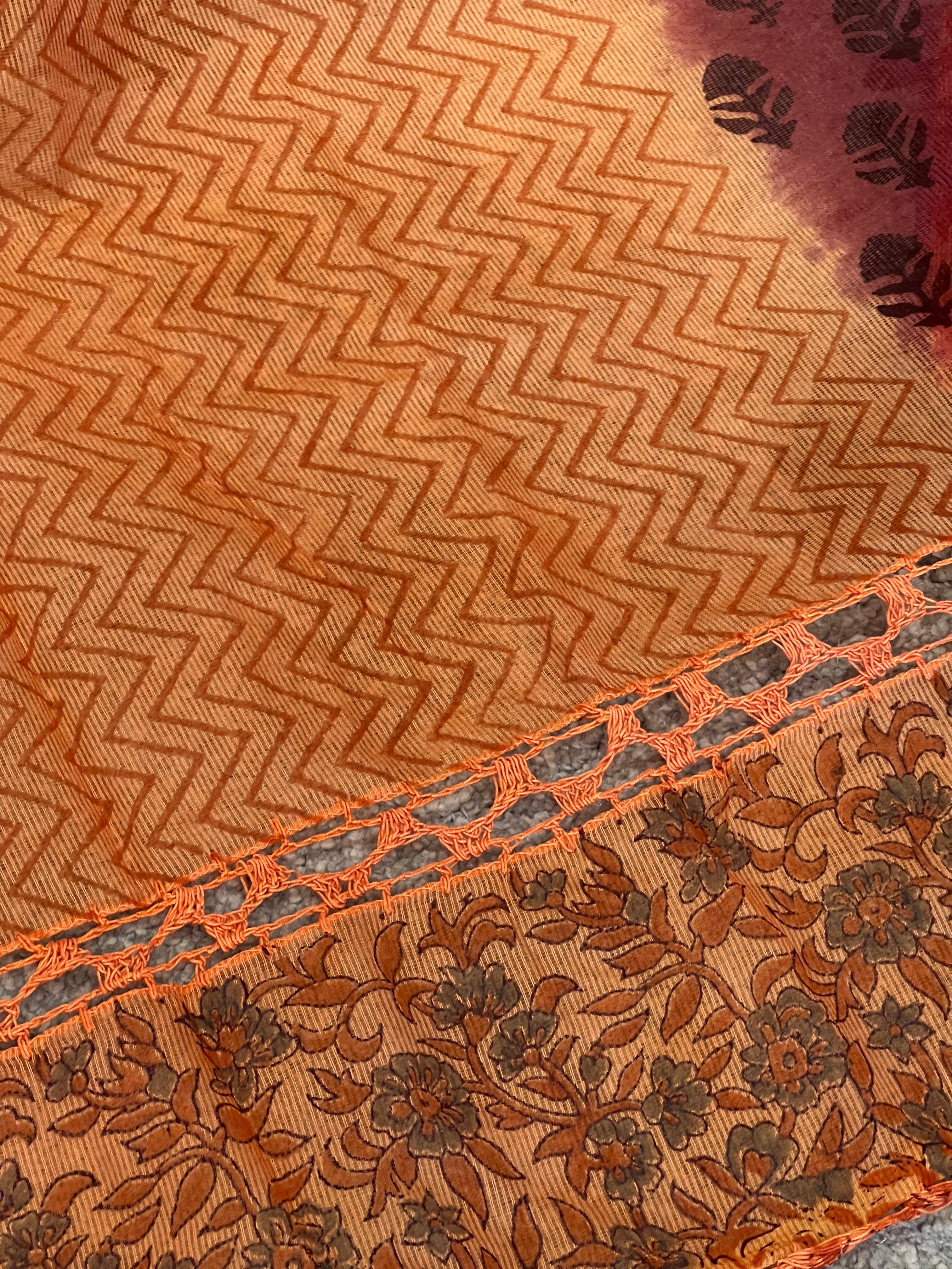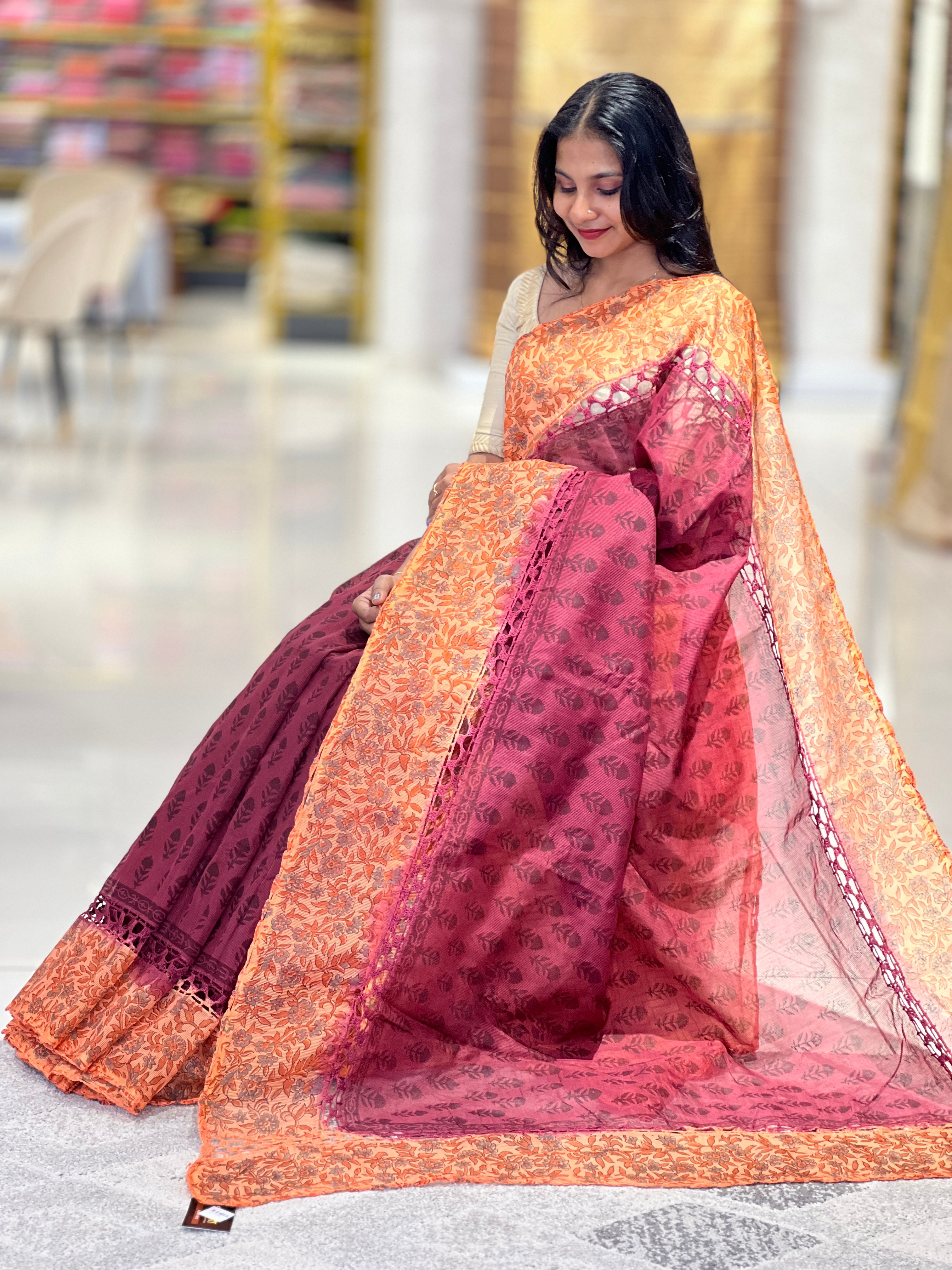 - Style: Block Printed, Crochet Lace Detailing, Contrast Border With Kalamkari Inspired Print, Floral Pattern