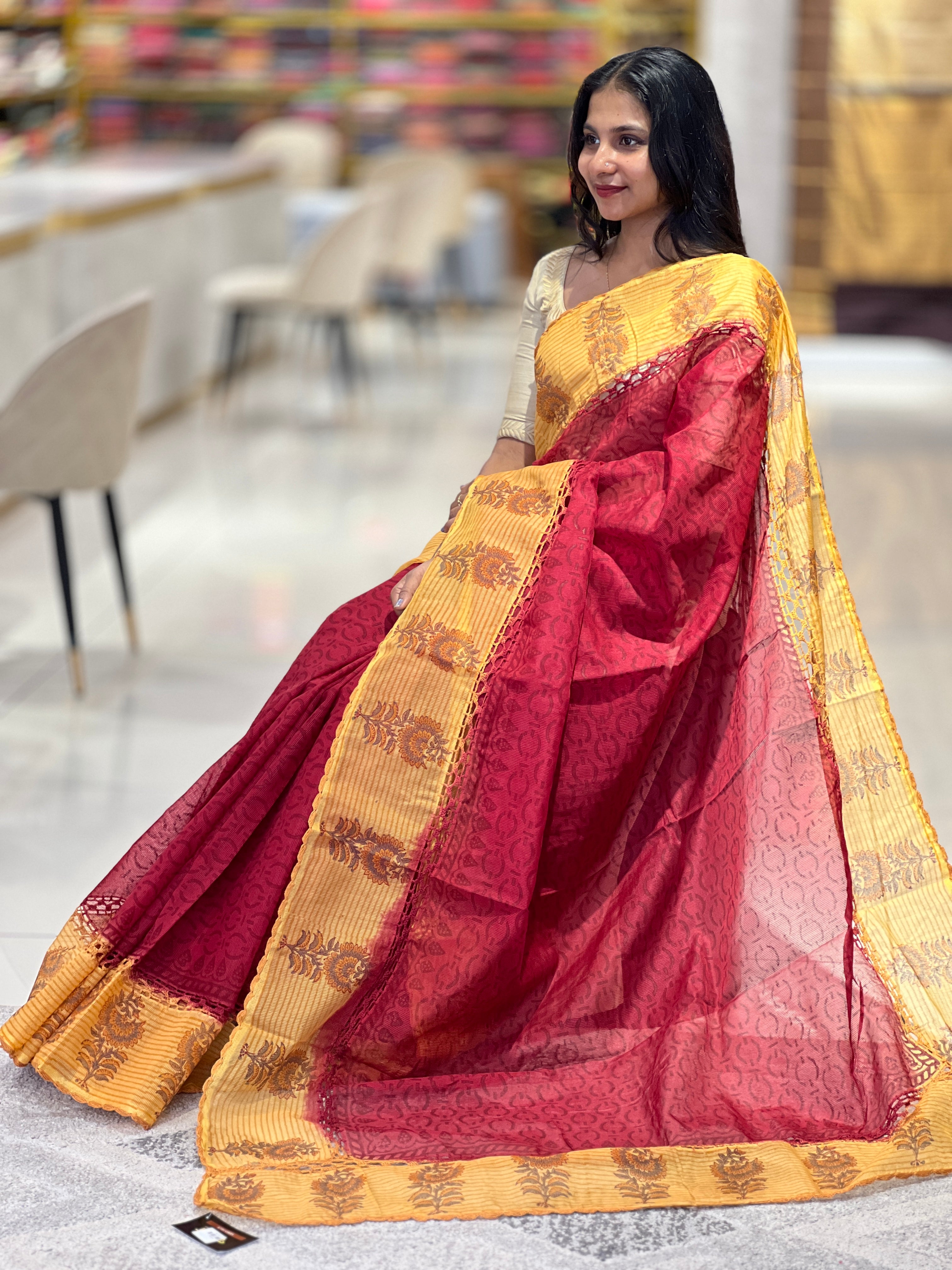 • Supernet Kota Saree With Block Printed Contrast Borders | PF1054