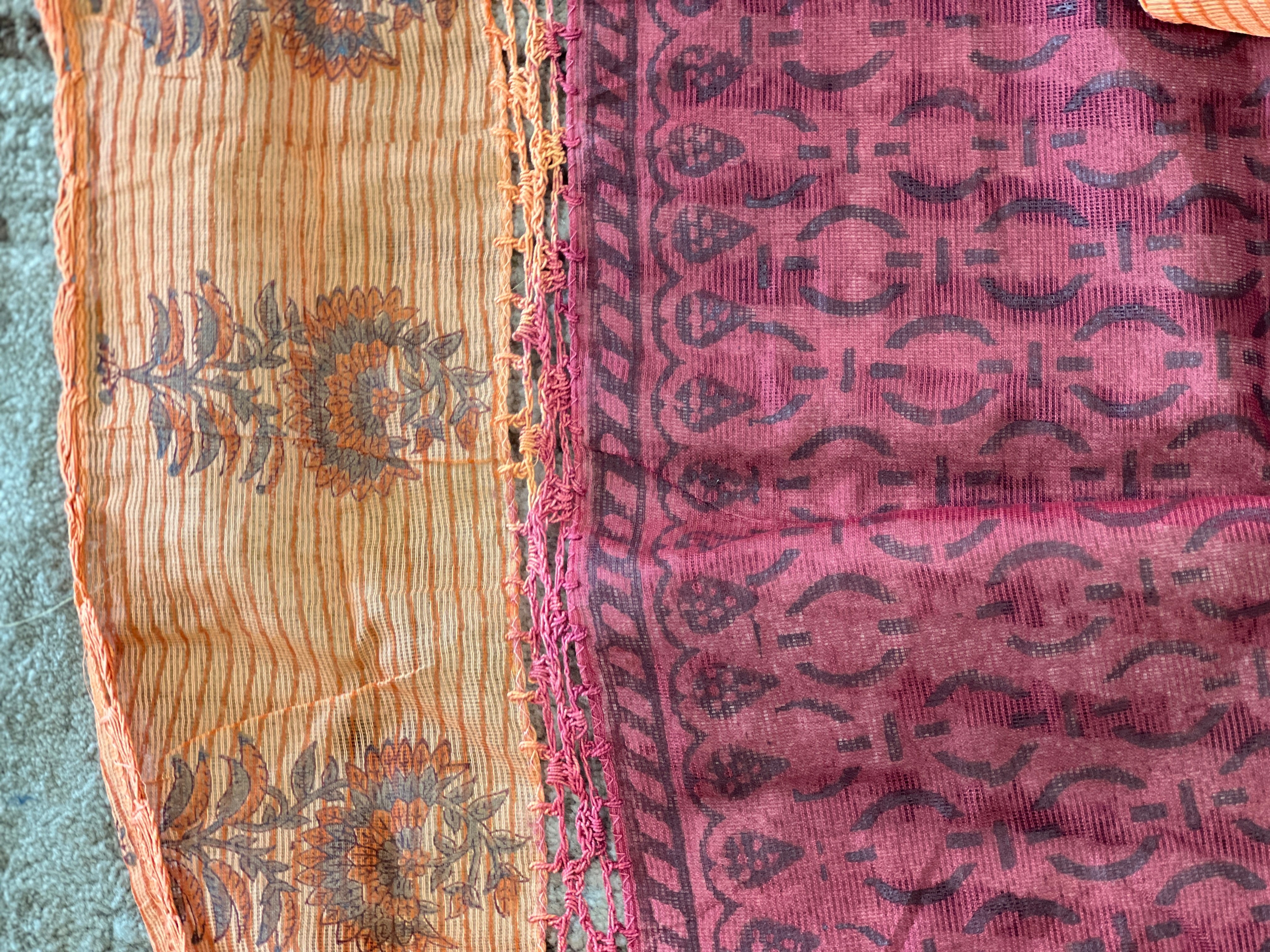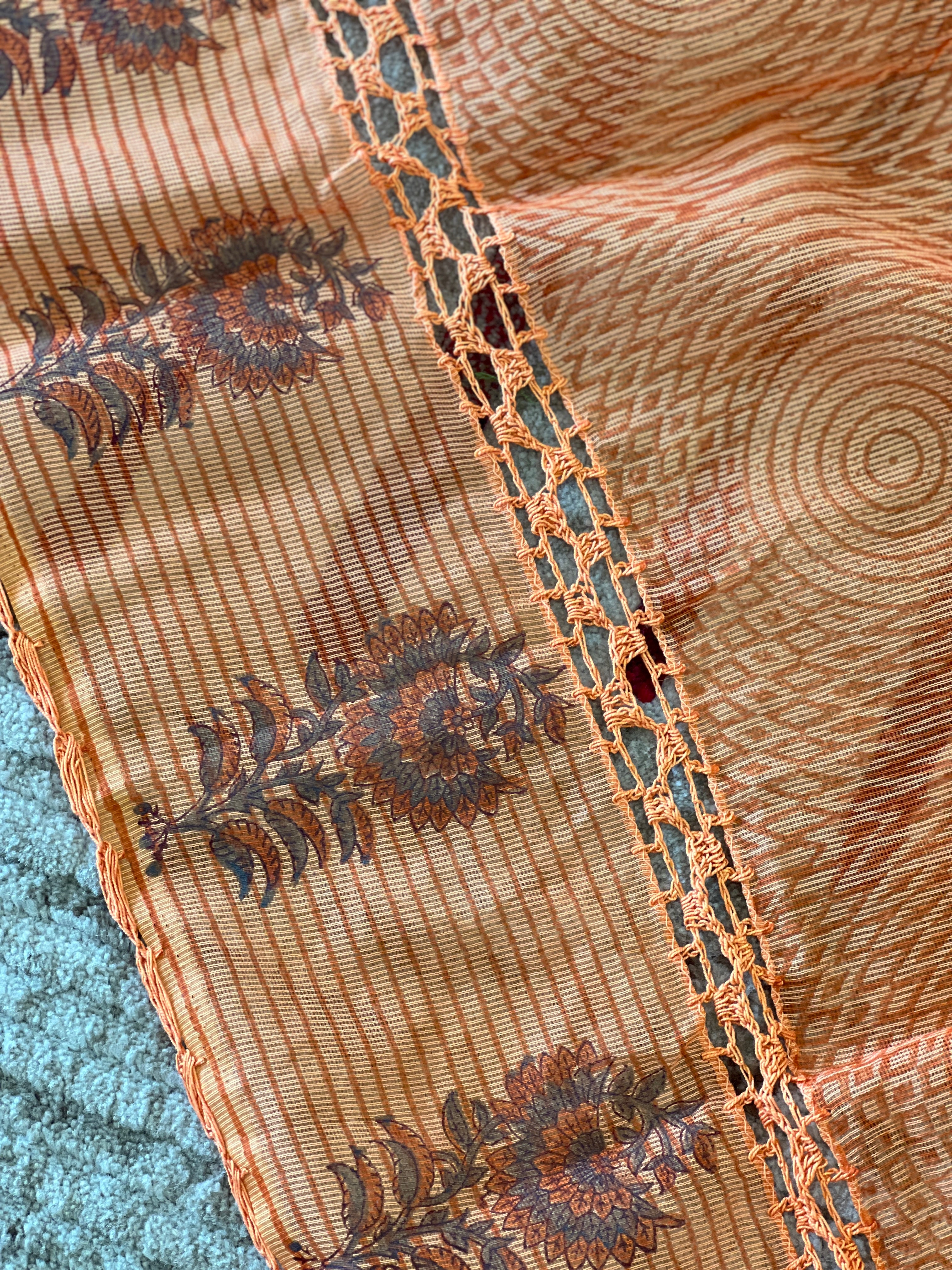 - Style: Hand Block Printed, Hand Crochet Lace Detailing, Contrast Border With Floral Buta, Geometric Pattern
