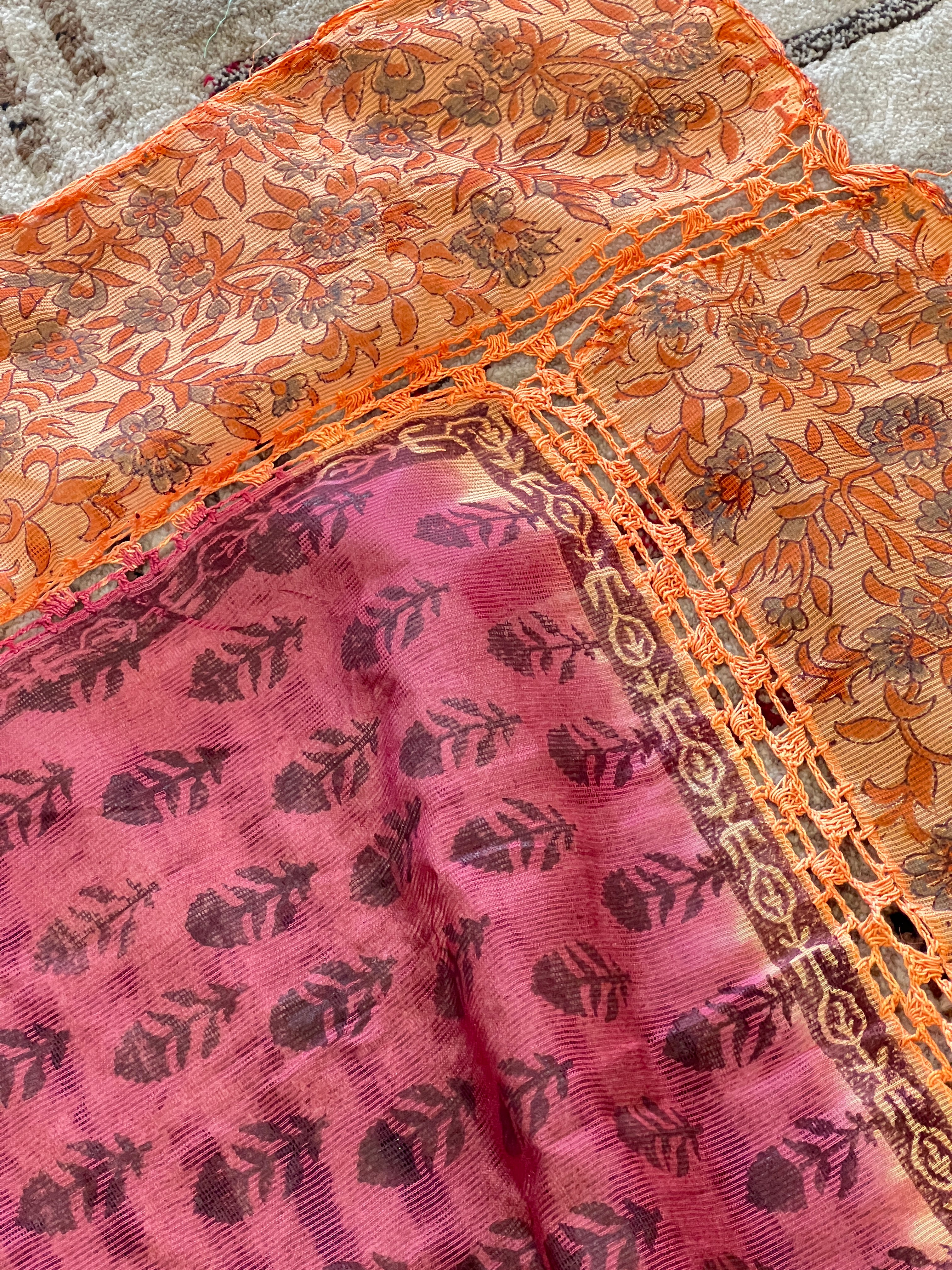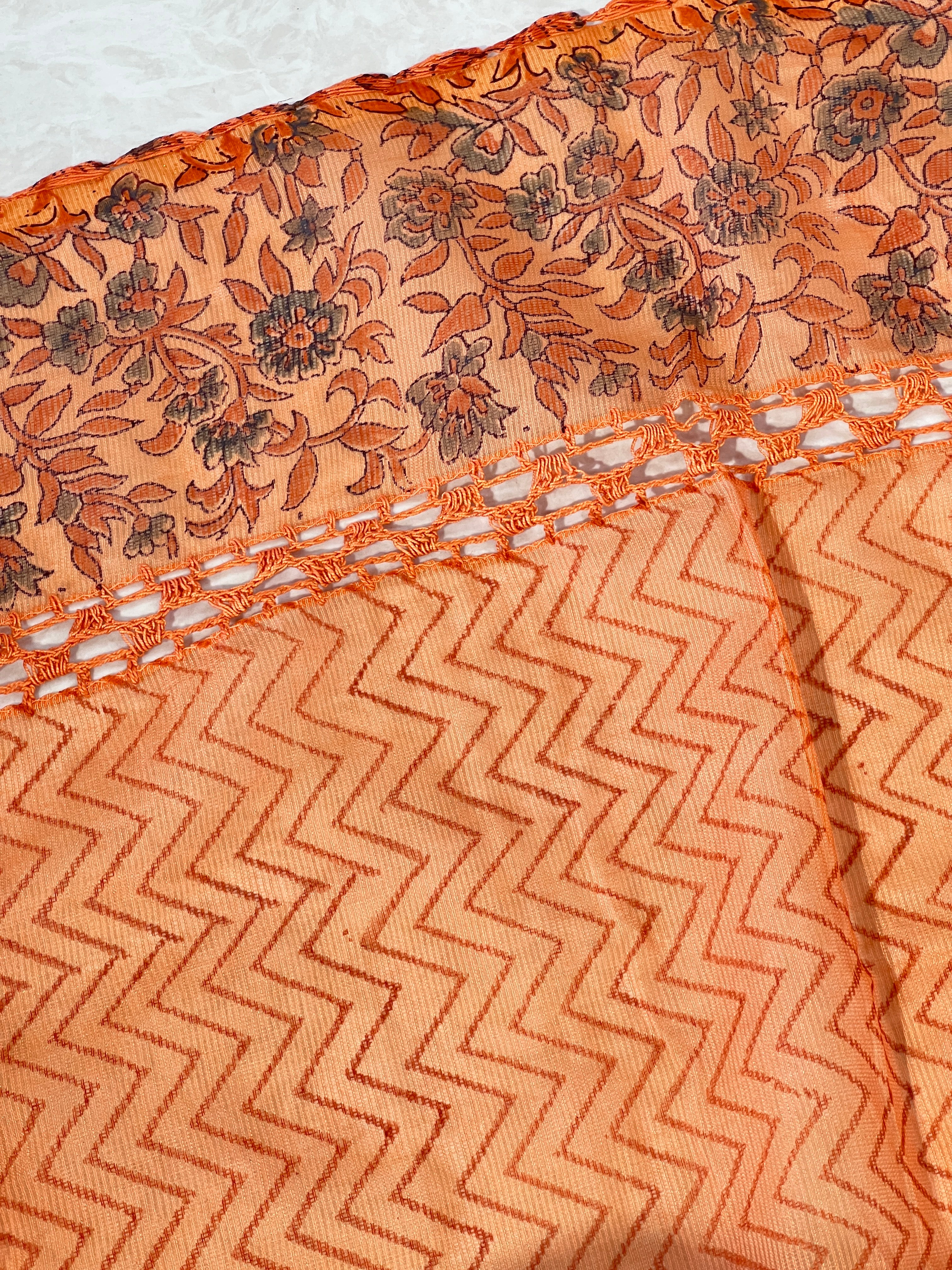 - Style: Block Printed, Crochet Lace Detailing, Contrast Border With Kalamkari Inspired Print, Floral Pattern