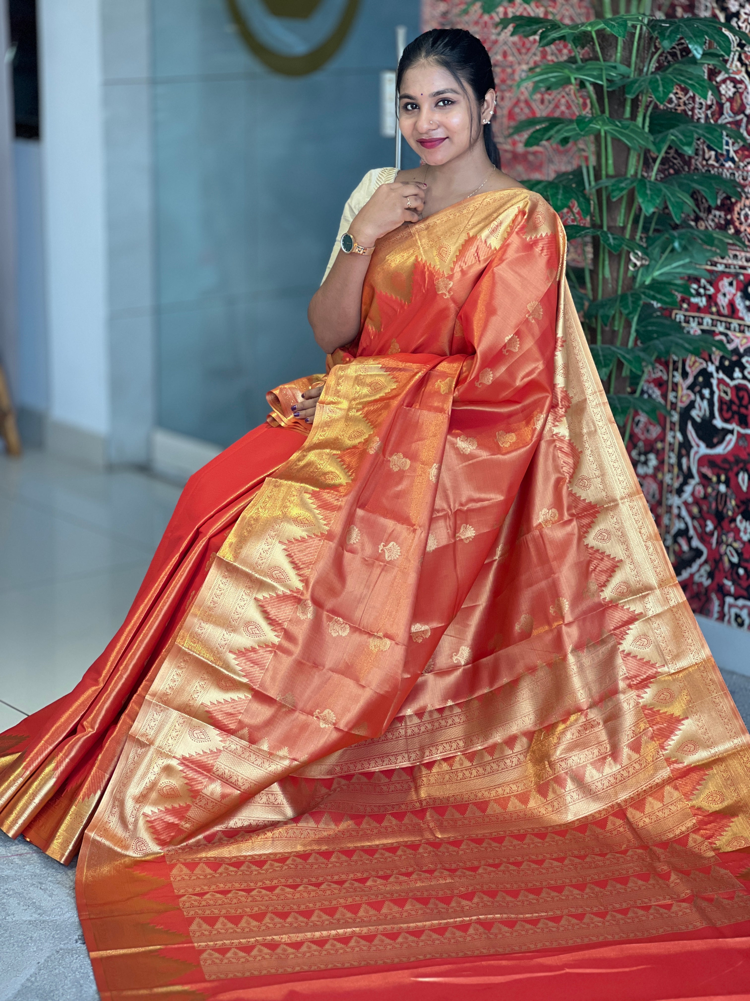 - Style: Scattered Zari Floral Pattern, Tissue Weving, Temple Weaving Pattern Border, Geometric Pattern pallu