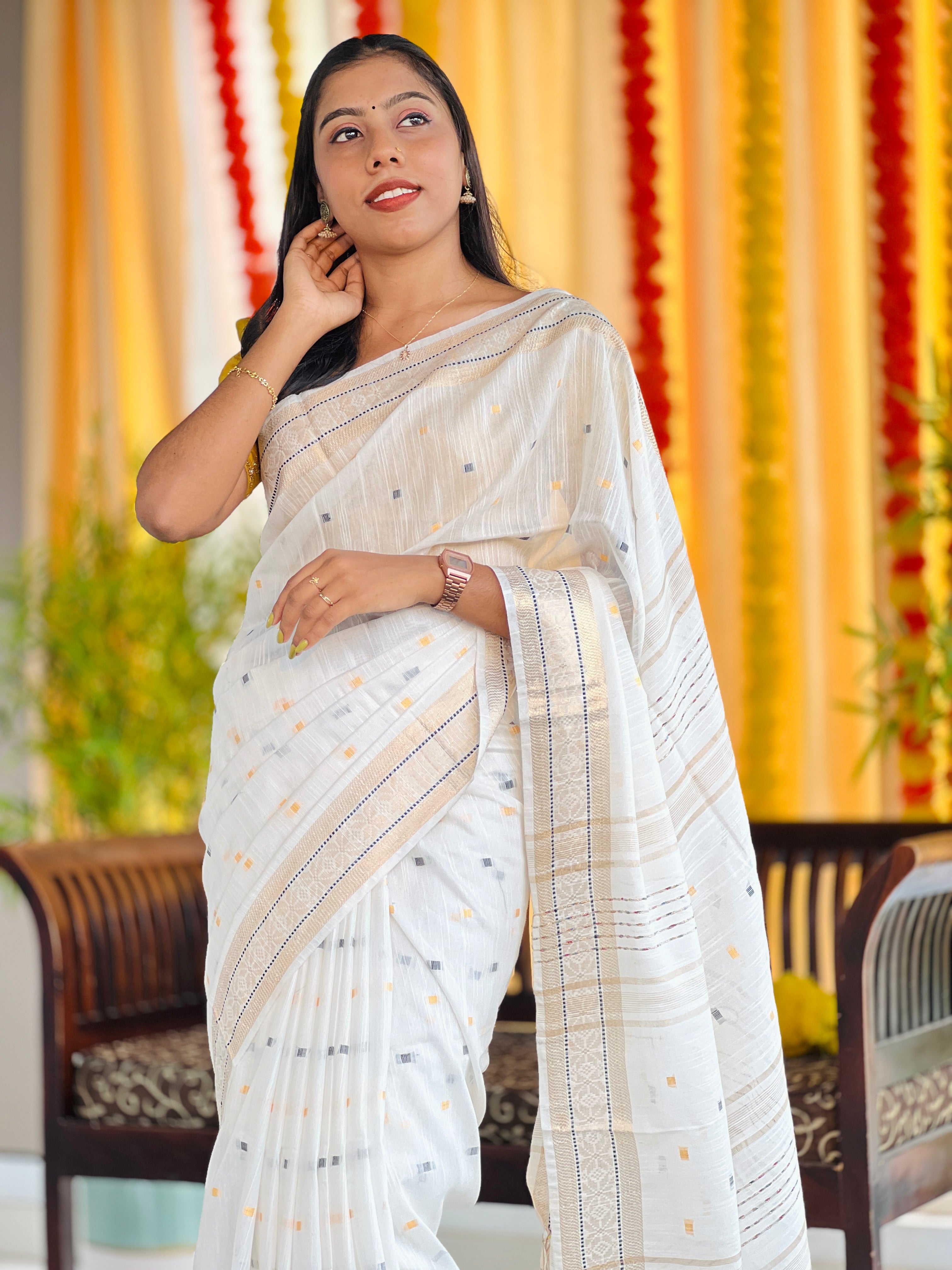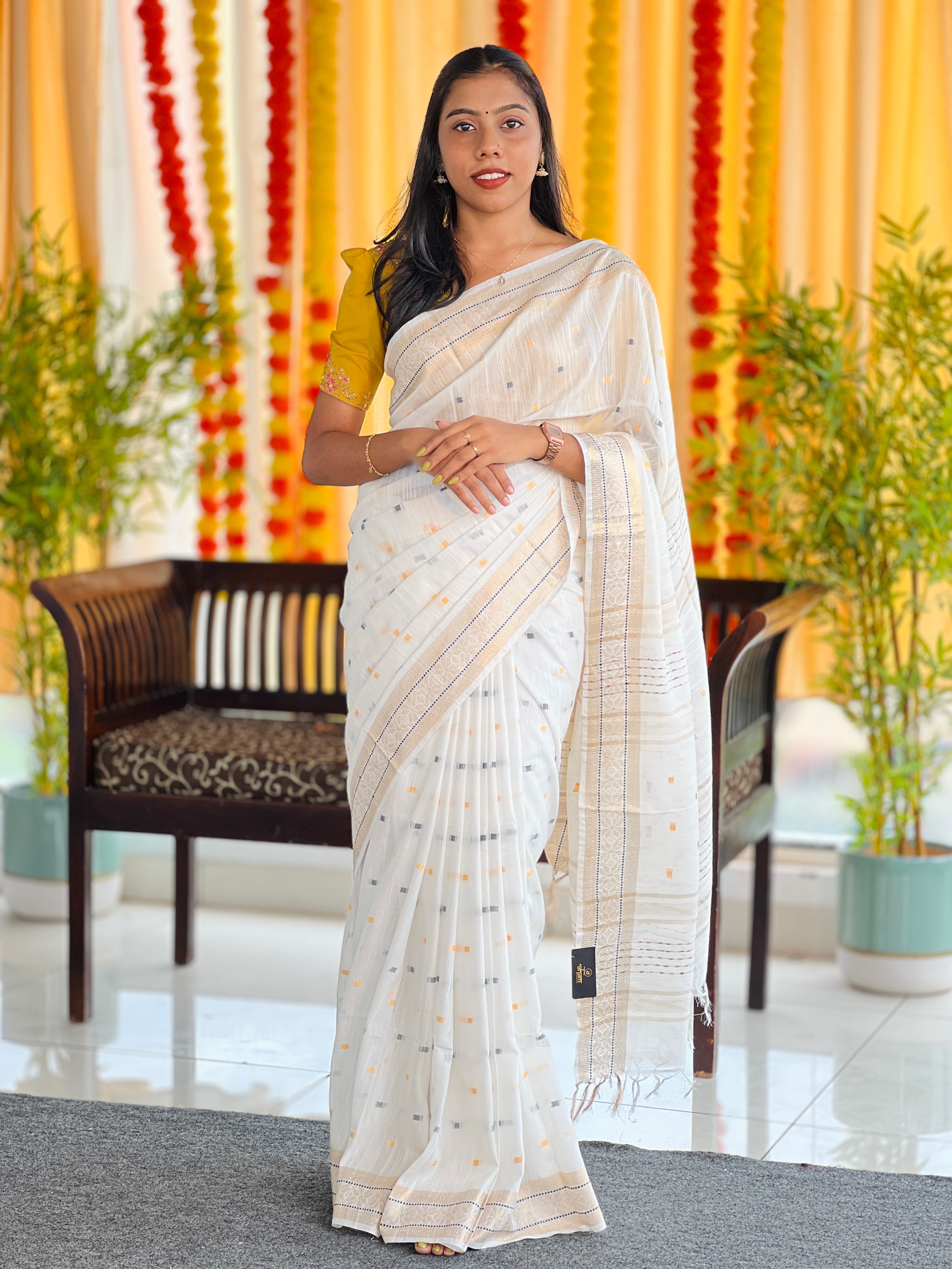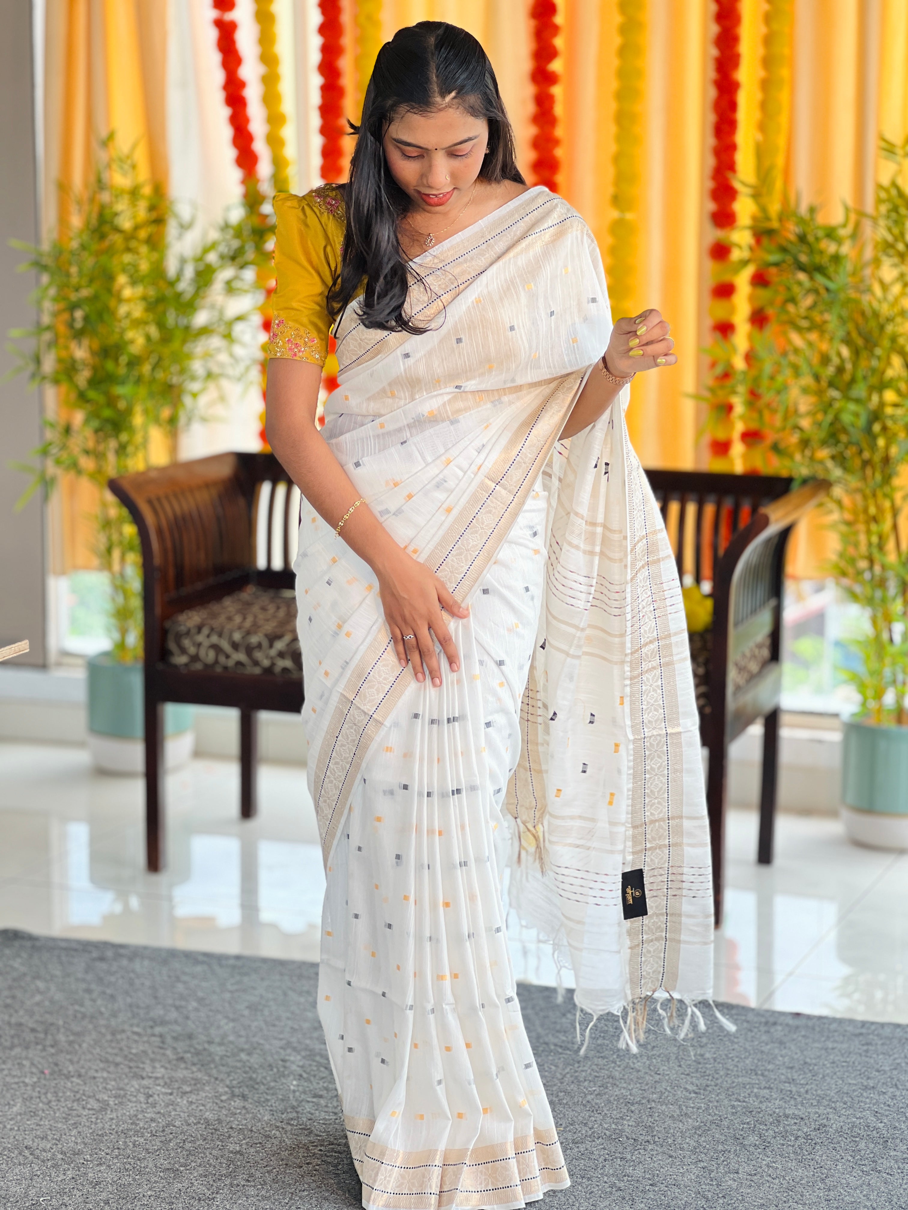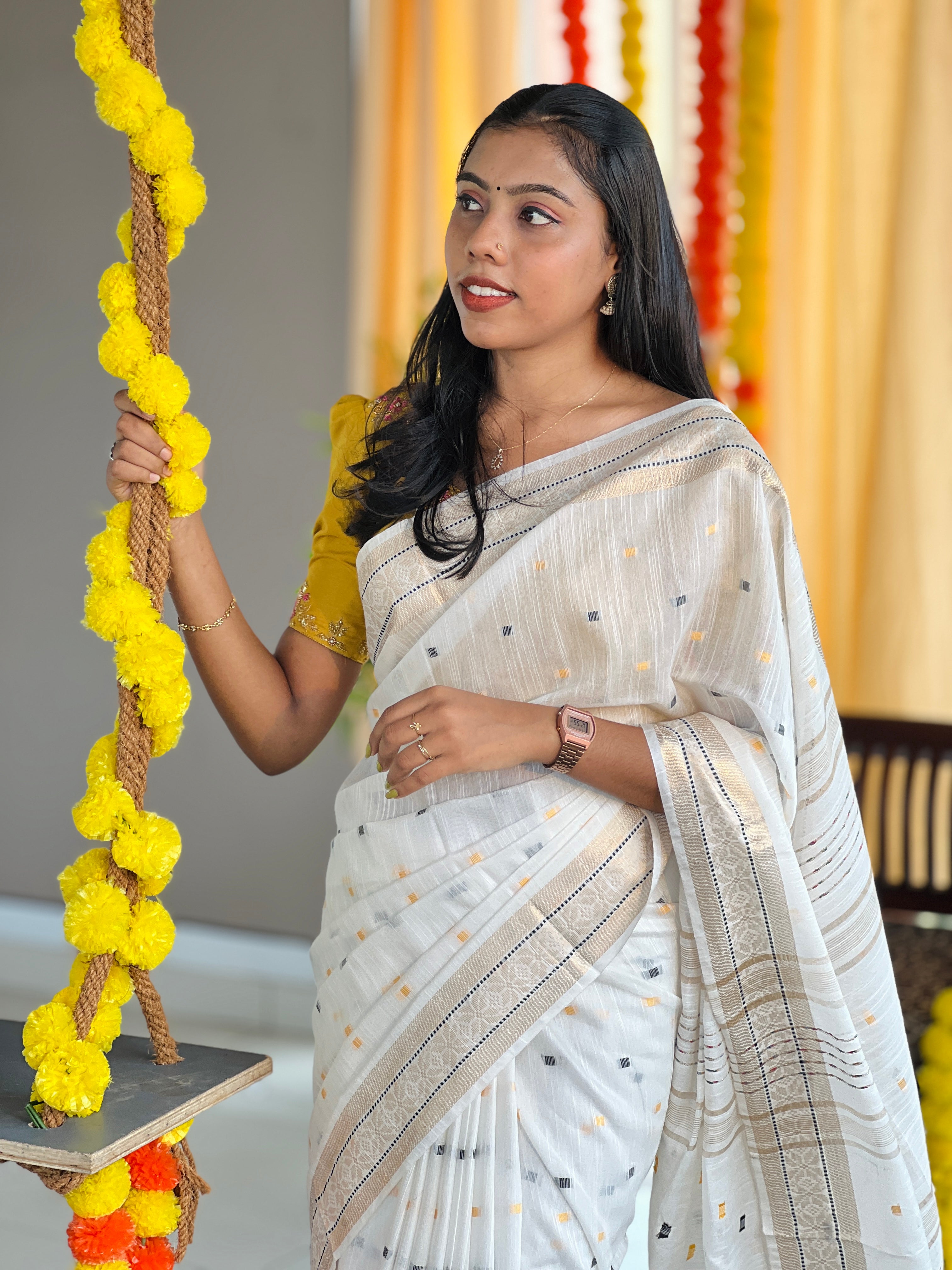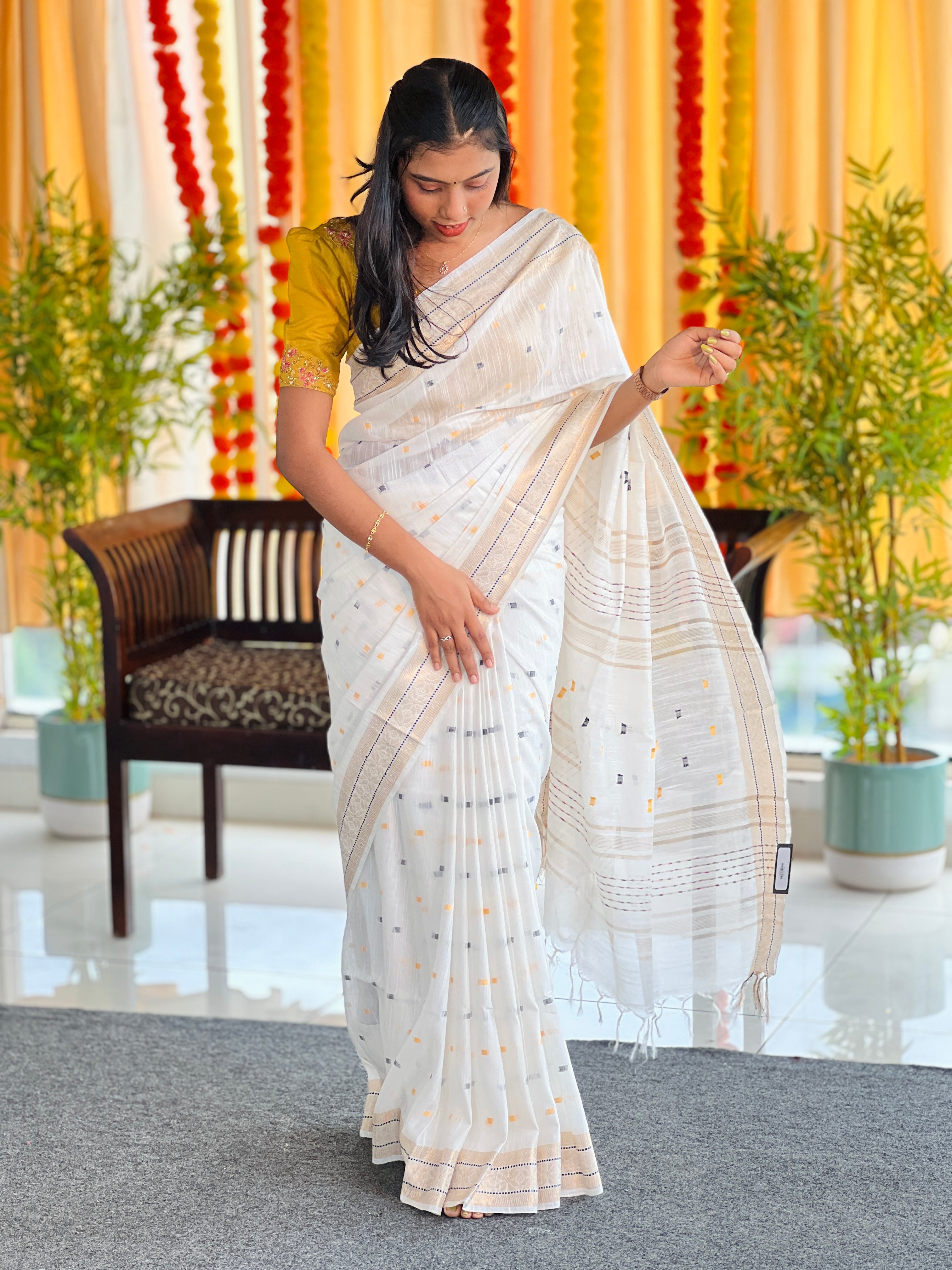 - Style: Thread Buta Weaving Pattern, Zari Floral Border Detailing, Kesiya Weaved Pallu, Tassels Attached