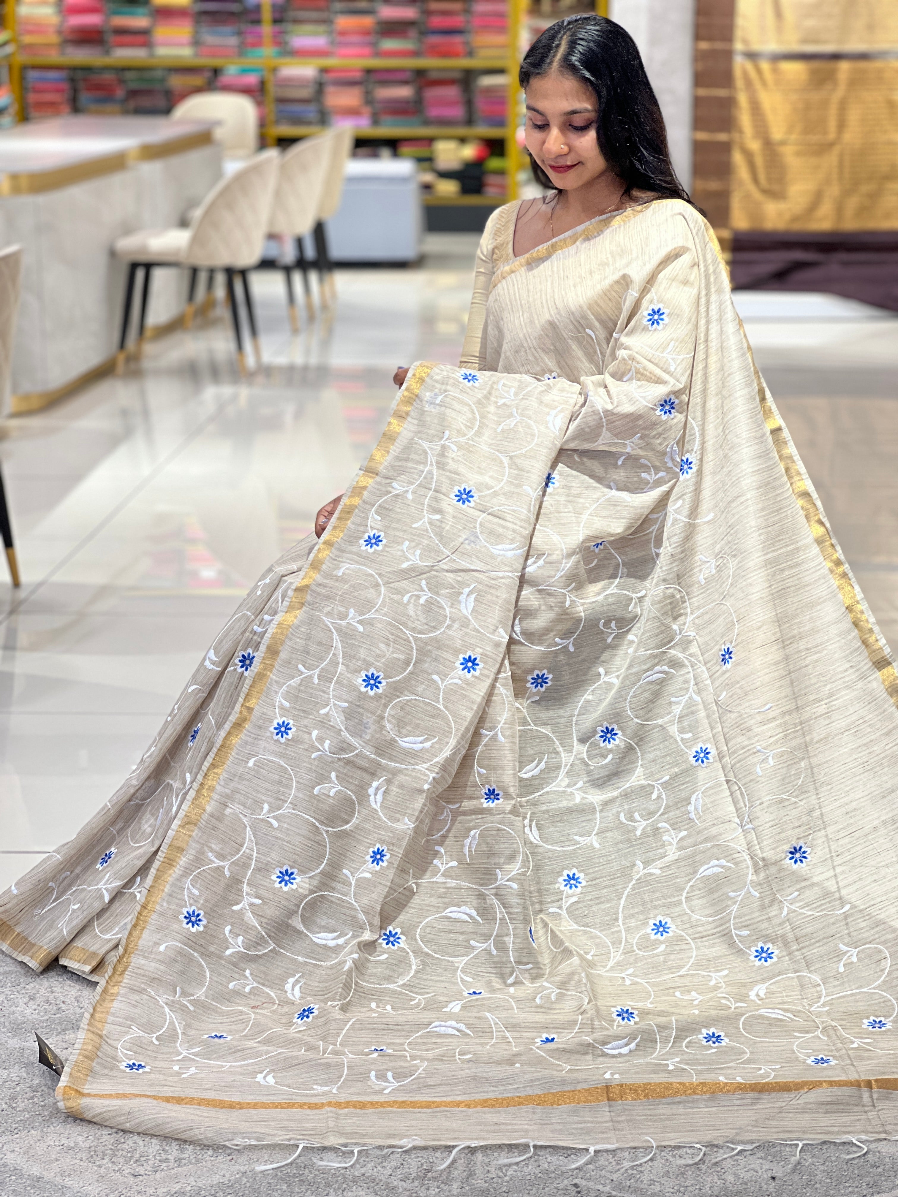 • Style: White Thread Embroidery With Multi-Color Floral Pattern, Golden Zari Borders