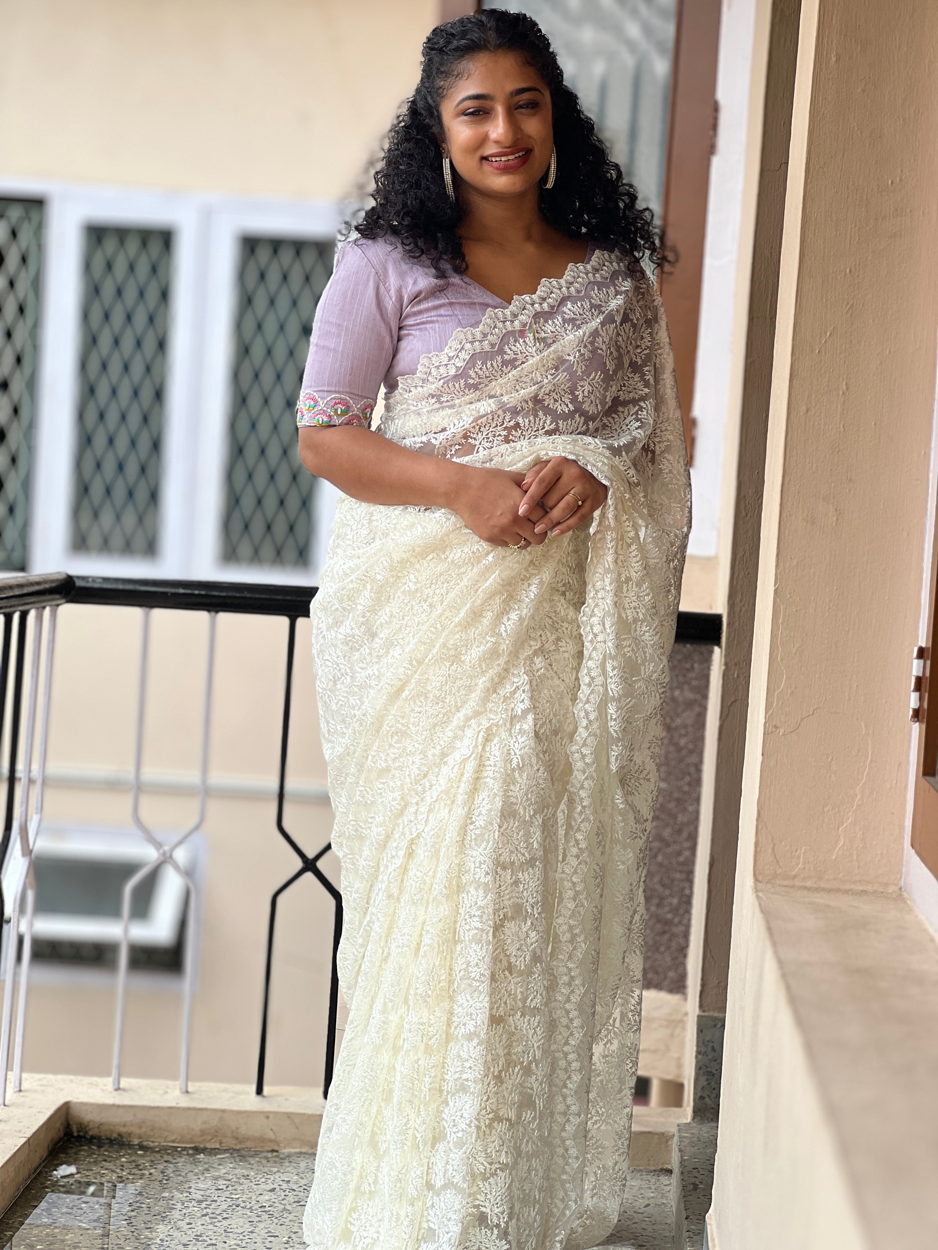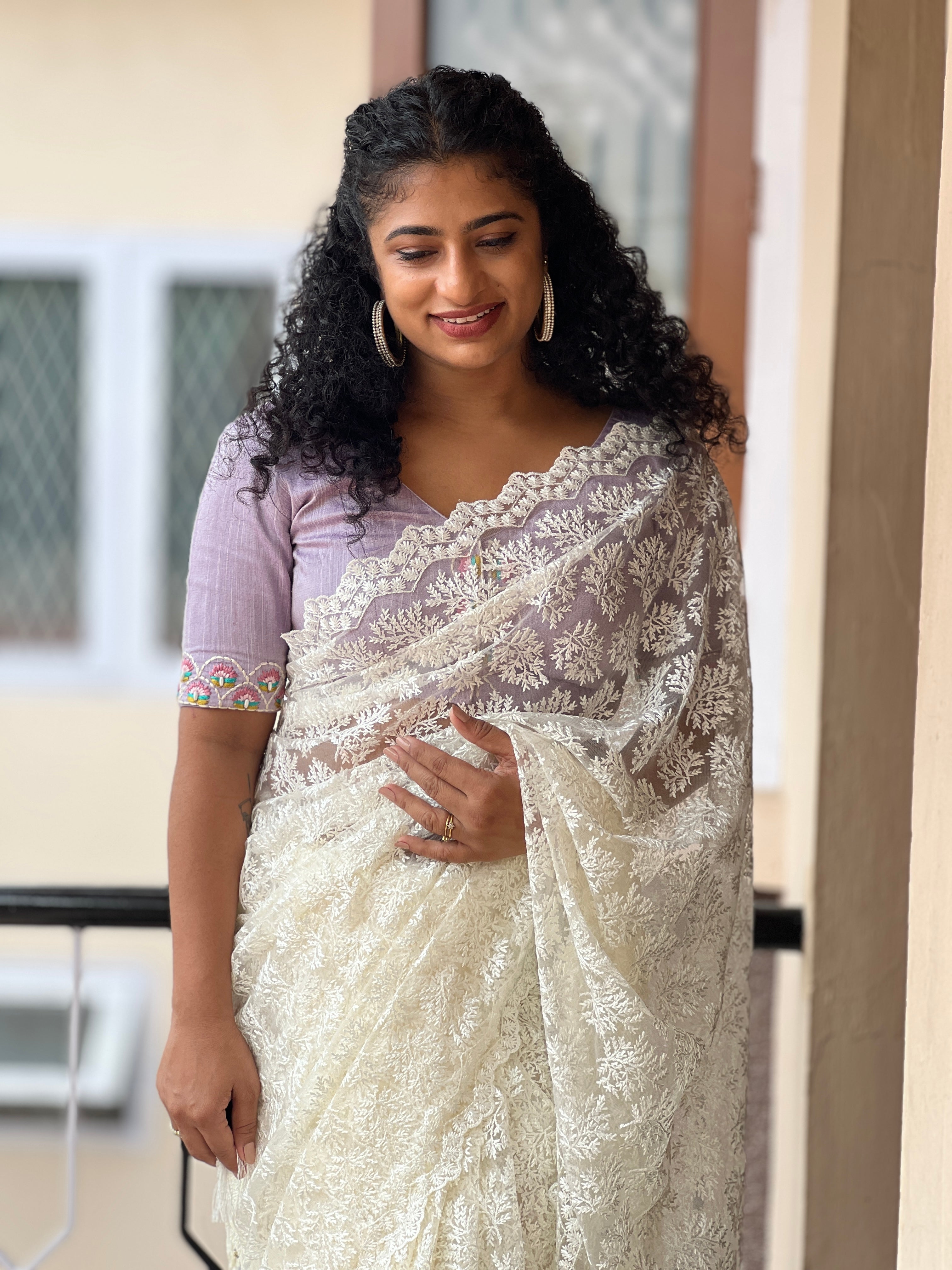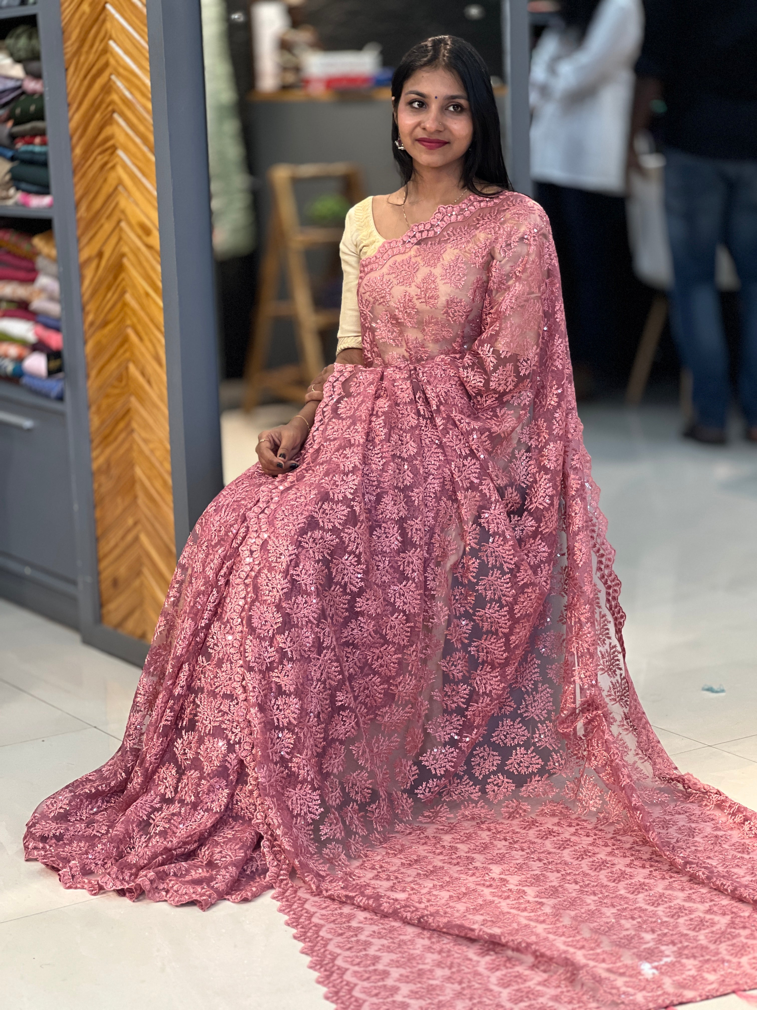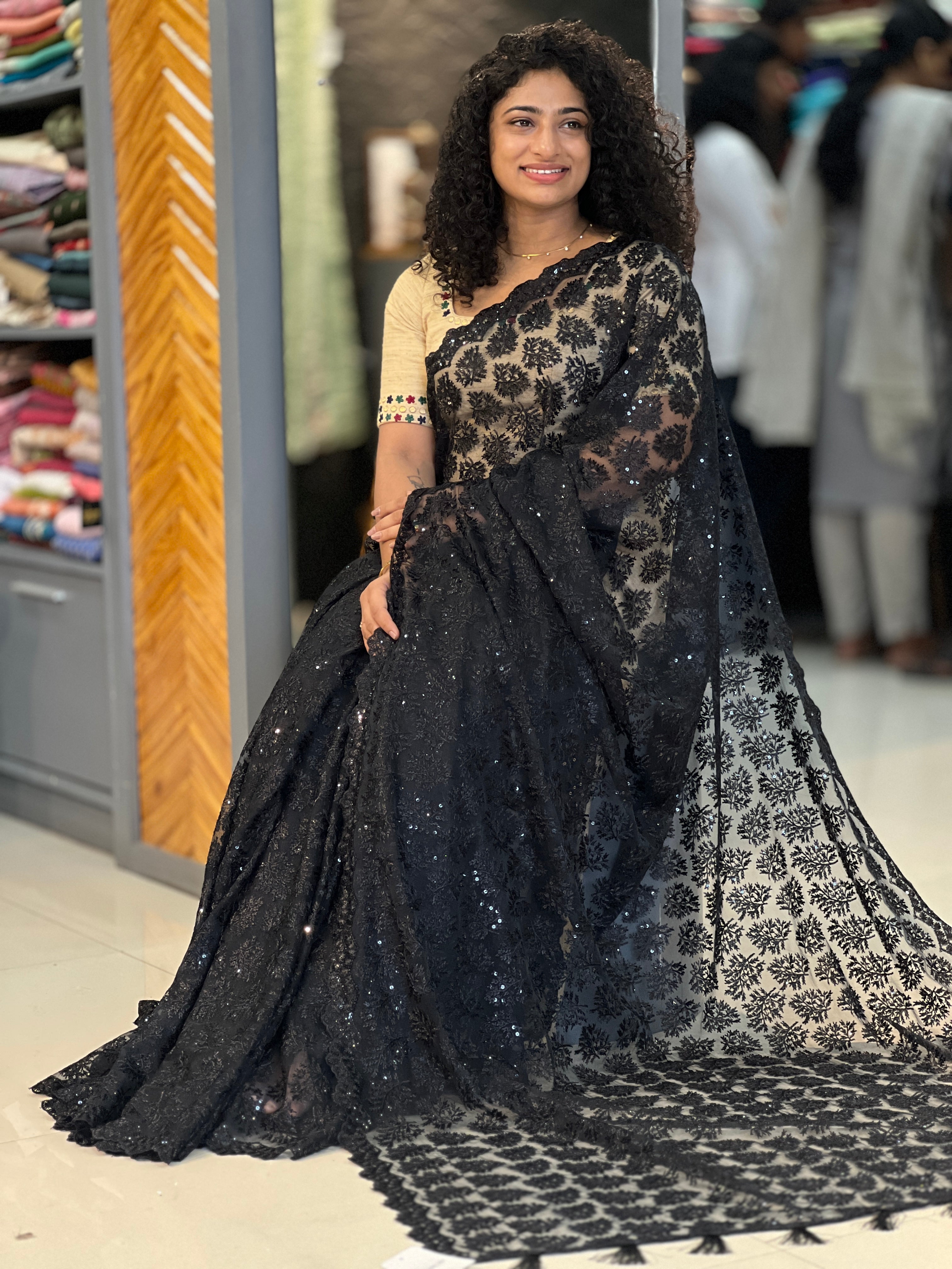 - Style: Leaf Design Thread Embroidery With Sequence Highlight, Lace Pattern, Scallop Detailed Edges, Tassels Attached