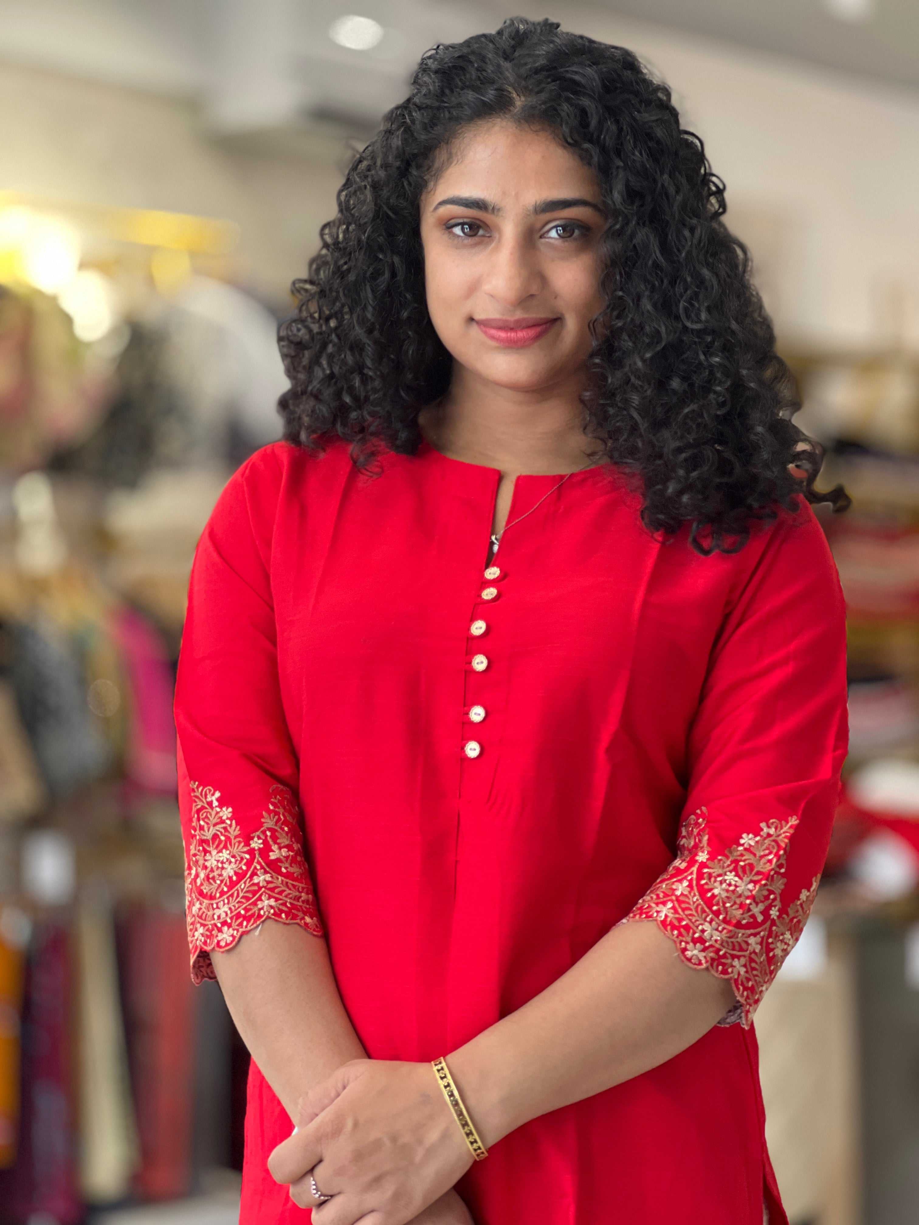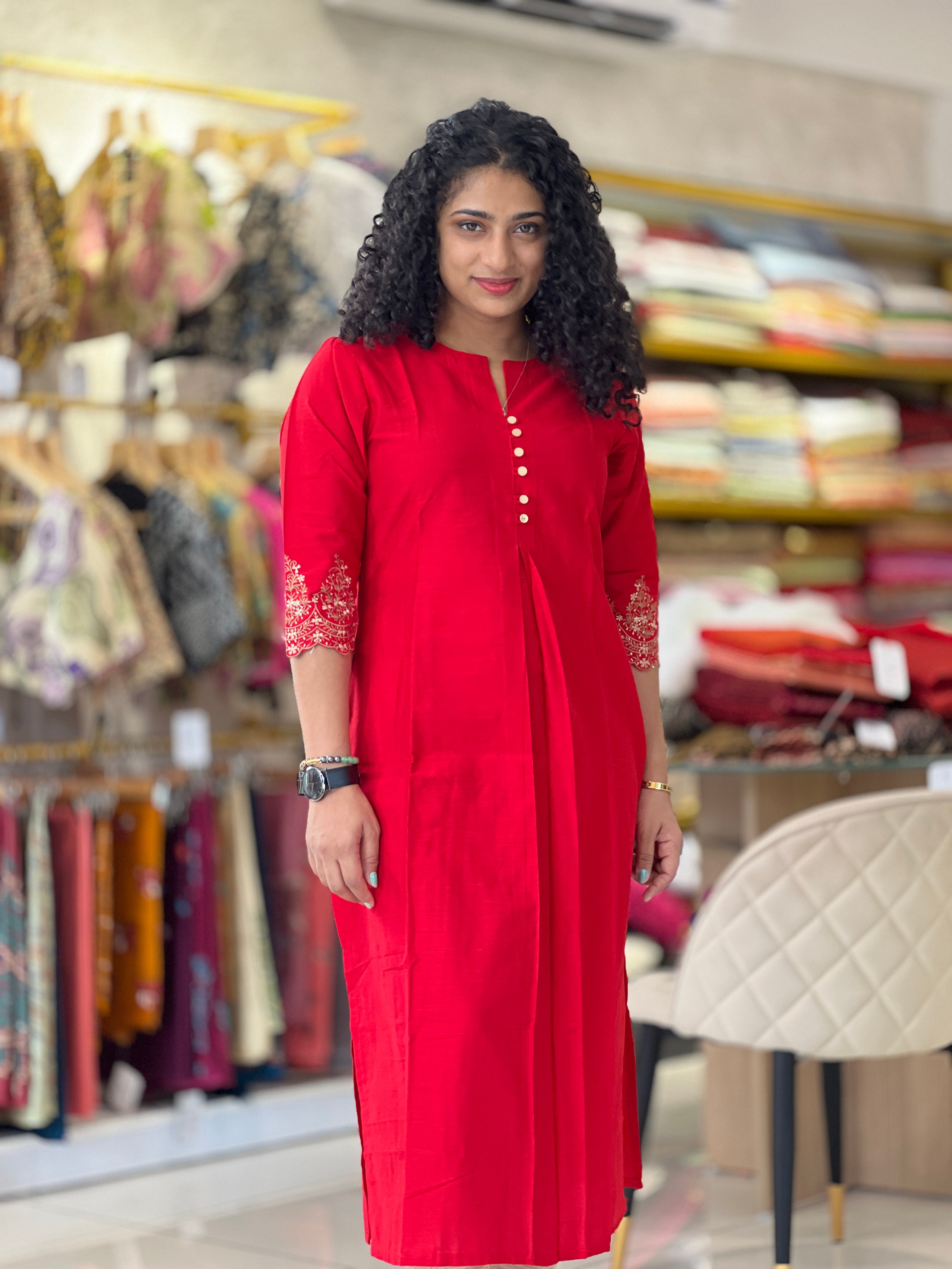 - Style: Thread Embroidery With Scallop Finished Sleeves Hem Portion, Golden Button Detailed Neck Portion, With Box Pleat Look, Side Slitted
