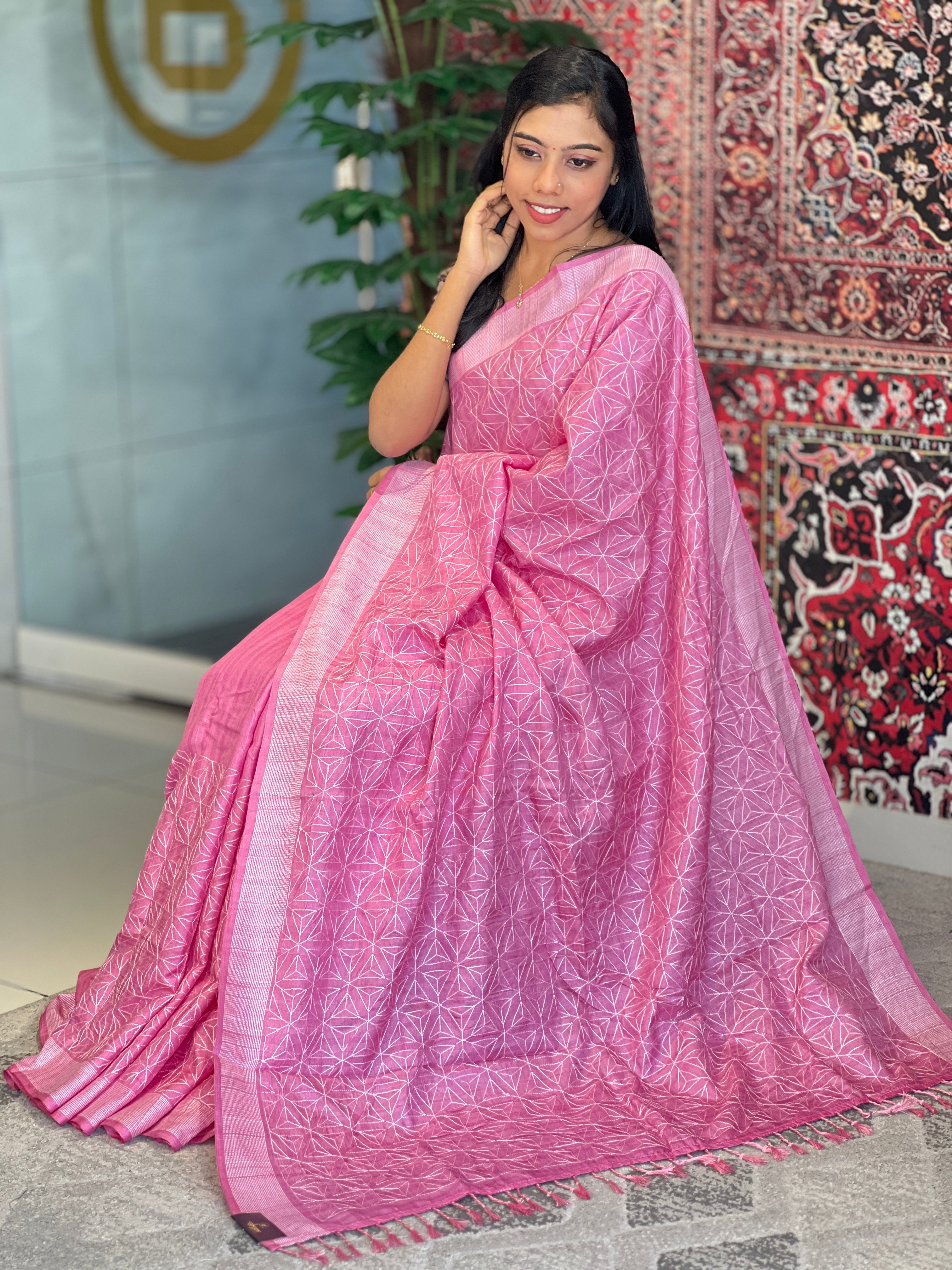• Thread Embroidery Geometric Patterned Semi Tussar Saree | SUN281
