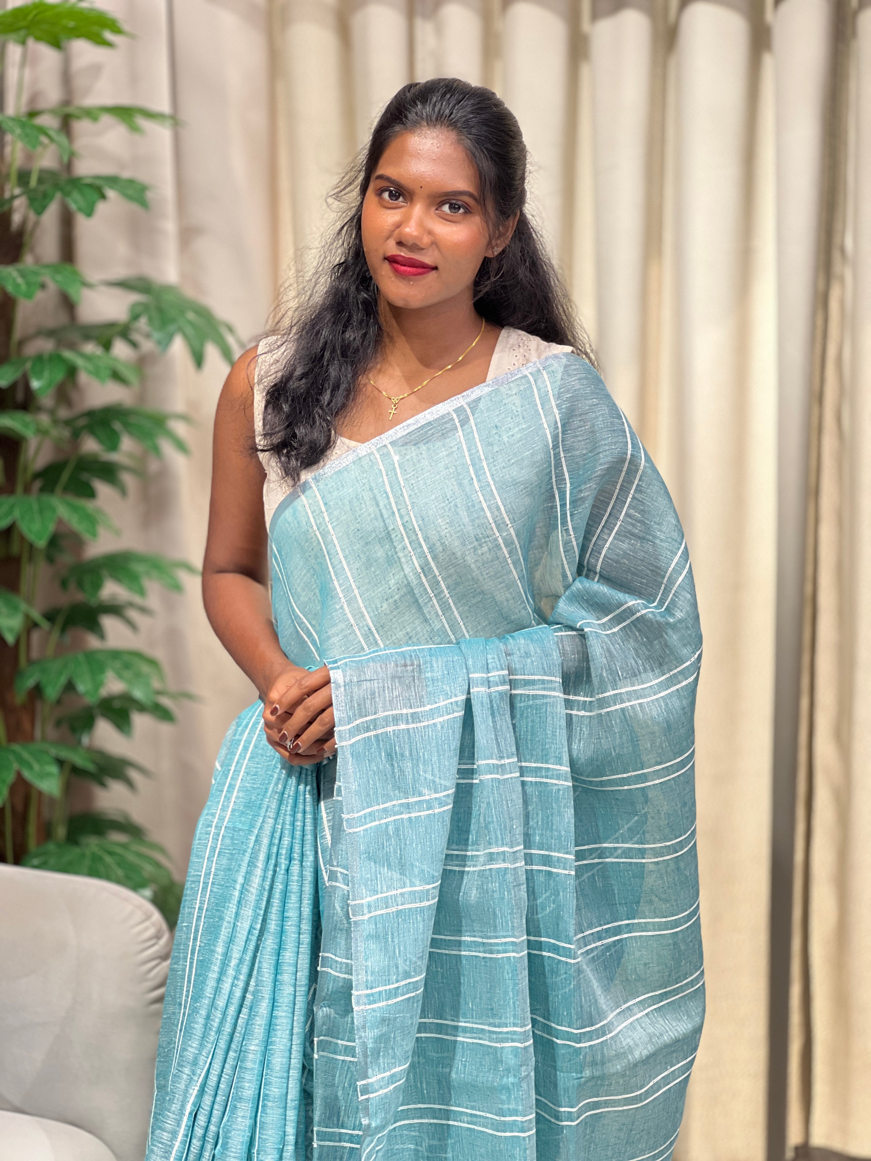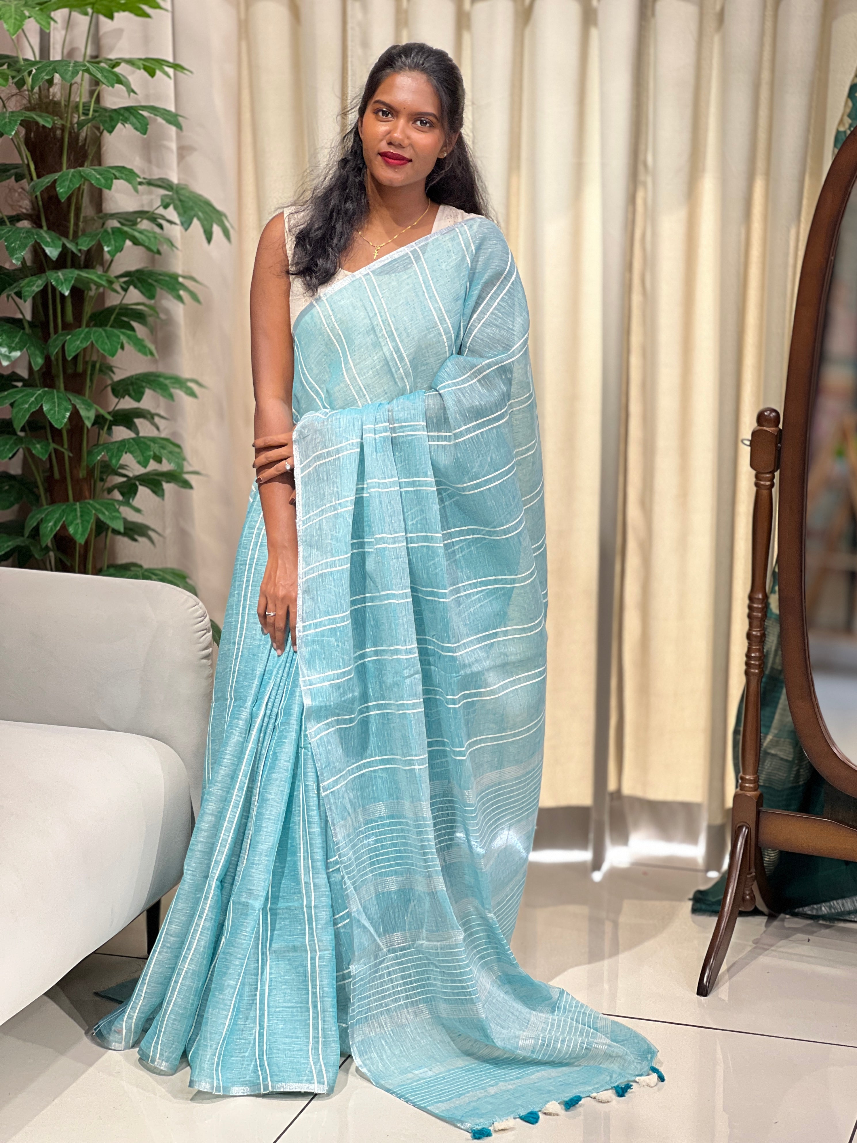 - Style: Thread Stripes Detailing With Sequins Highlight, Zari Border, Tassels Attached