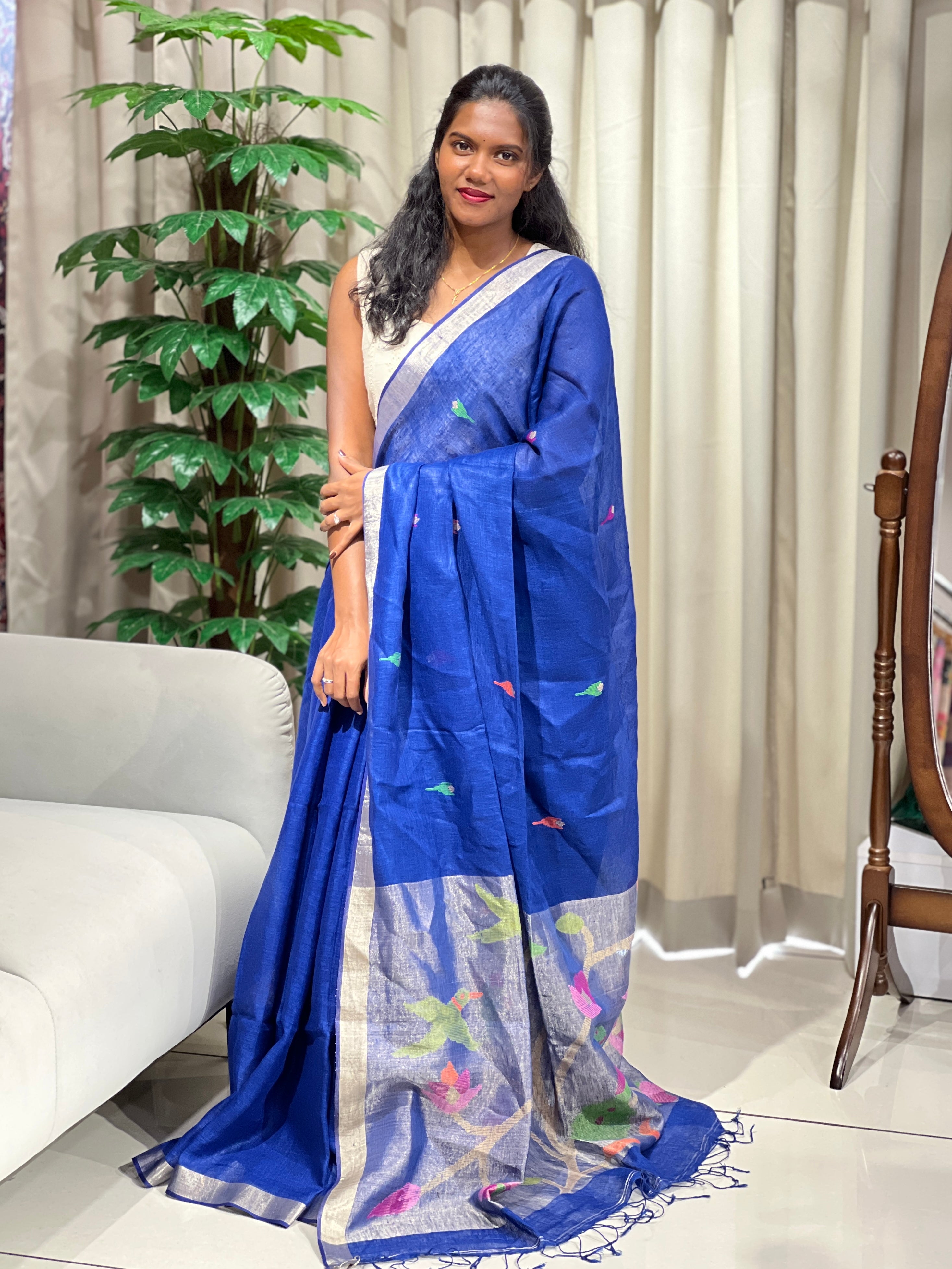 • Style: Thread Weaving, Scattered Buttas, Jamdani Weaved Pallu, Zari Border, Tassels Attached