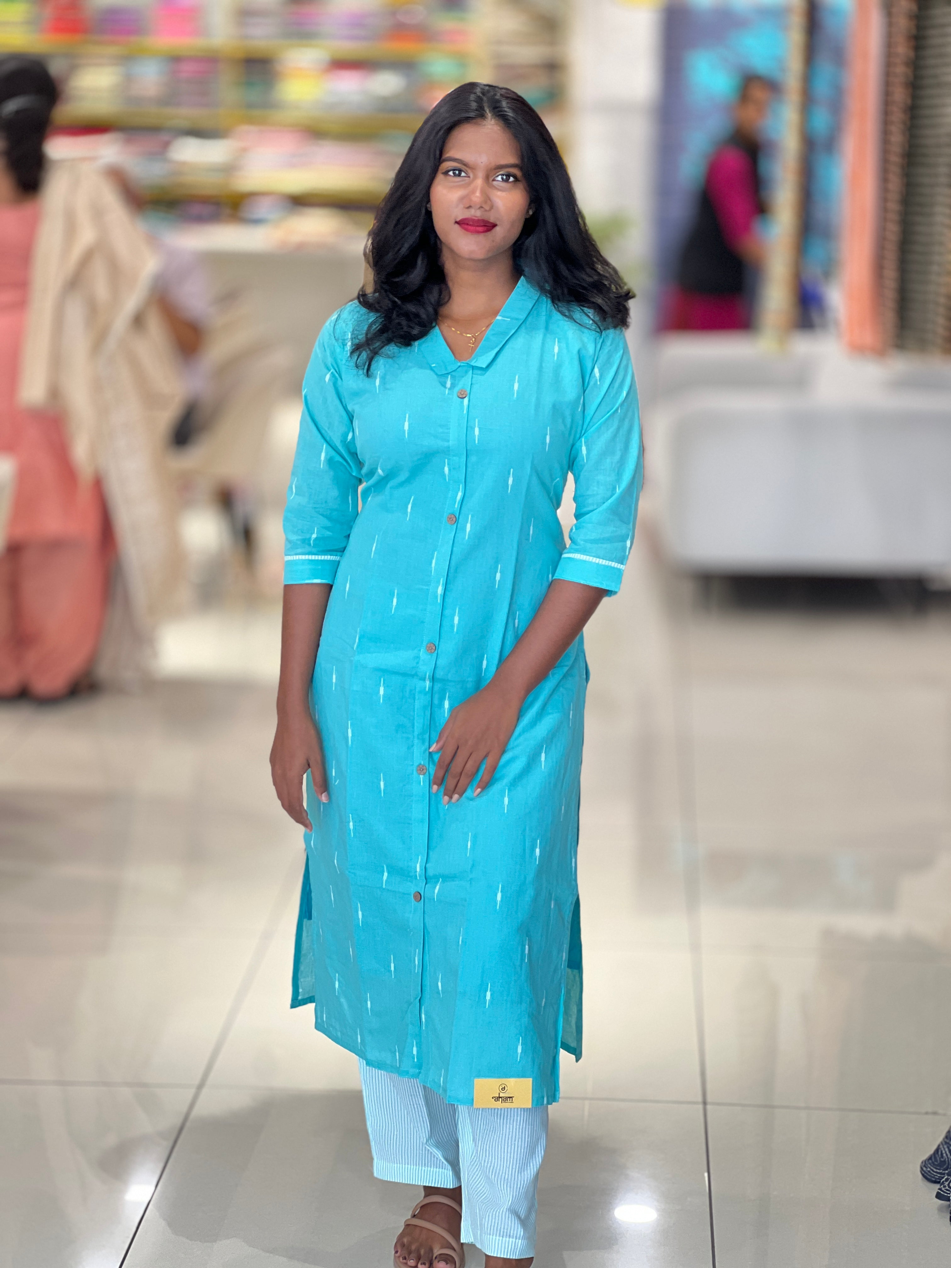 • Style: Ikat Inspired Thread Weaving, Button Detailing, Slited, Cotton Lining