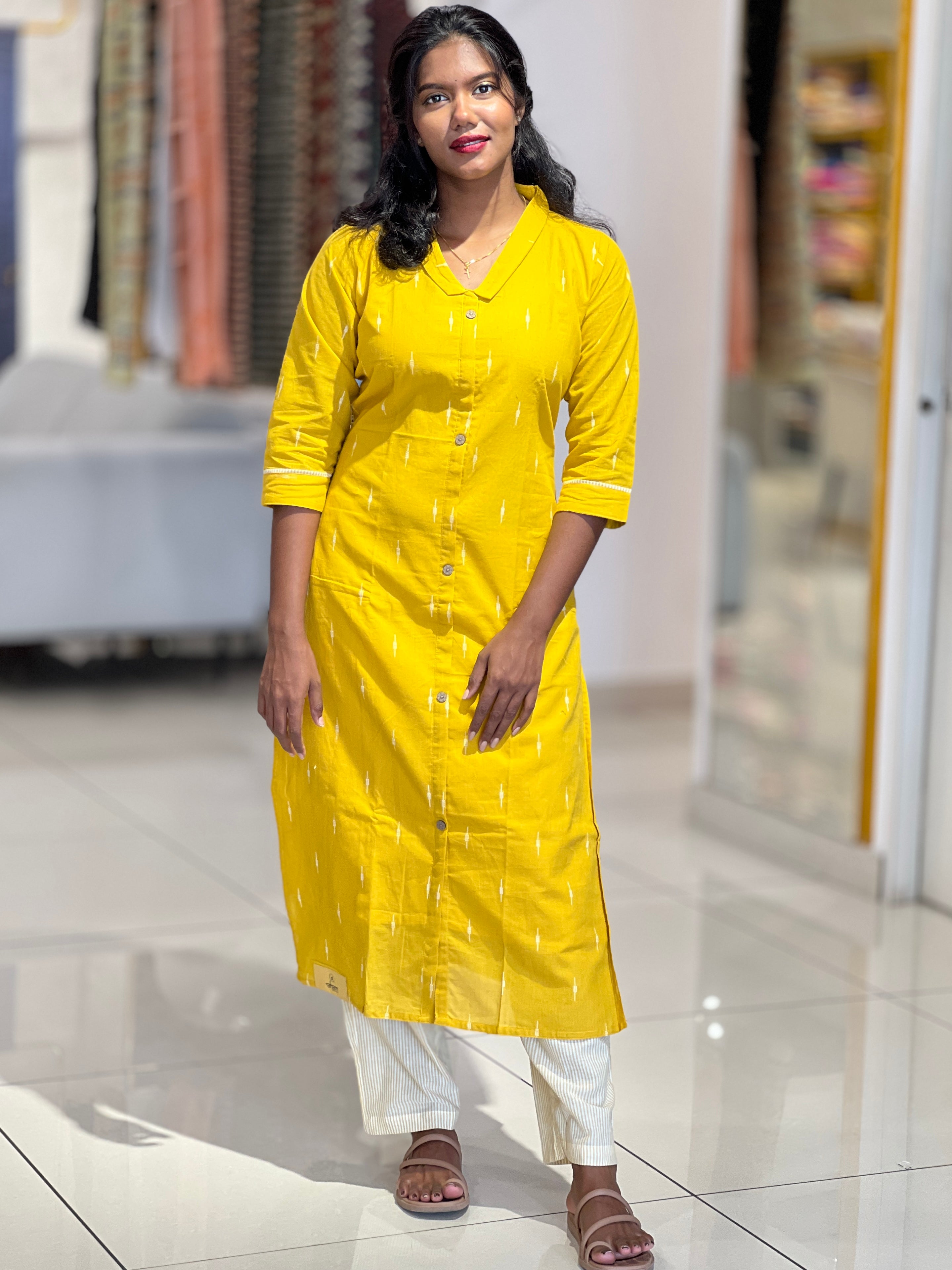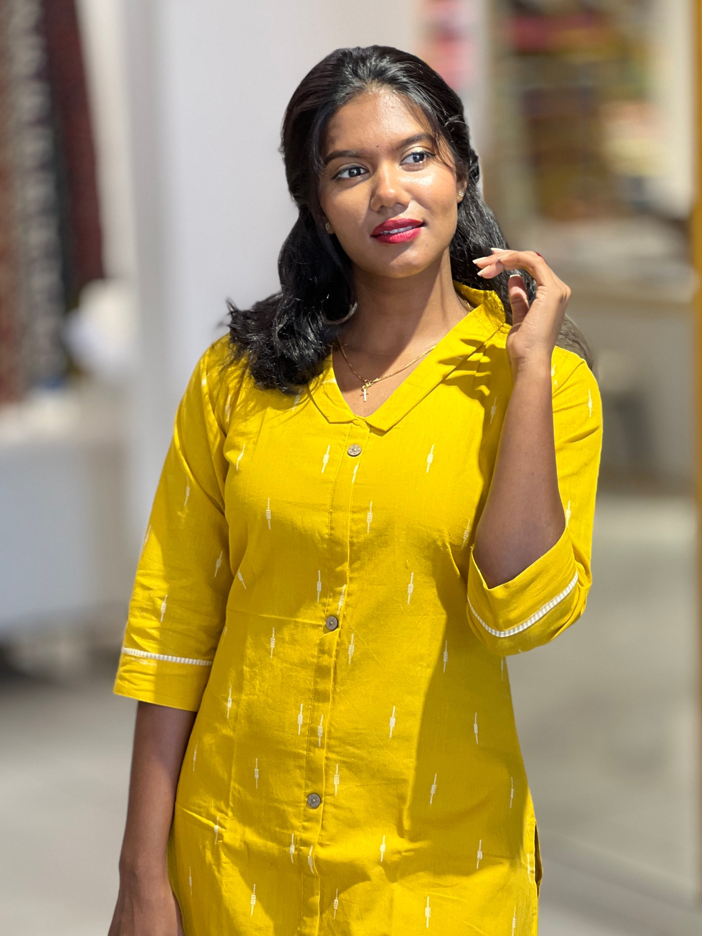 - Style: Ikat Inspired Thread Weaving, Button Detailing, Slited, Cotton Lining