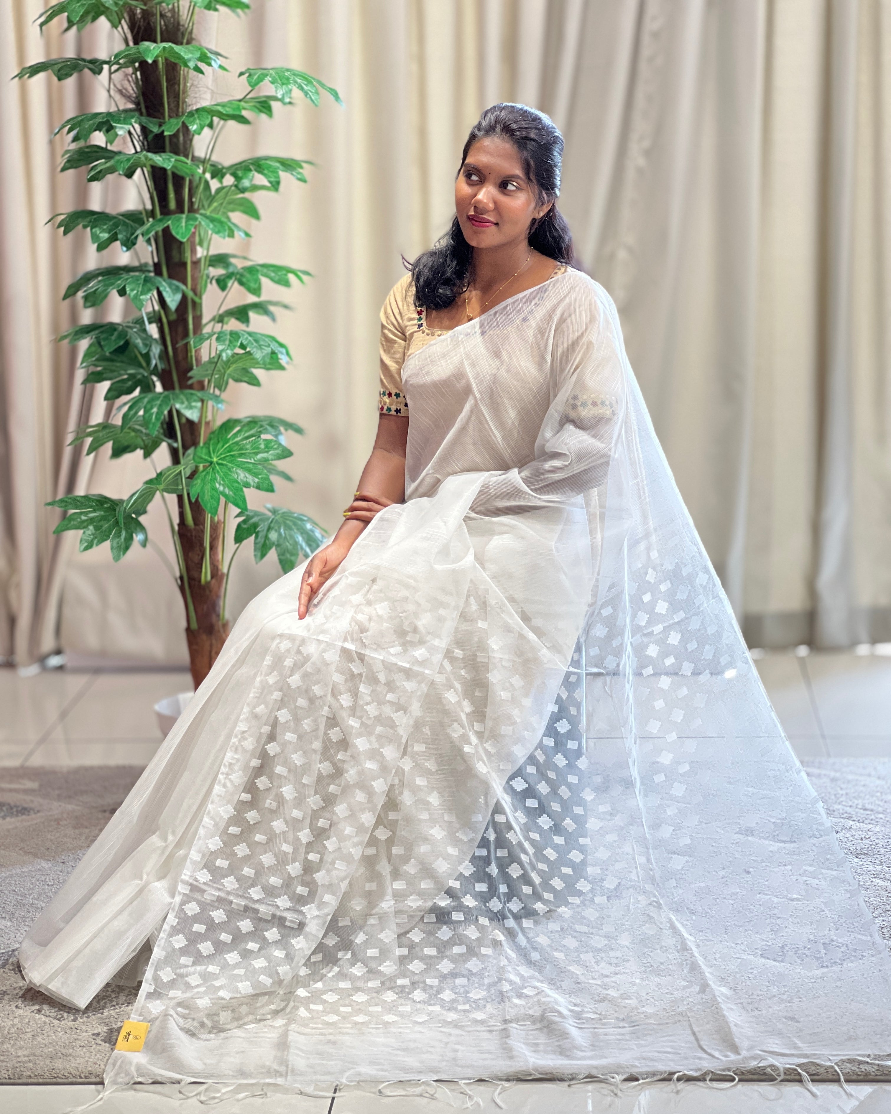 - Style: Self Stripe Patterned Body, Self Thread Weaved Organza Finished Pallu Portion, Geometric Pattern