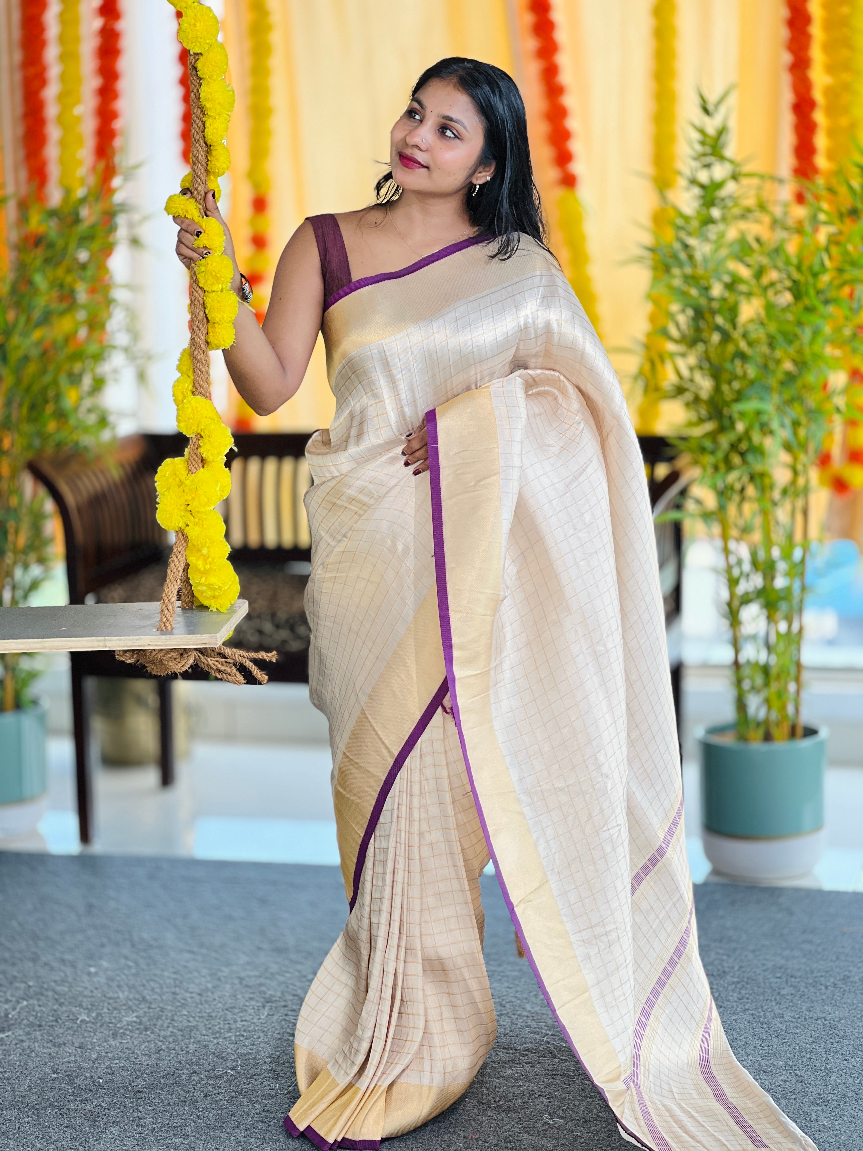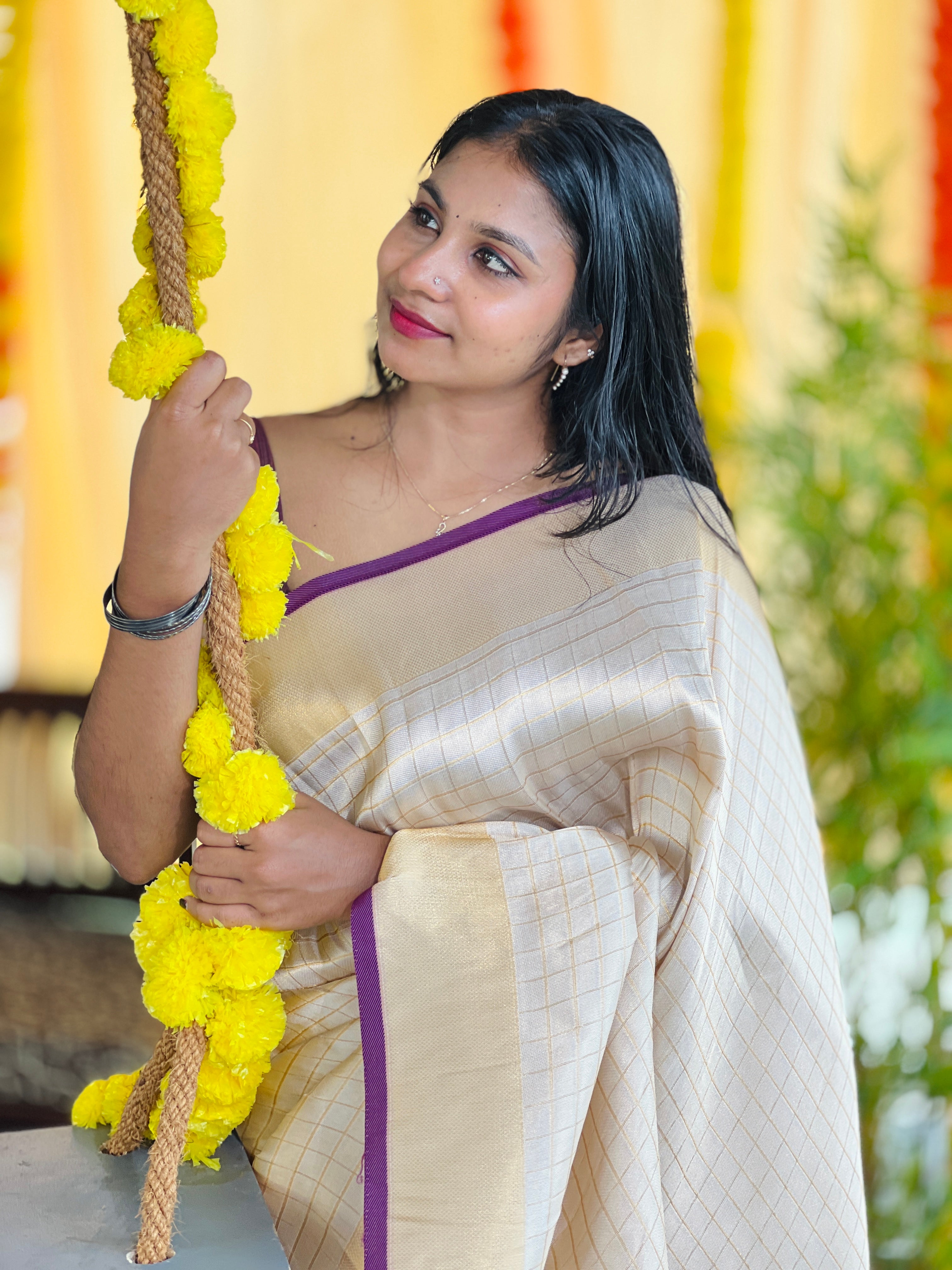 - Style: Tissue Weaving, Check Pattern, Thread and Zari Stripes Detailing on Pallu, Zari Border with Kara Detailing