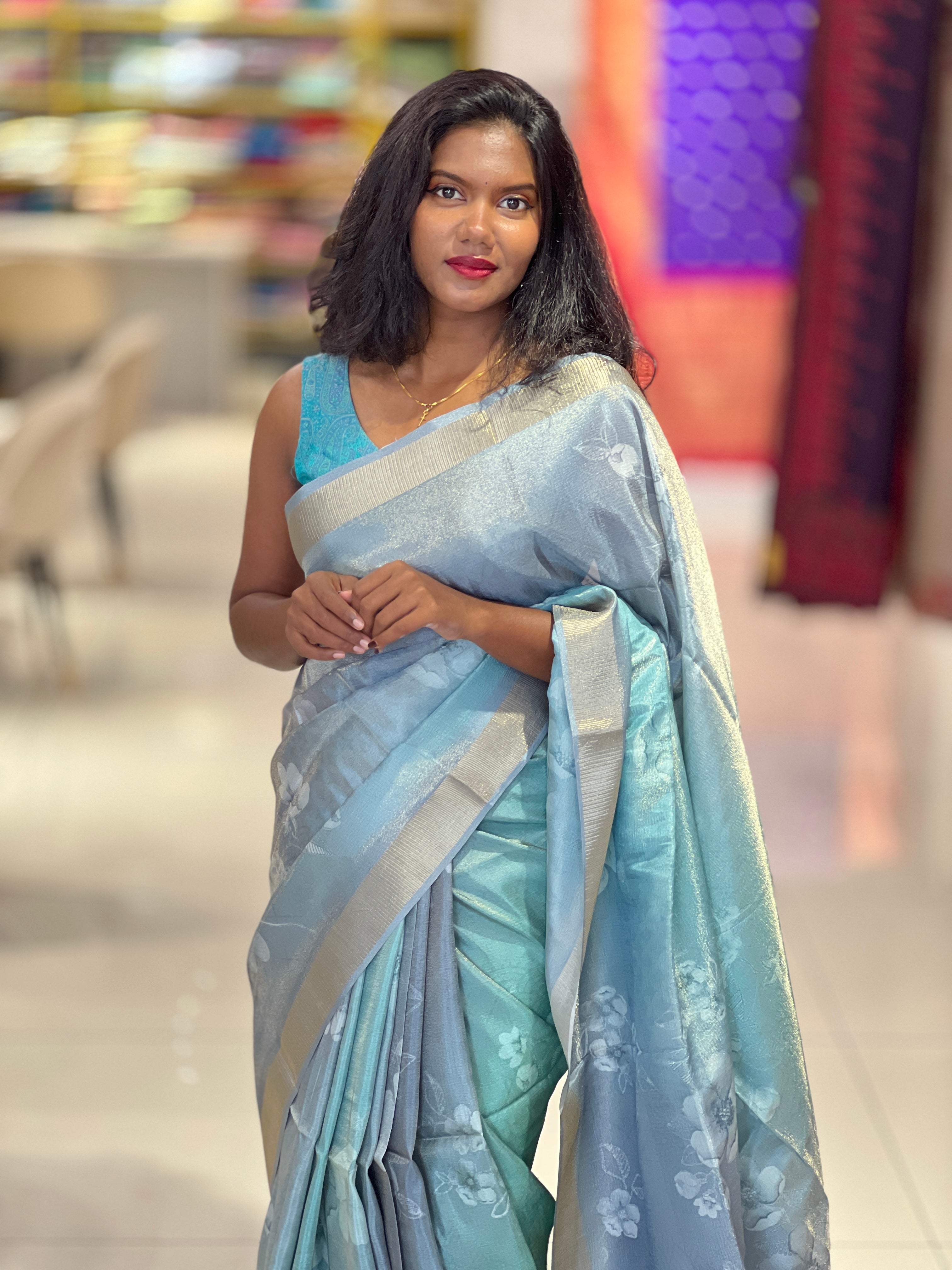 - Style: Tissue Weaving, Sublimation Print, Floral Pattern, Zari Waeved Pallu and Border, Tassels Attached