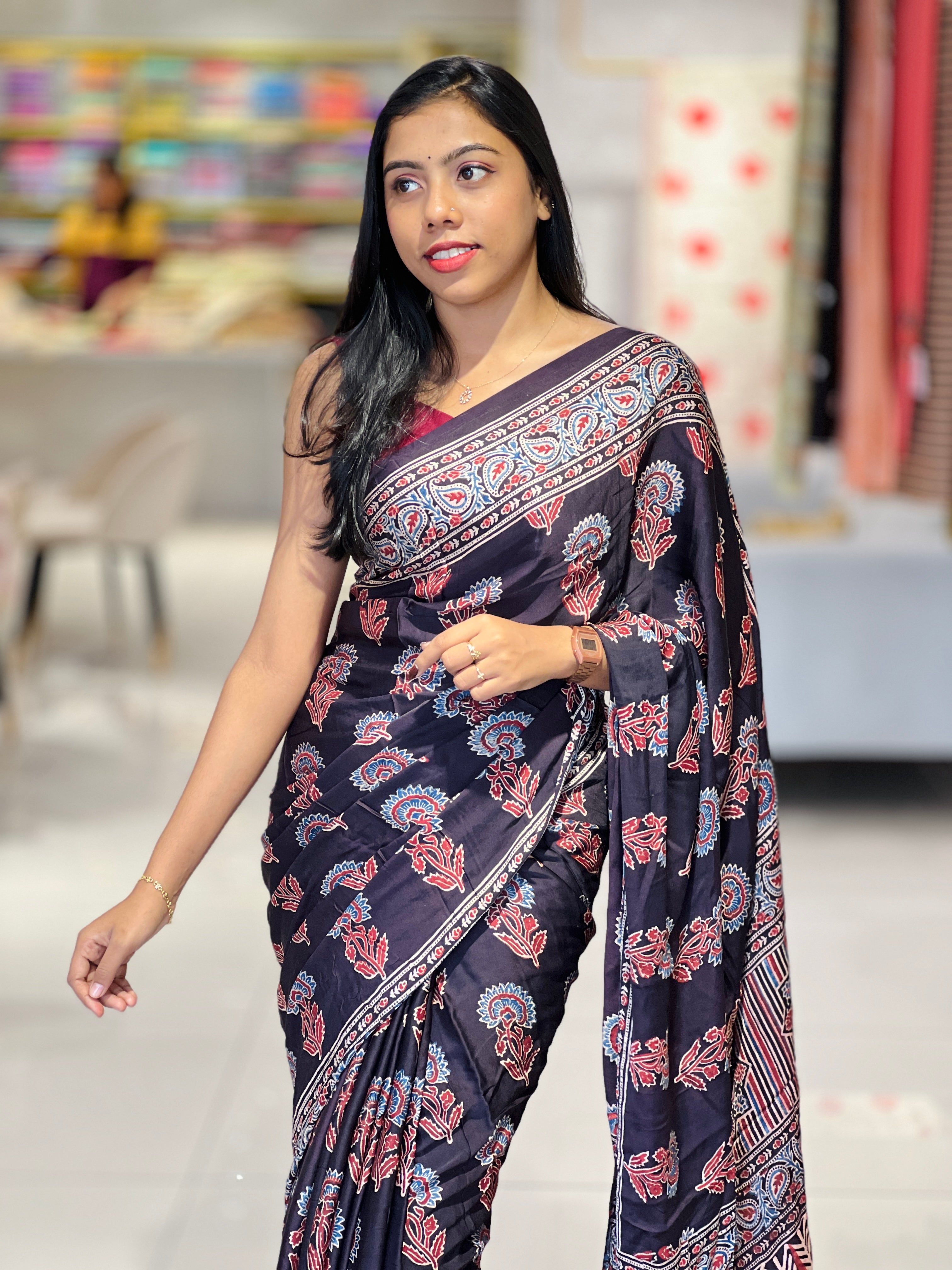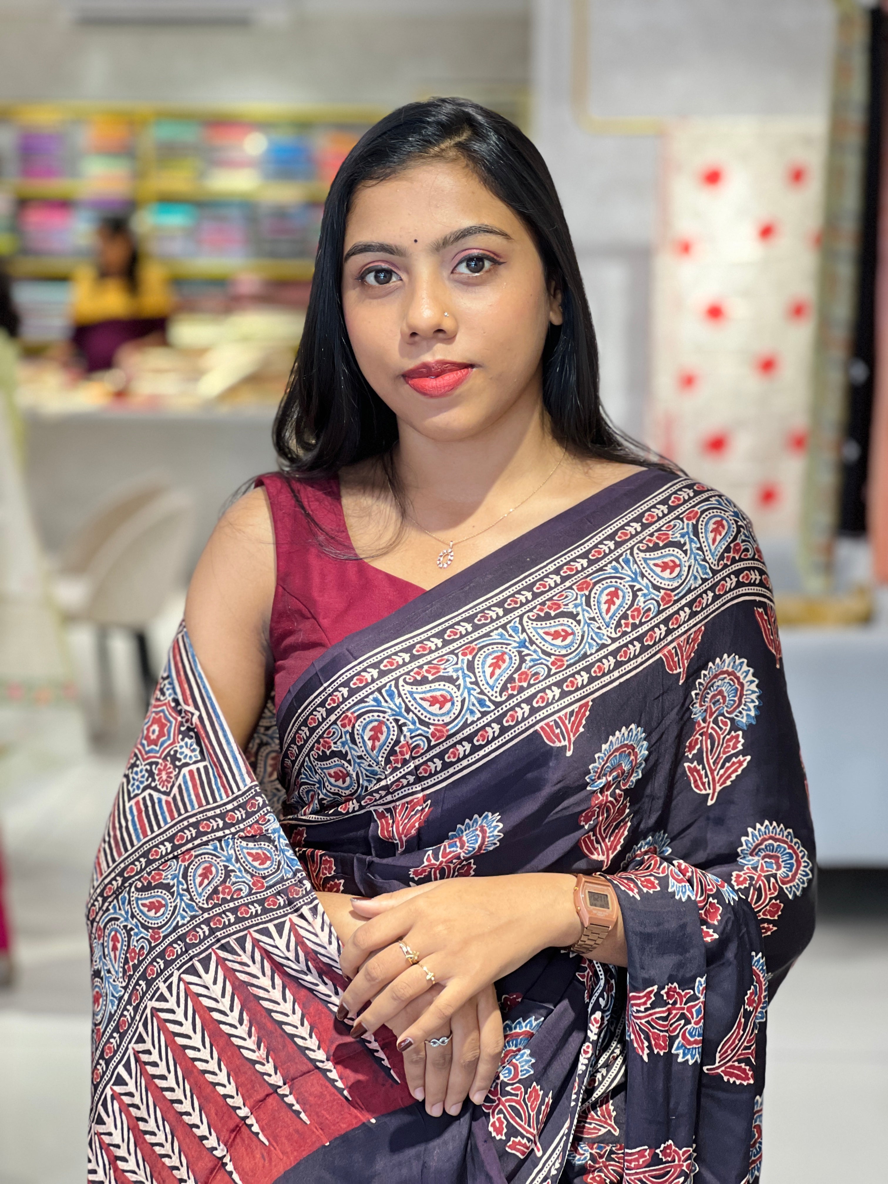 - Style: Traditional Print Pattern, Paisley Detailed Borders, Pure Ajrakh Patterned Pallu