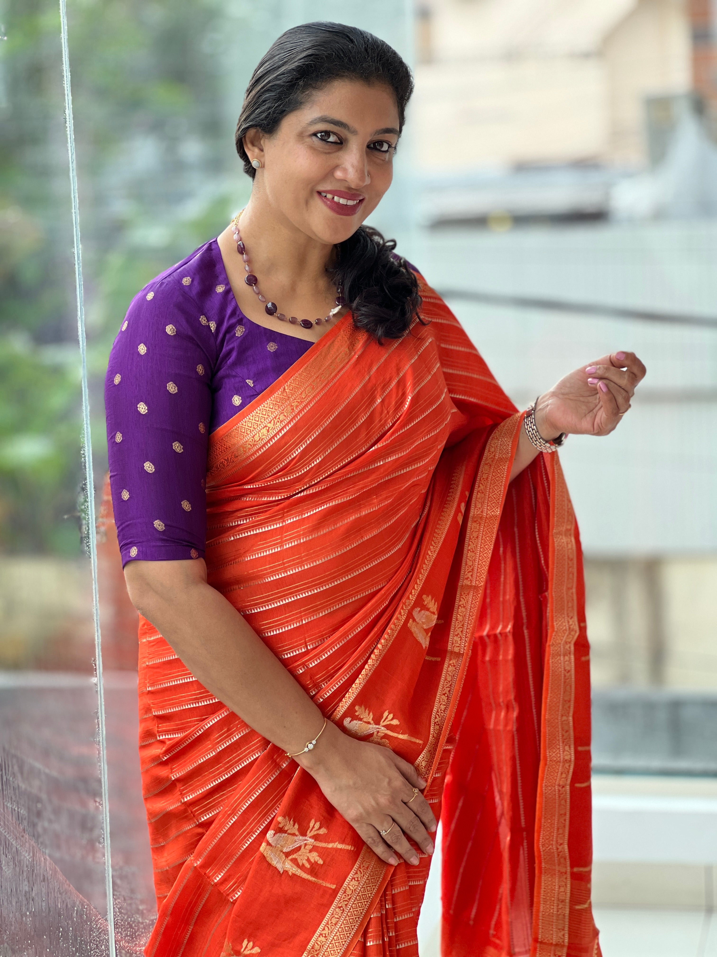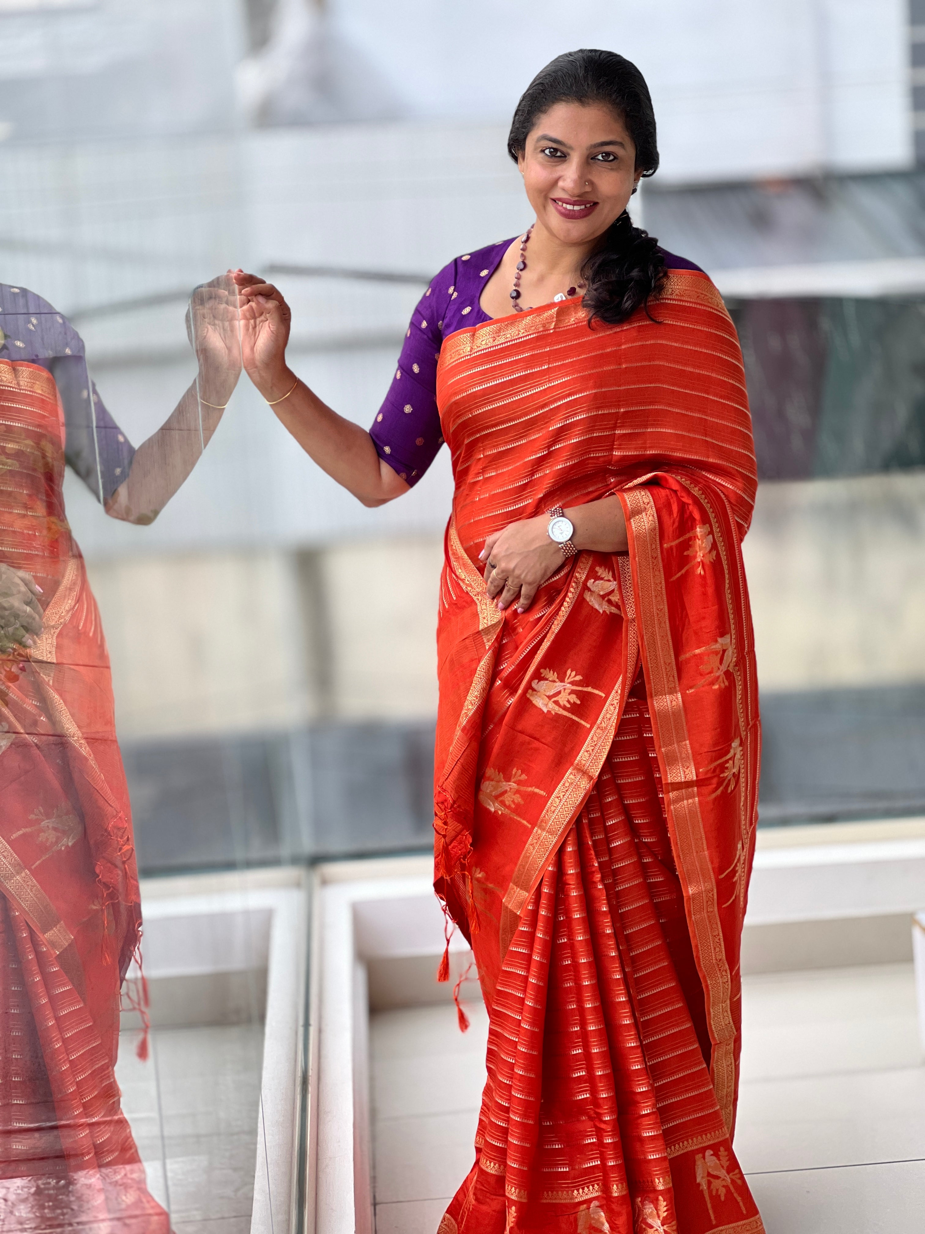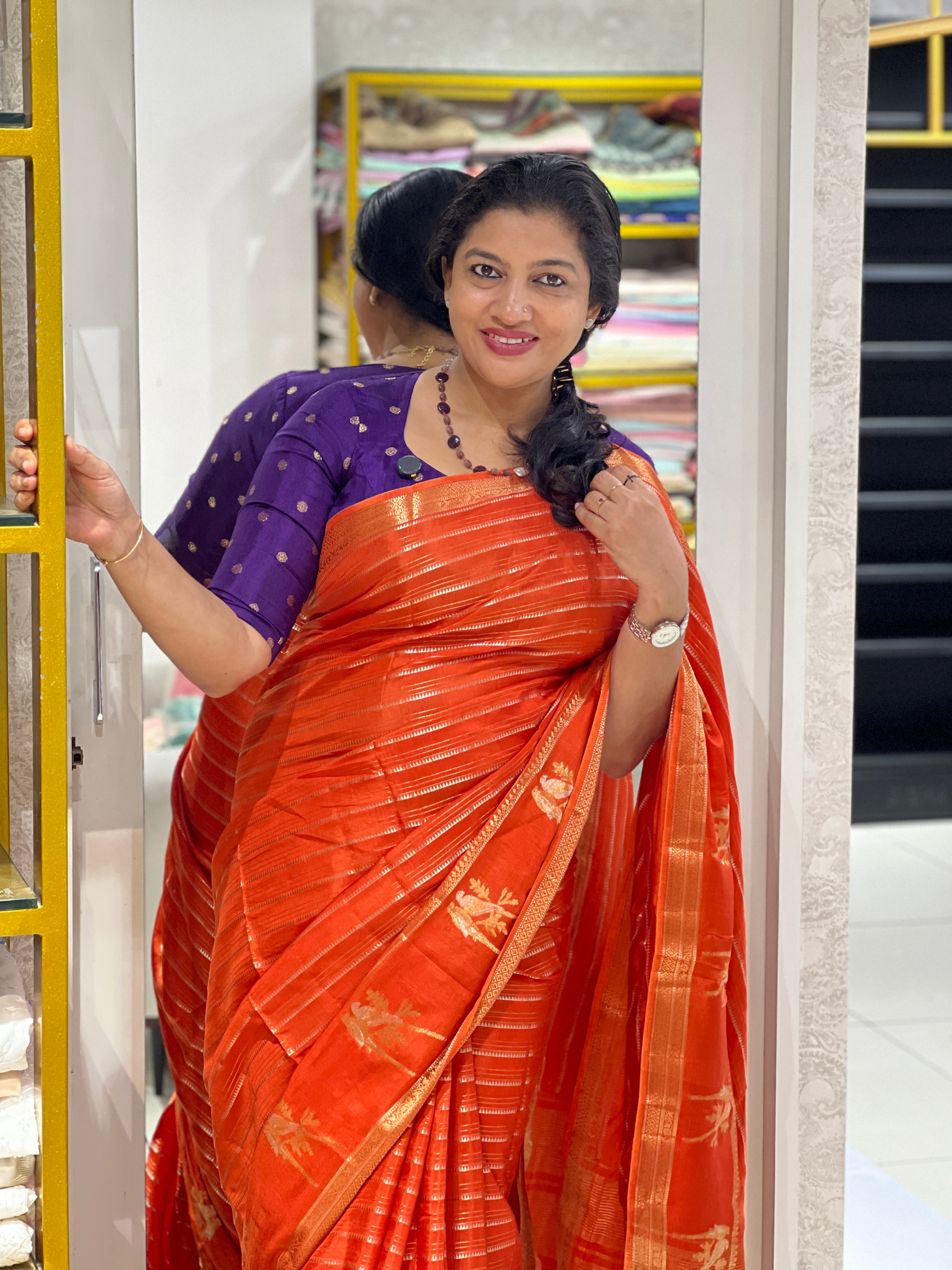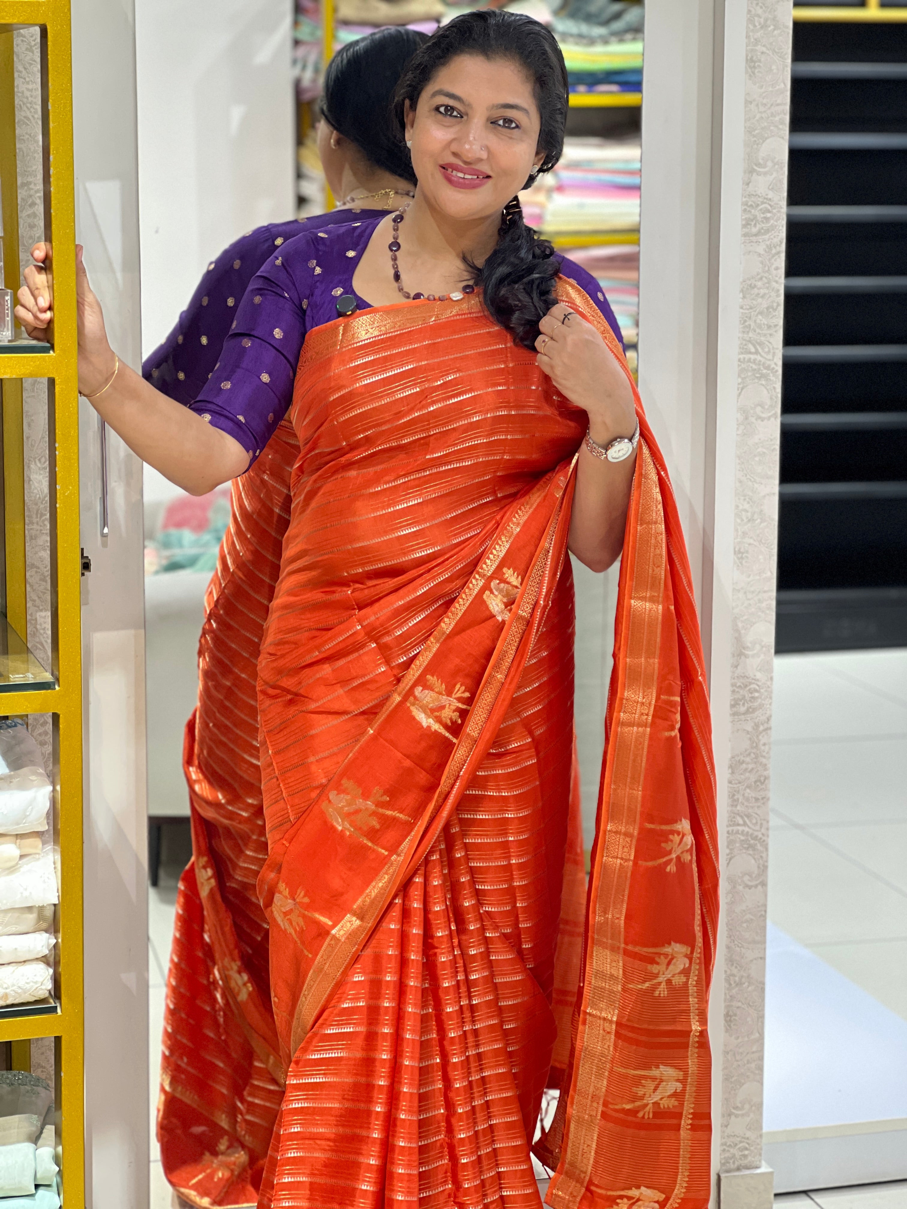 - Style: Zari Woven, Stripe & Temple Weaving Patterned Body, Birds Patterned Lower Border, Silver & Golden Zari Woven Traditional Borders, Zari Stripe Detailed Pallu, Banarasi Weaving Pattern