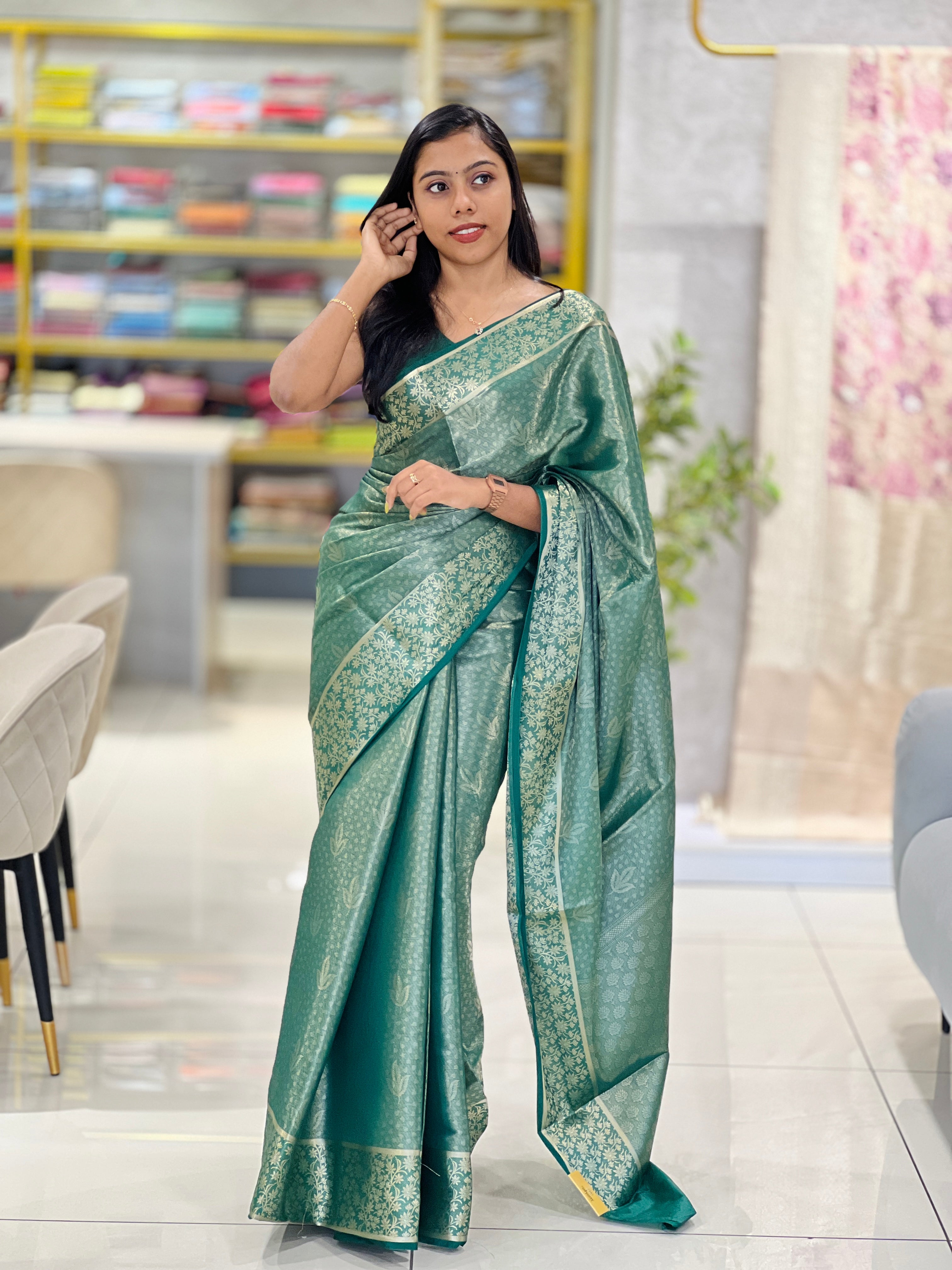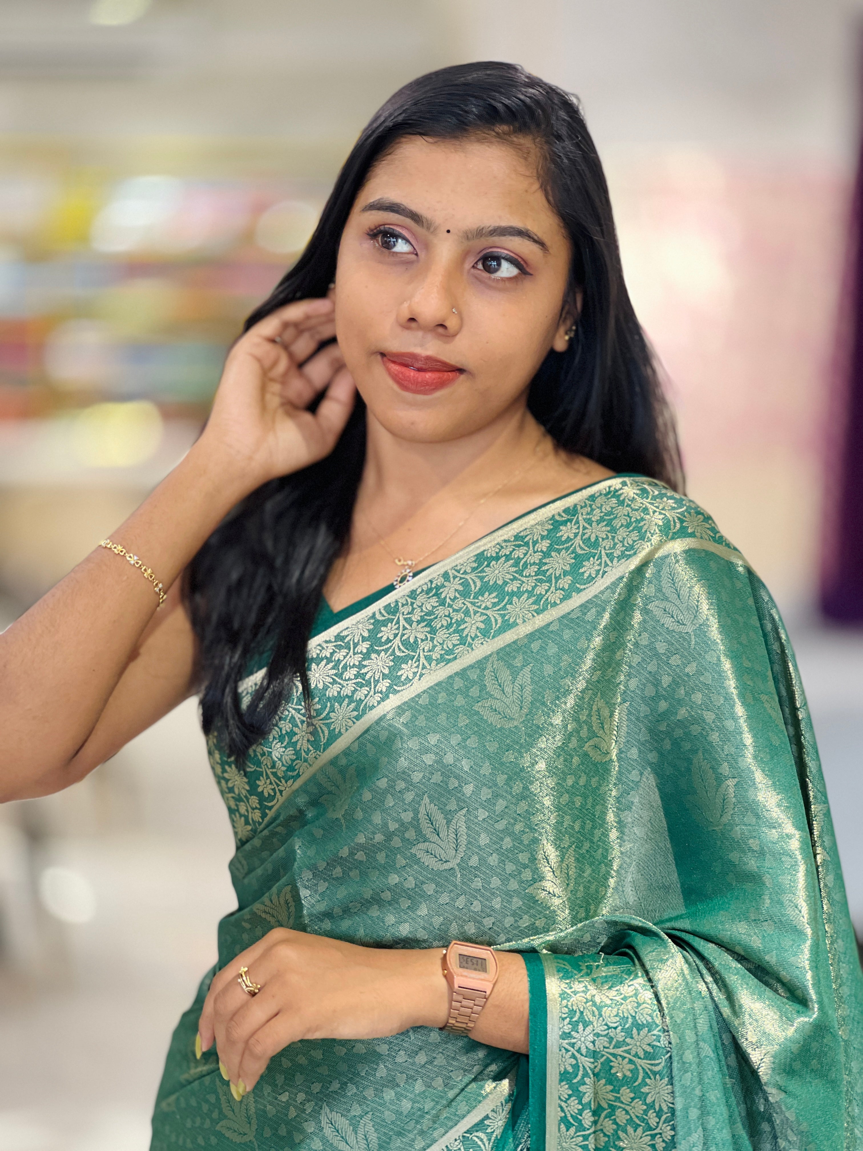 • Style: Banarasi Weaving Pattern, Zari Border Detailing, Floral Pallu Detailing, Scattered Leaf Pattern