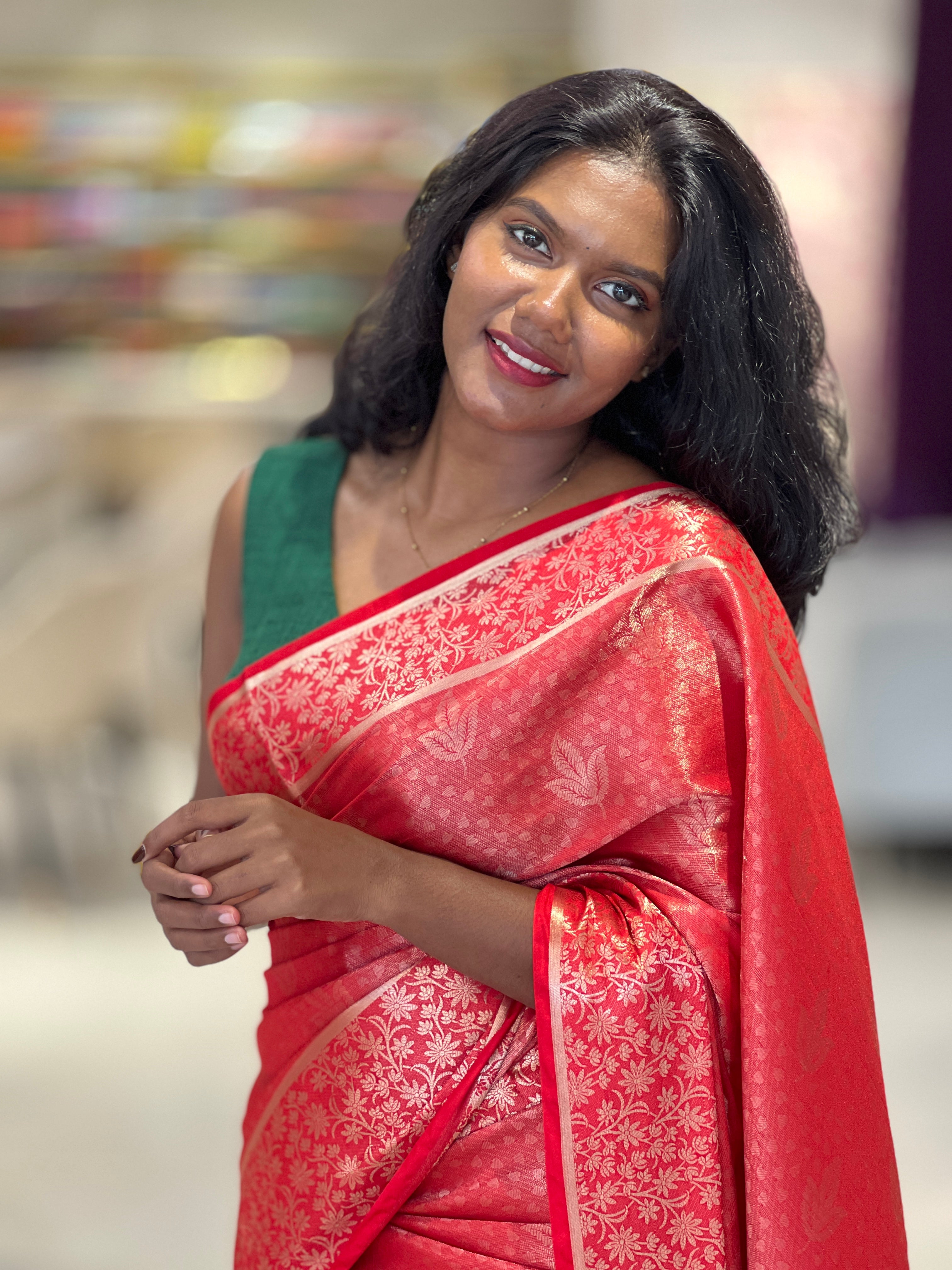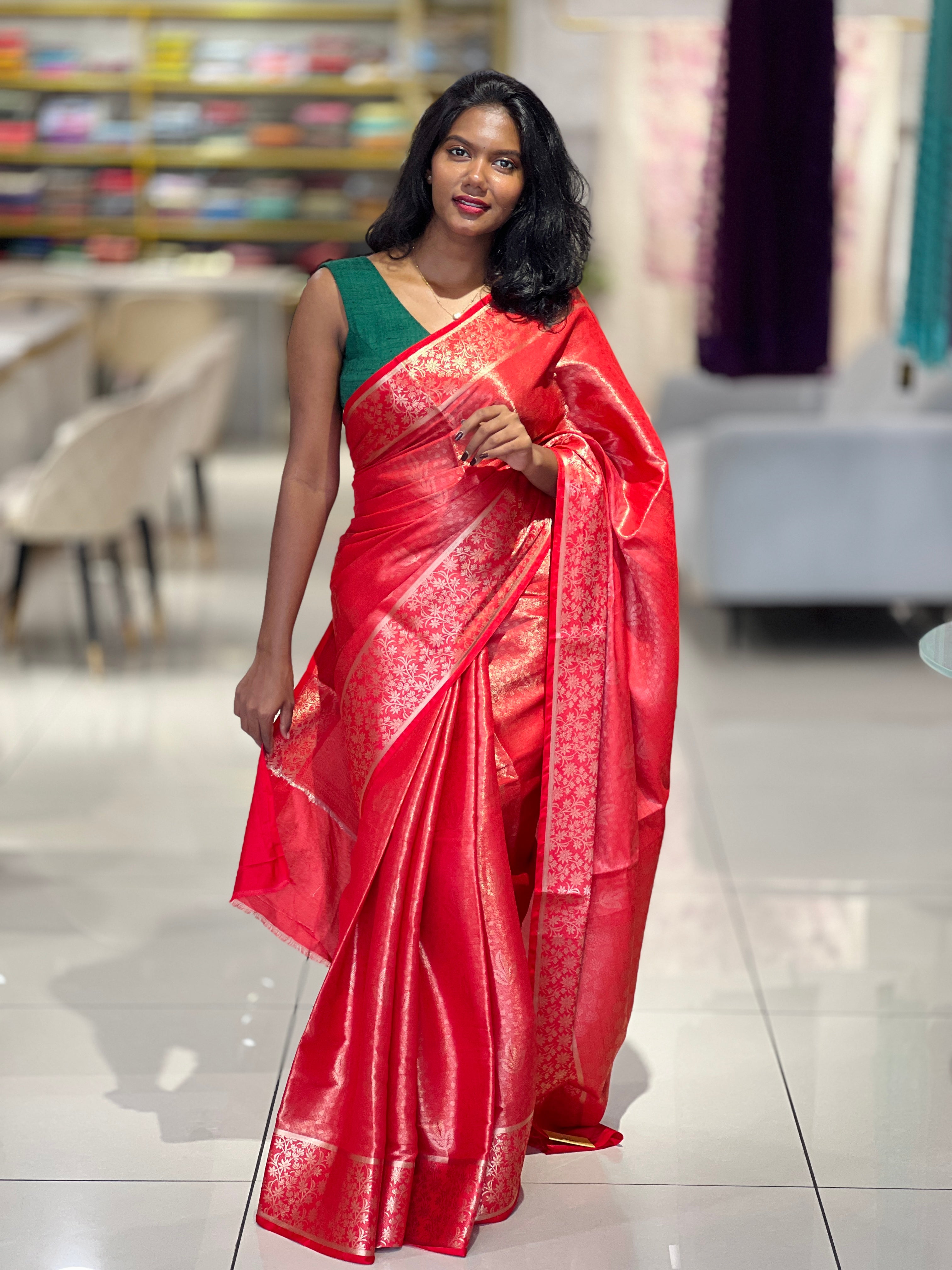 • Style: Banarasi Weaving Pattern, Zari Border Detailing, Floral Pallu Detailing, Scattered Leaf Pattern