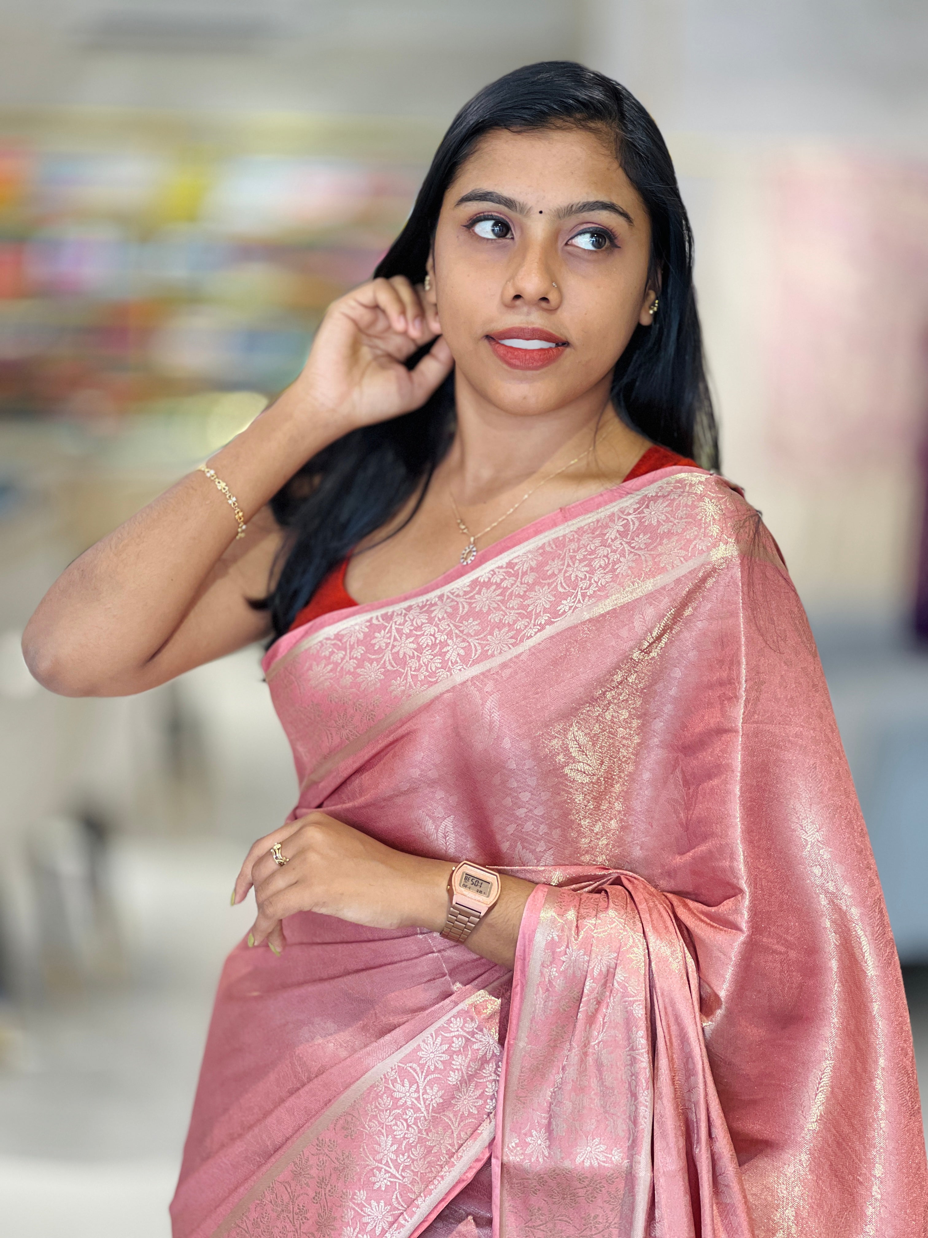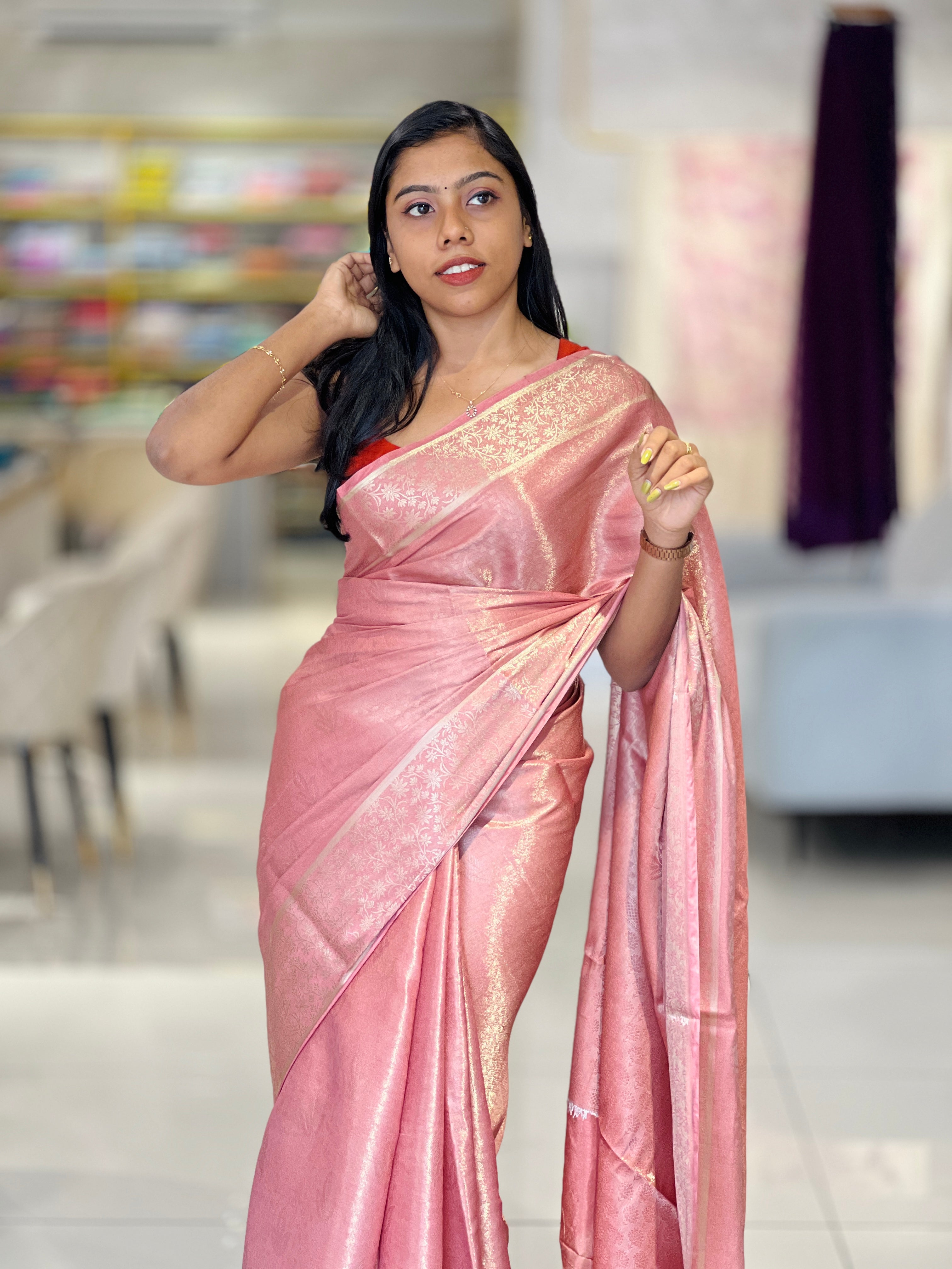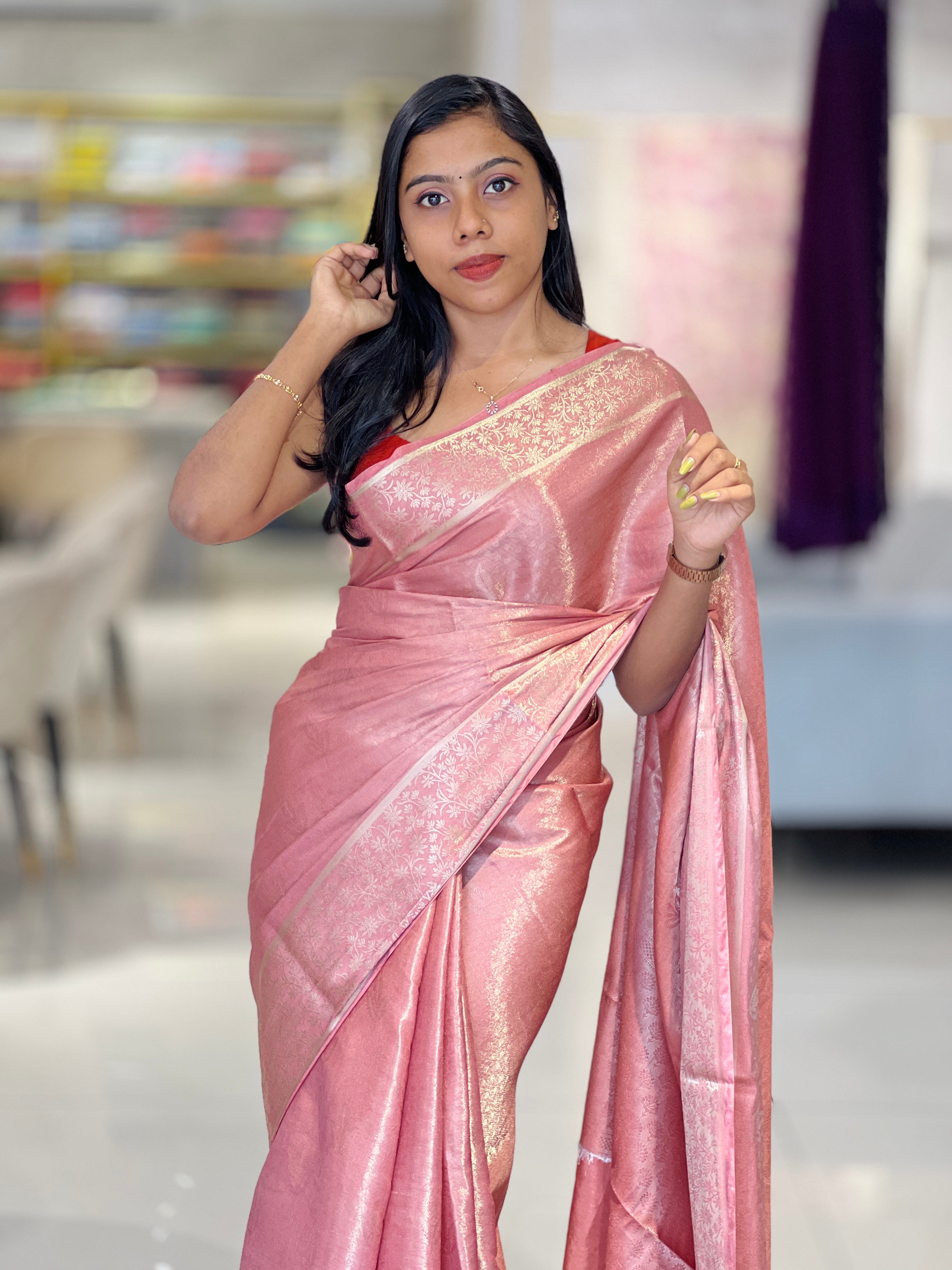 - Style: Banarasi Weaving Pattern, Zari Border Detailing, Floral Pallu Detailing, Scattered Leaf Pattern
