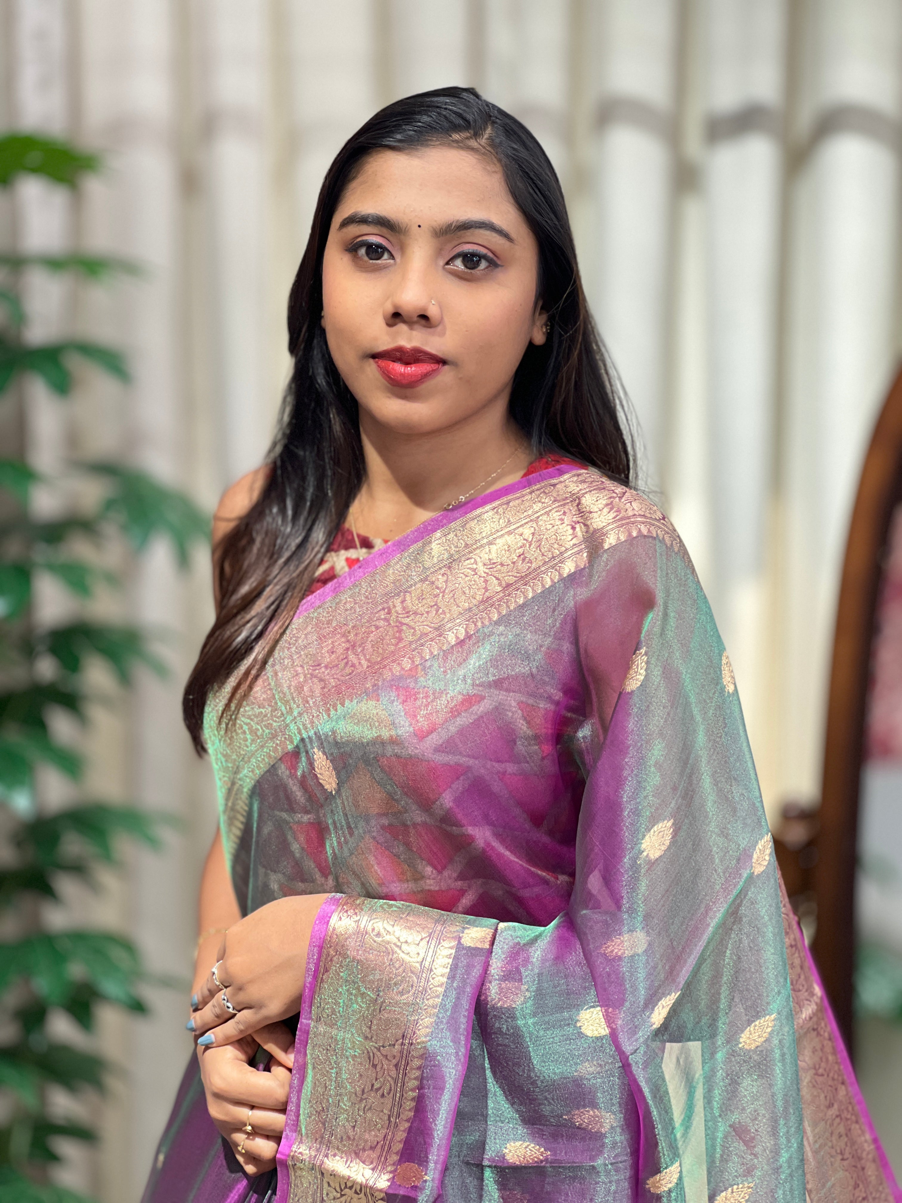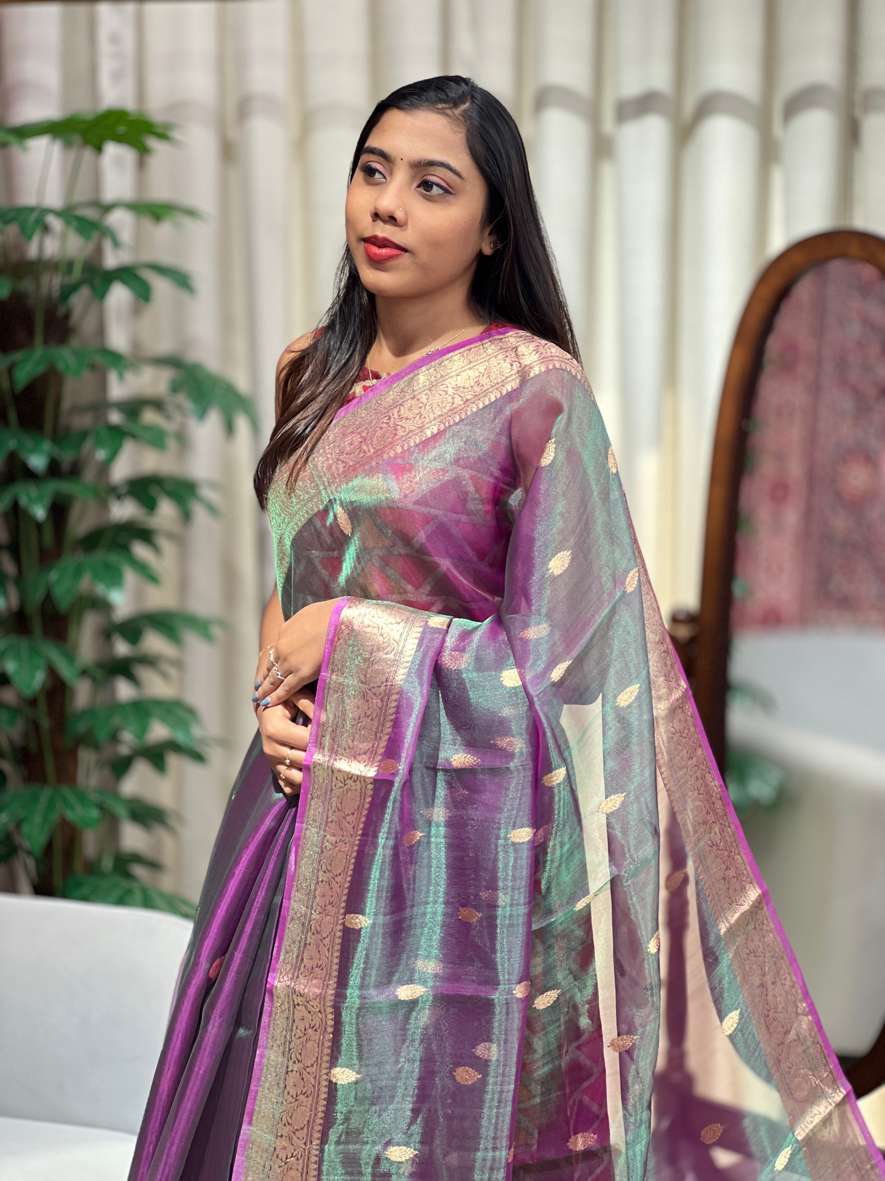 • Style: Tissue Woven, Traditional Banarasi Borders, Scattered Butta, Banarasi Short Pallu