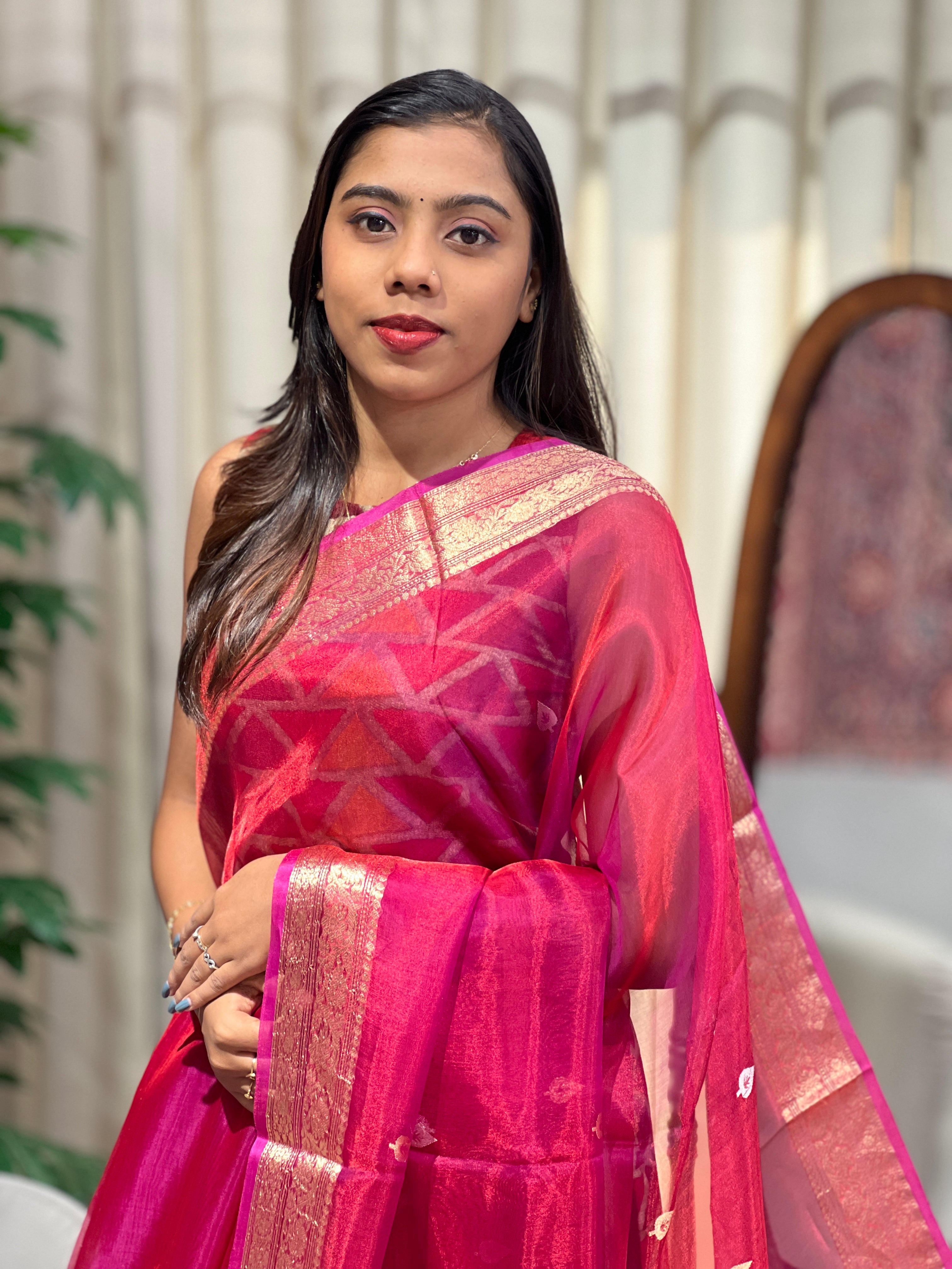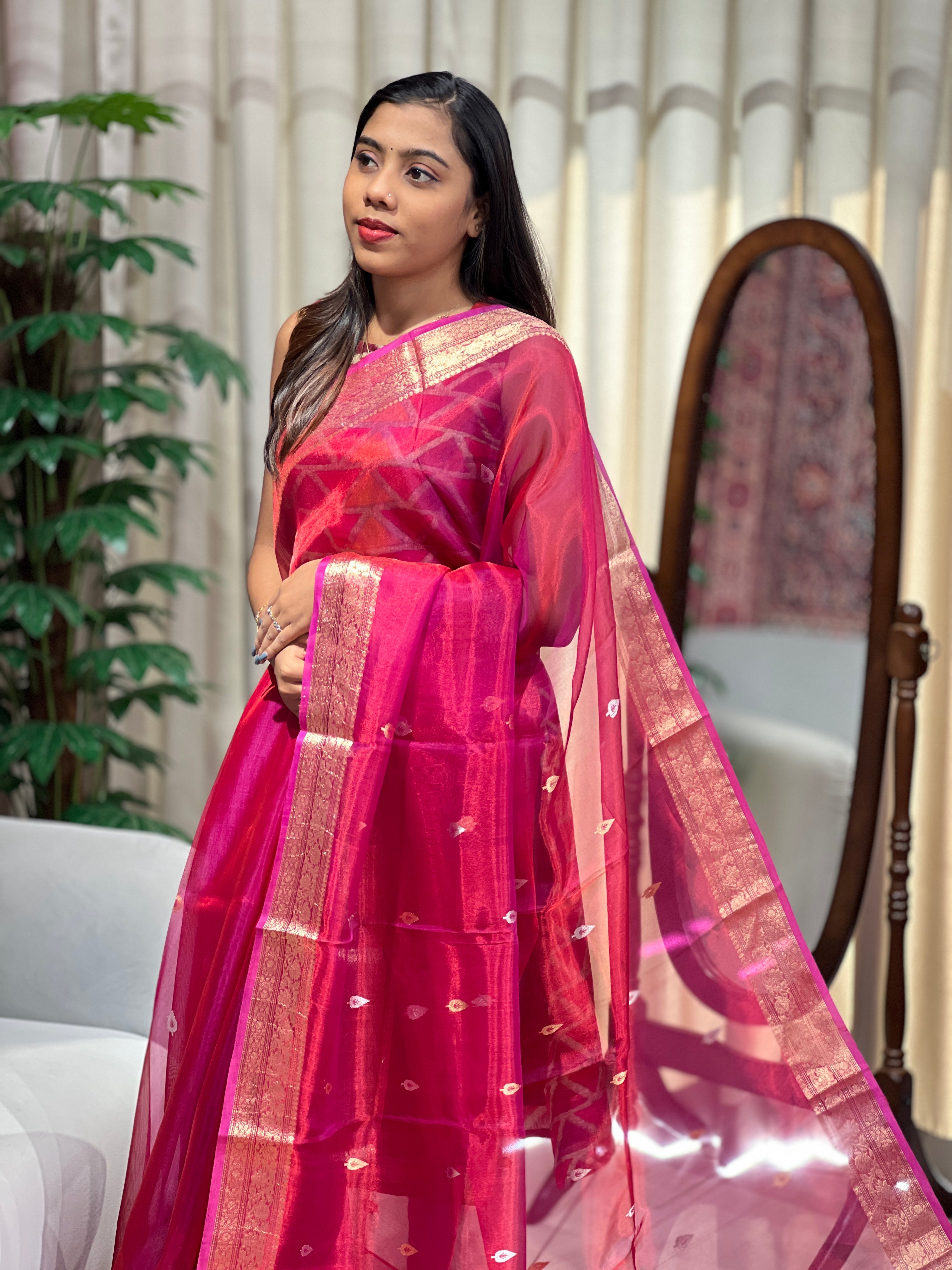 - Style: Tissue Woven, Traditional Banarasi Borders, Scattered Butta, Banarasi Short Pallu