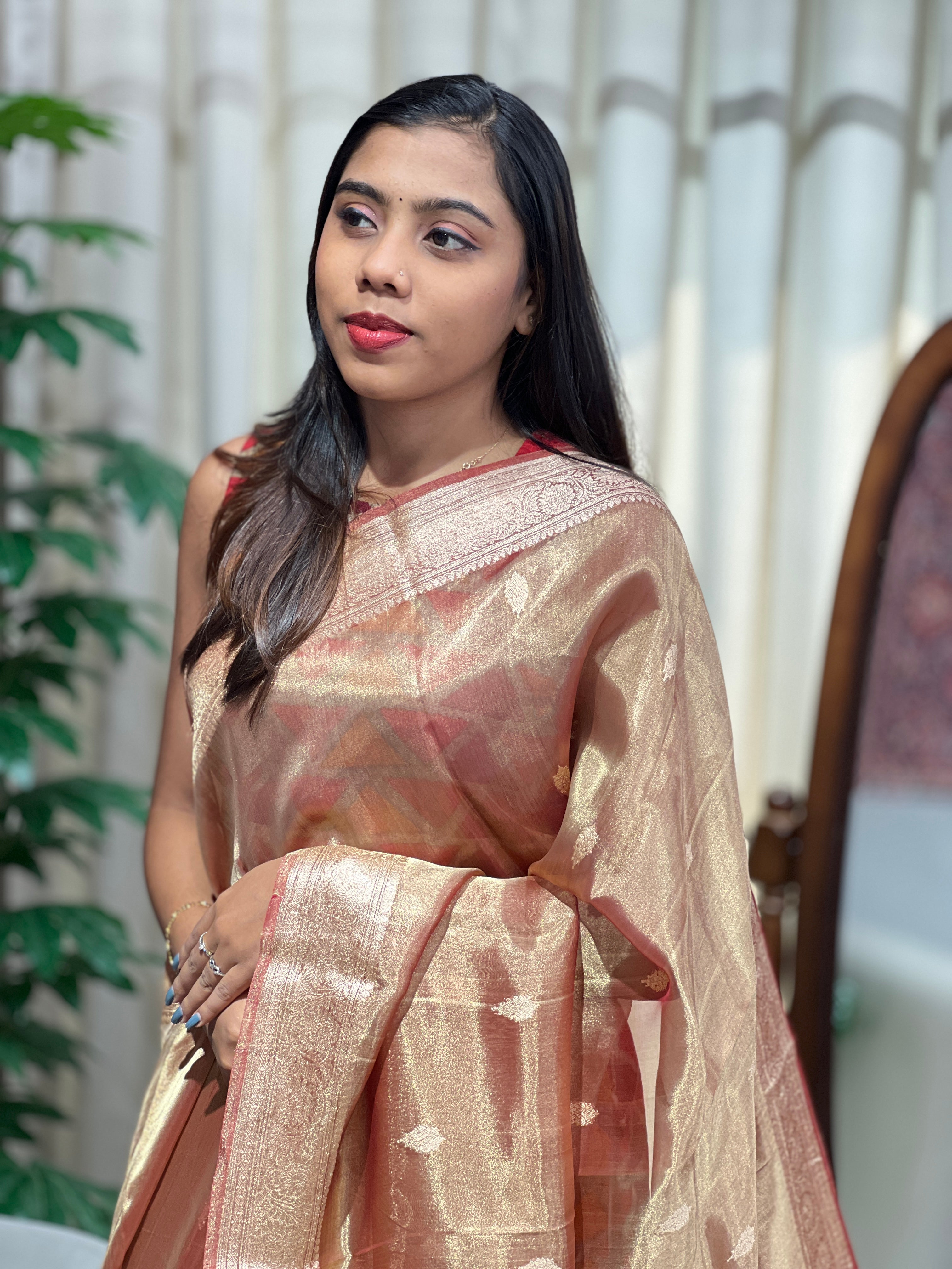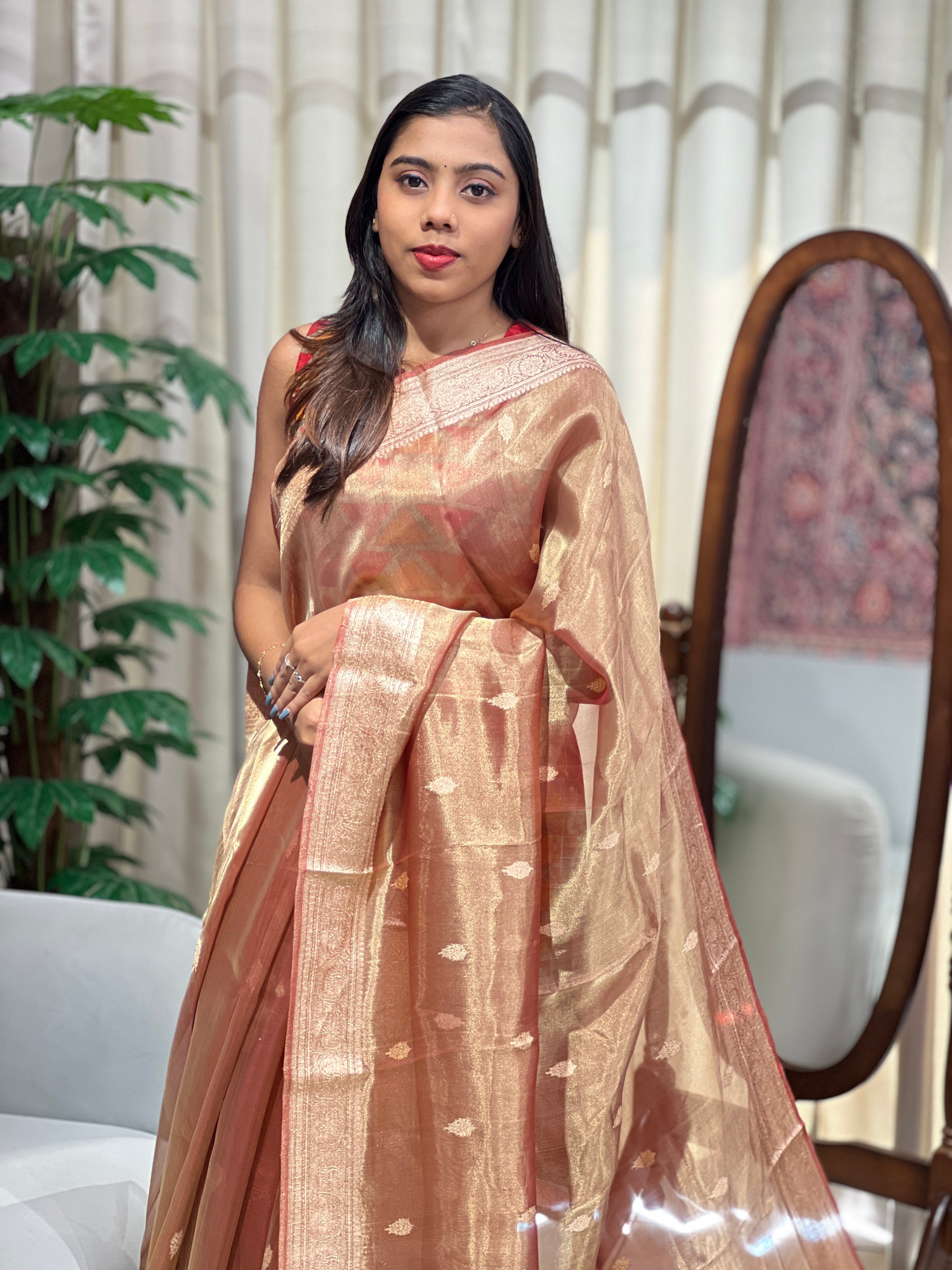 - Style: Tissue Woven, Traditional Banarasi Borders, Scattered Butta, Banarasi Short Pallu
