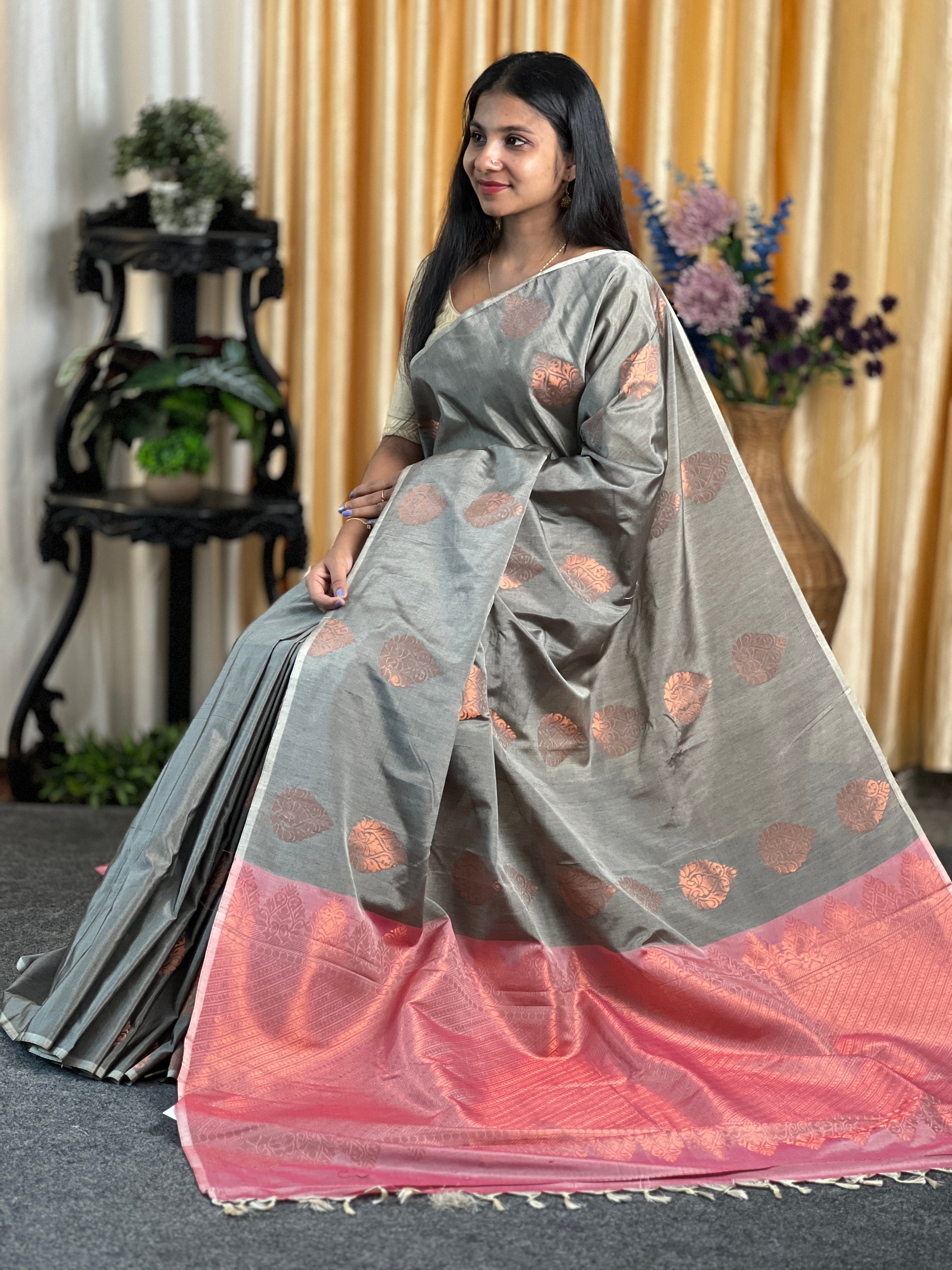 • Style: Zari Woven Traditional Butas, Diagonal Patterned Contrast Pallu
