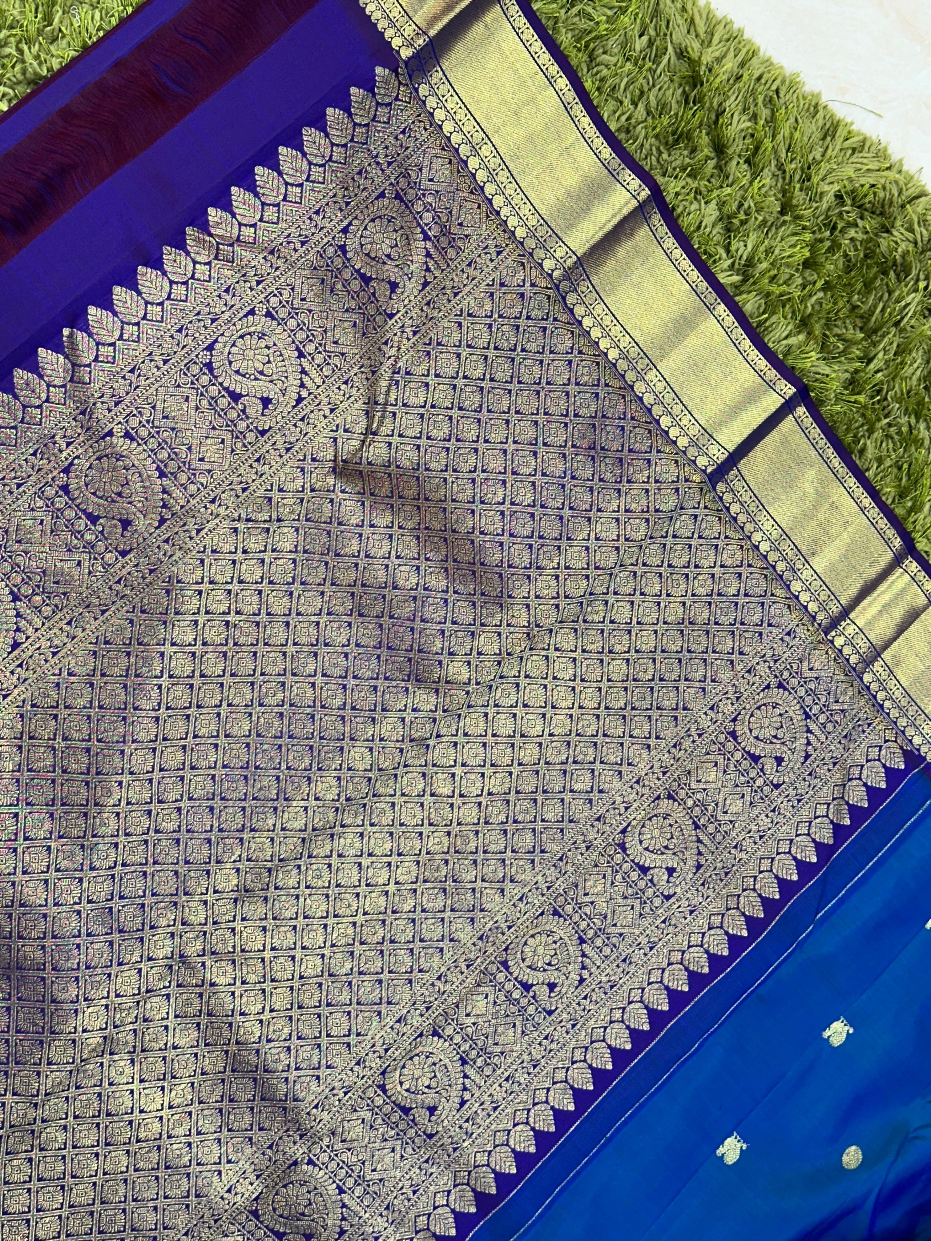 - Style: Handloom, Zari Woven, Double Shaded, Traditional Patterned Borders, Scattered Peacock & Chakra Butta Woven, Traditional Diamond & Paisley Patterned Pallu