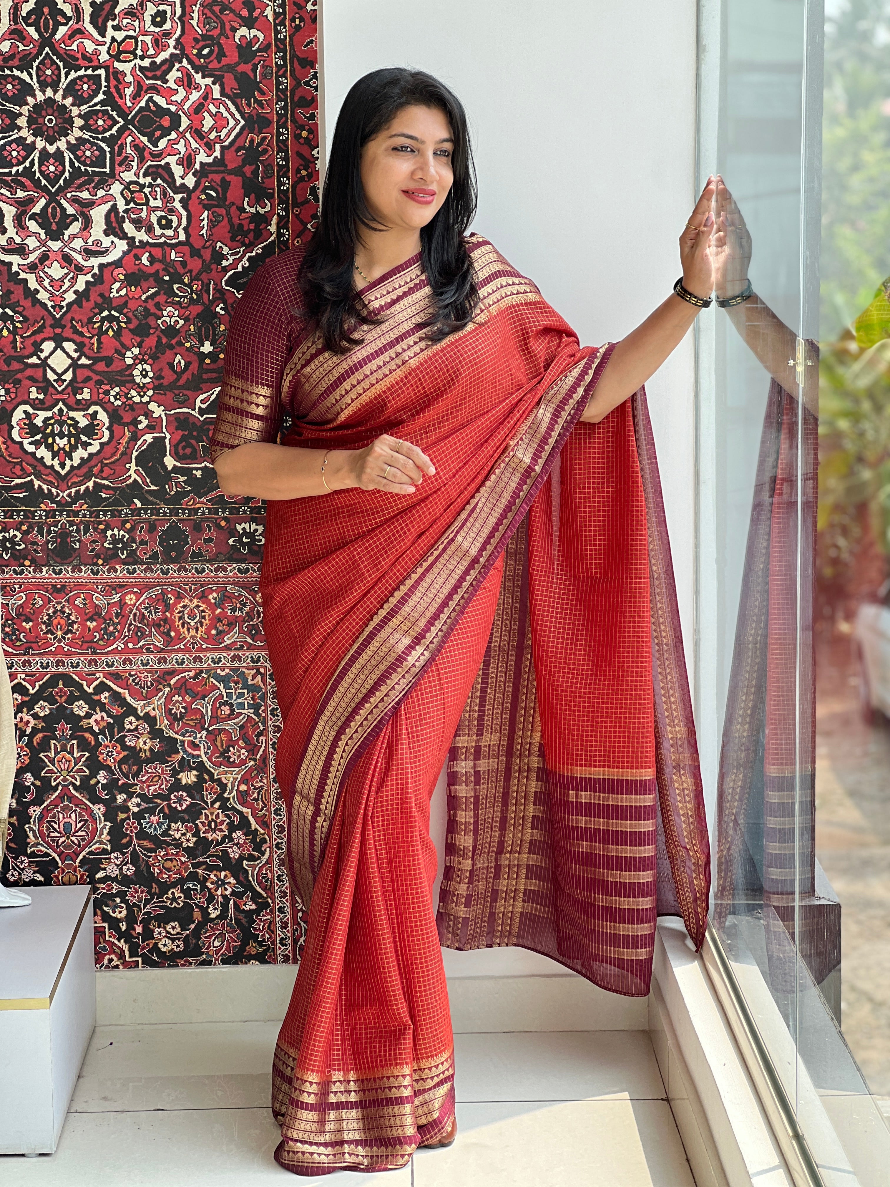 - Style: Traditional Check Pattern, Stripes Detailing On Pallu, Temple And Paisley Patterned Border Detailing