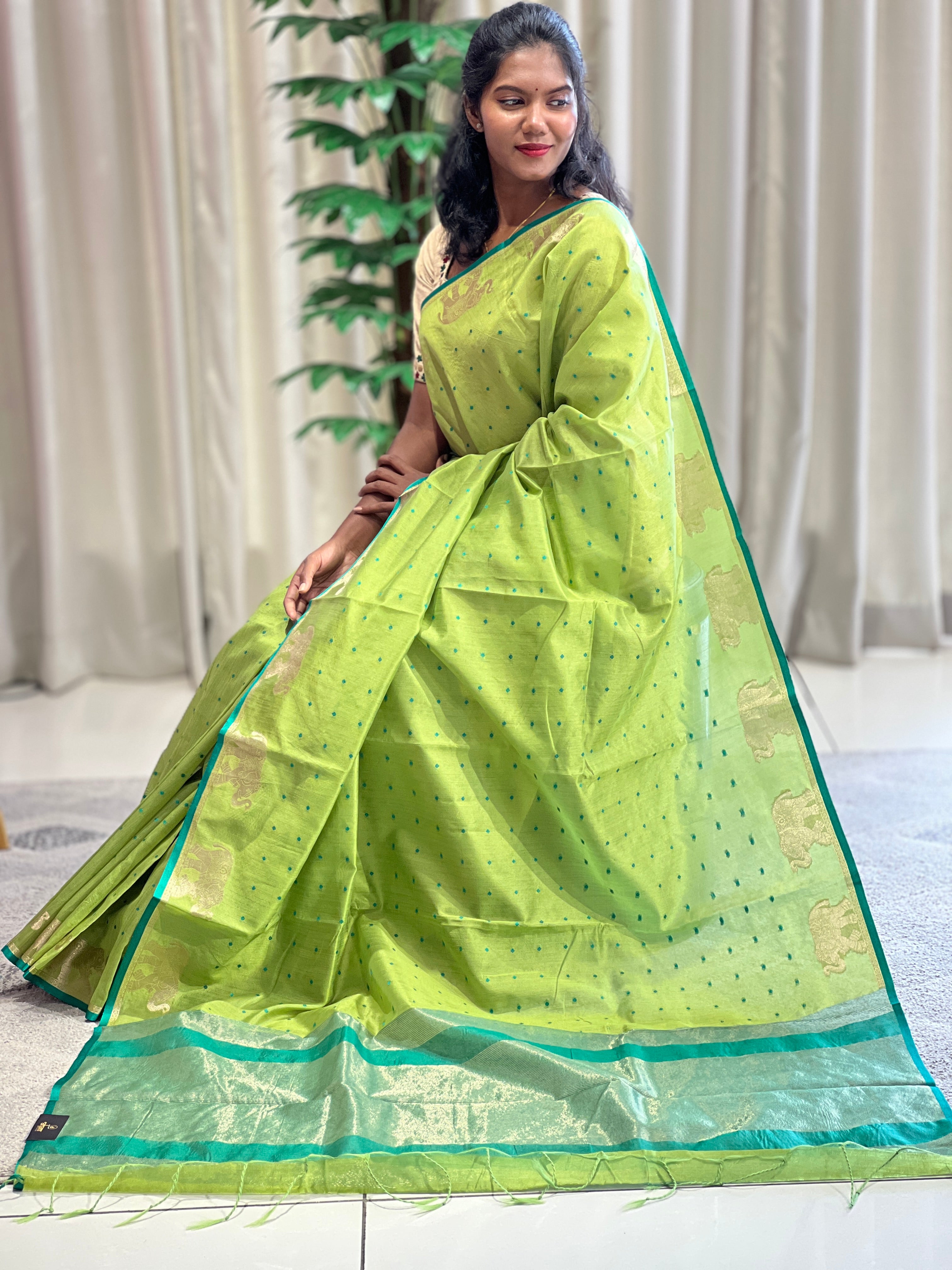 - Style: Elephant Motifs,Body Thread Weaving Pattern Power Loom,Zari Stripe Woven Pallu ,Tassels Attached