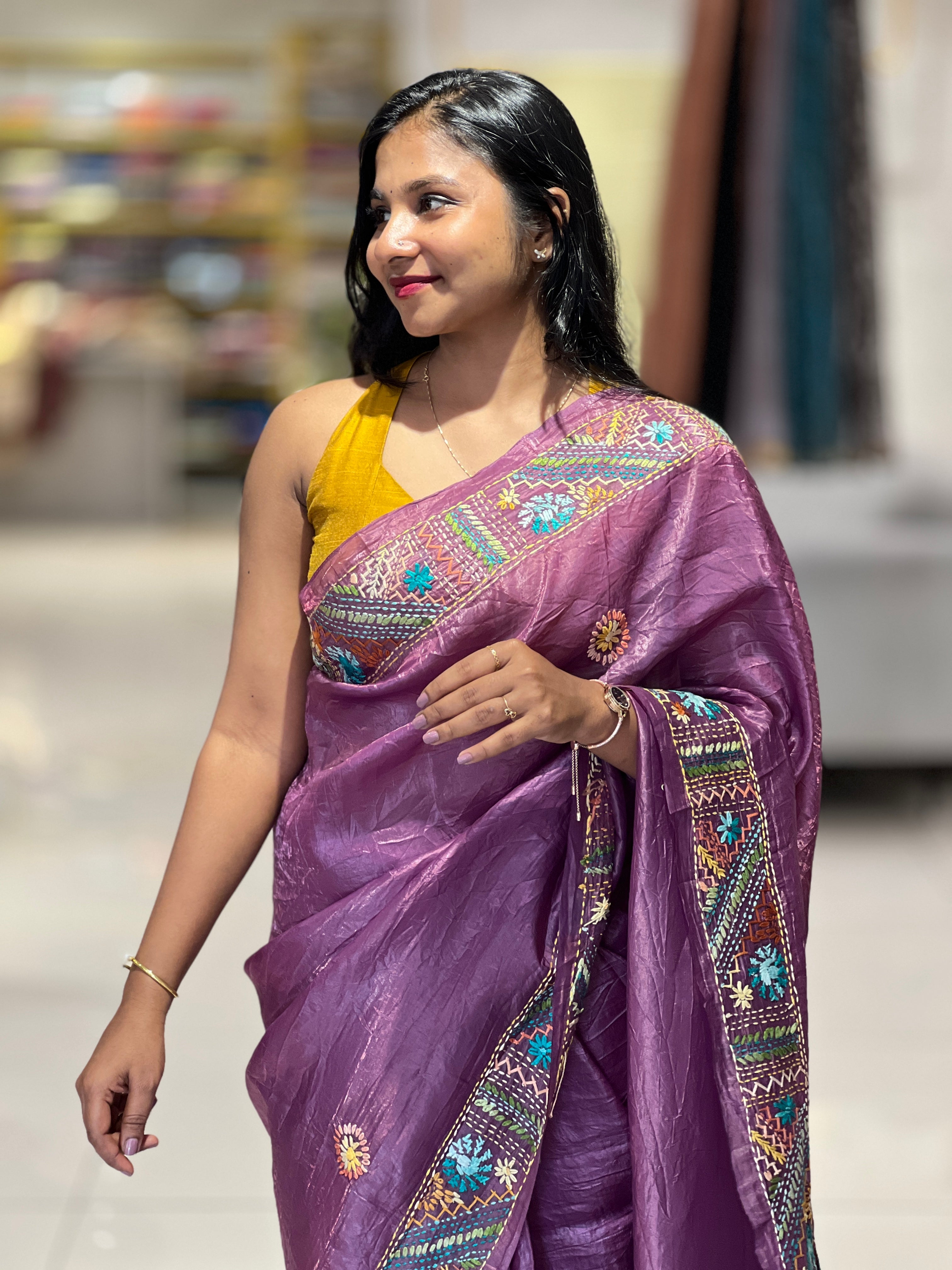 • Style: Traditional Hand Embroidered Kantha Work Detailing, Scattered Floral Lazy Daisy Detailing, Embroidered Pallu and Border Detaling, Tassels Attached