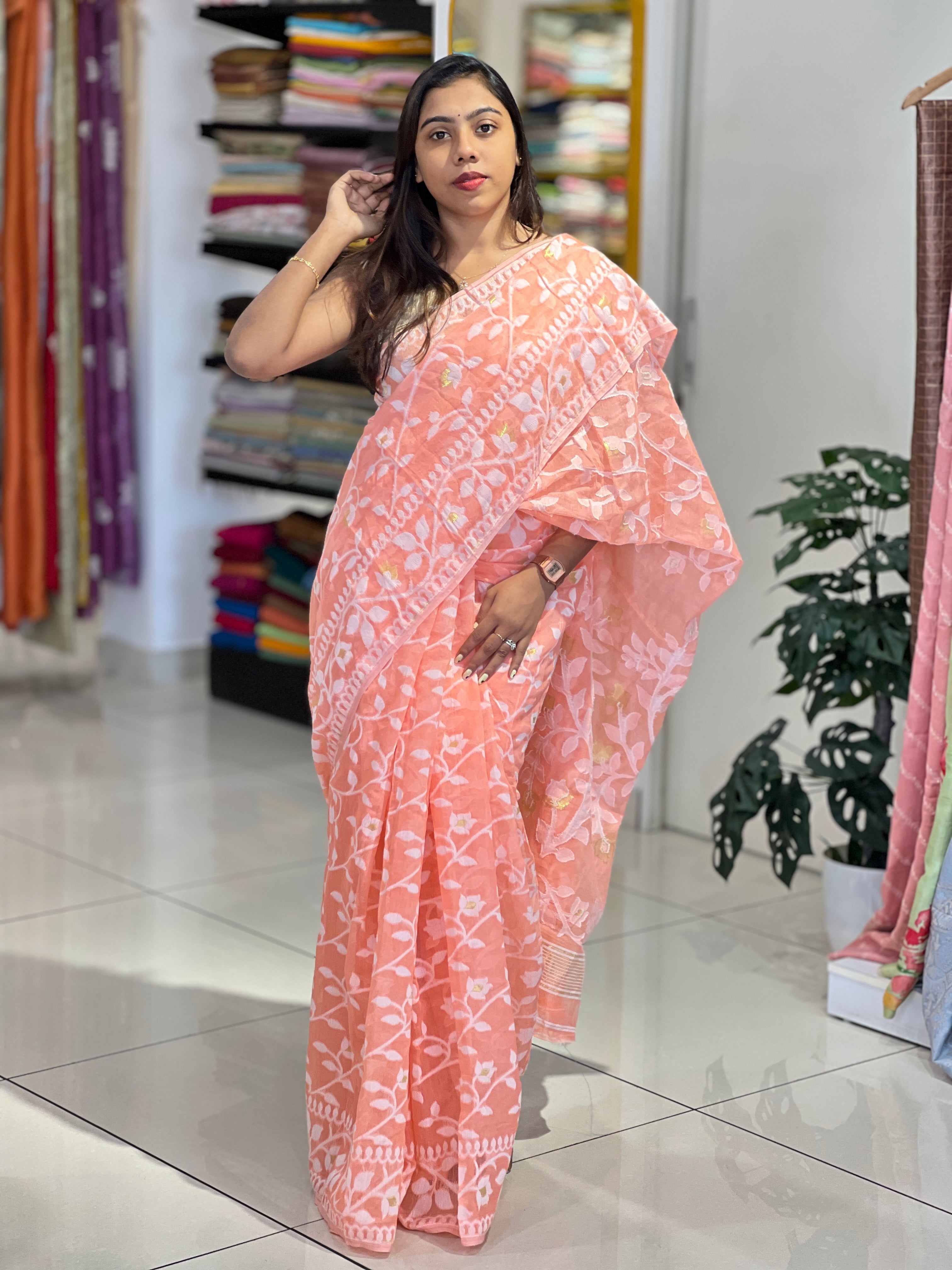 - Style: Traditional Jamdani Woven, Zari Woven
