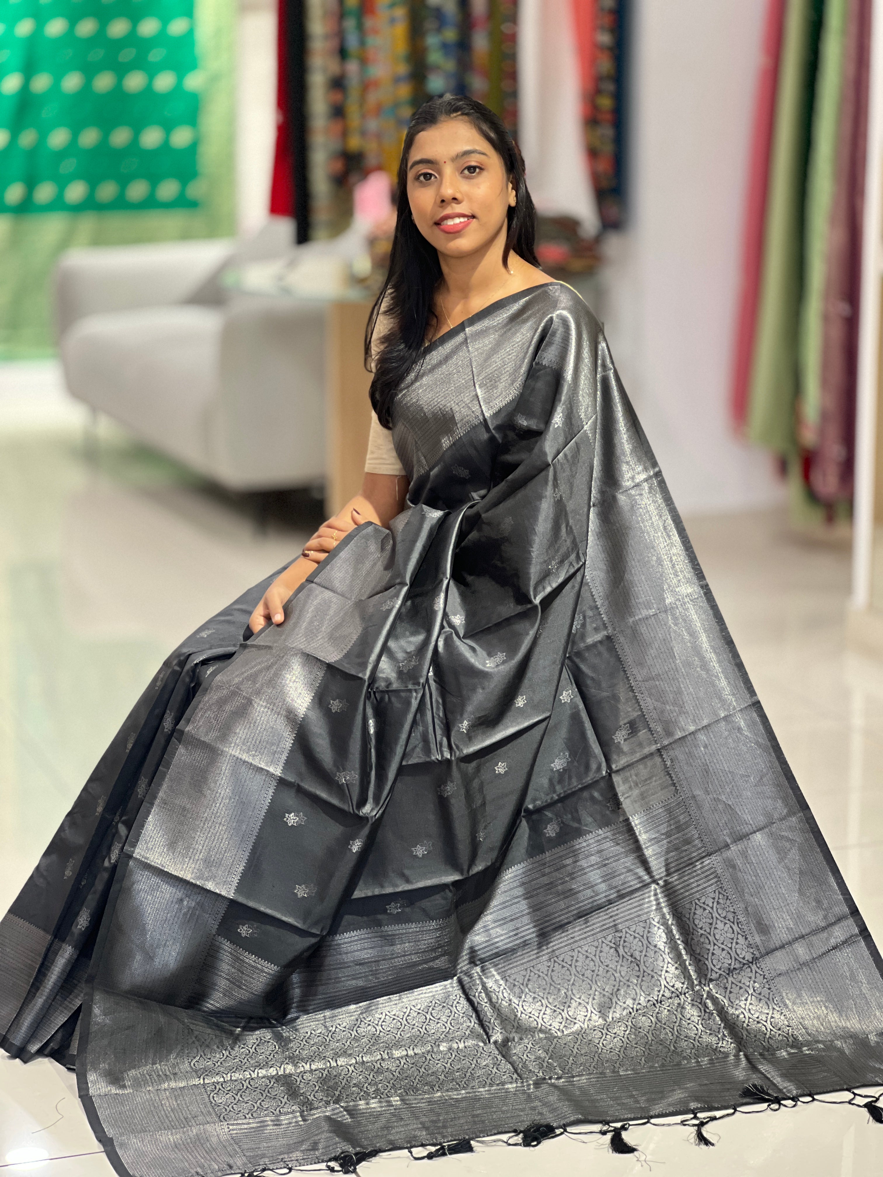 • Style: Silver Zari & Black Yarn Weaved Buta, Traditional Line Patterned Borders, Brocade Floral Patterned Pallu, Tassels Attached