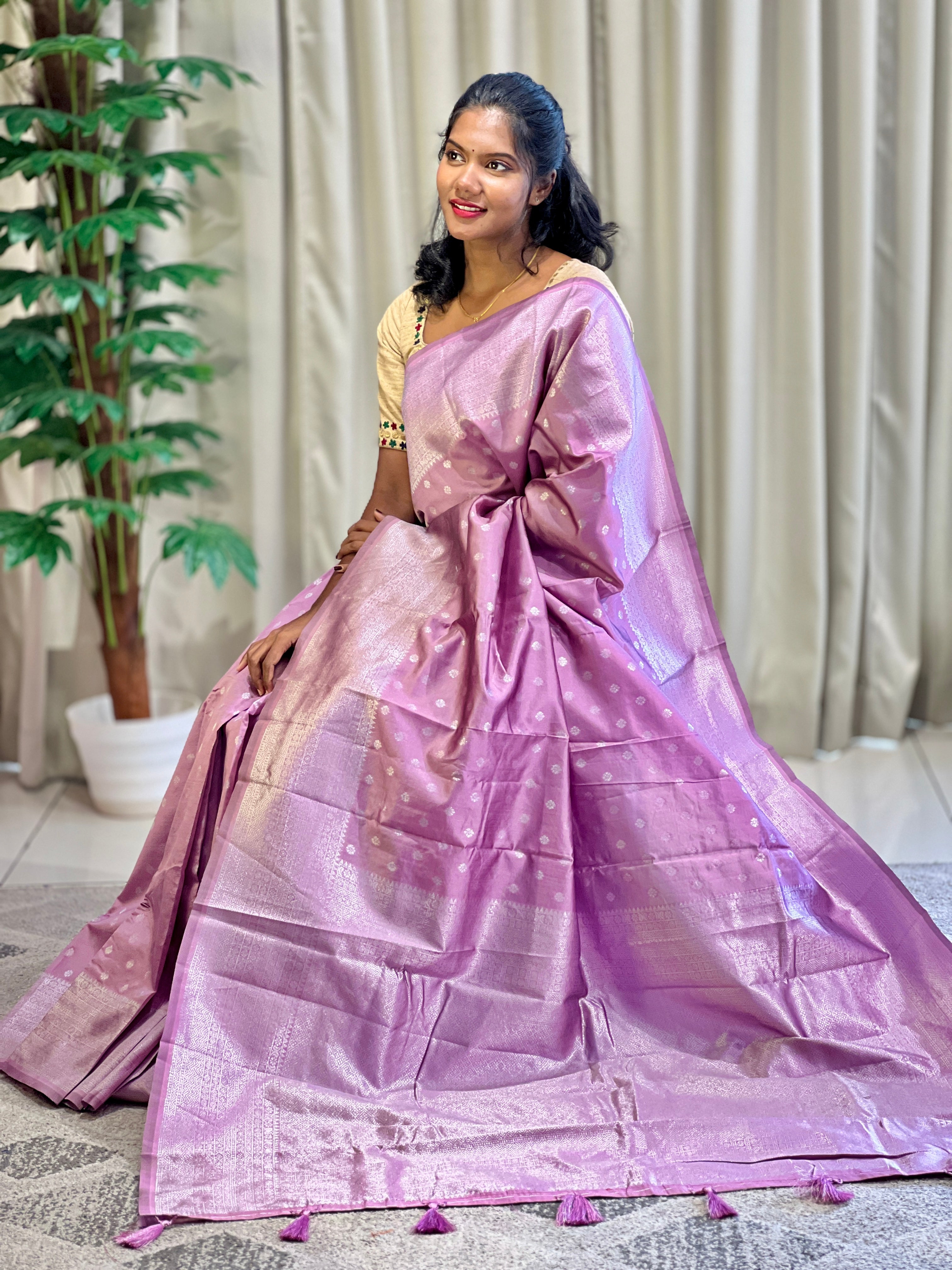 - Style: Silver Zari Woven, Floral Buta Weaved, Zigzag Patterned Borders, Brocade Diamond Patterned Pallu, Tassels Attached