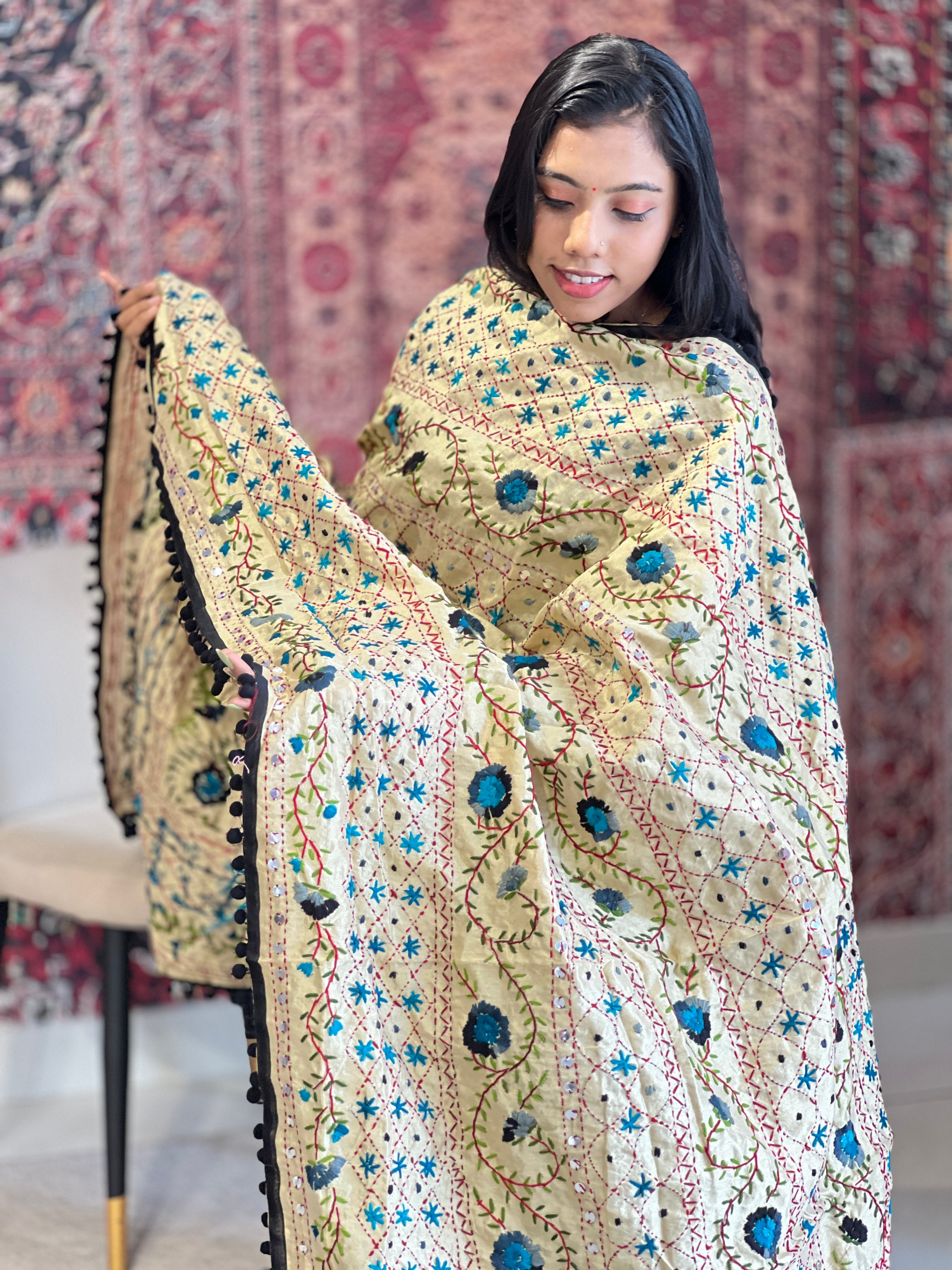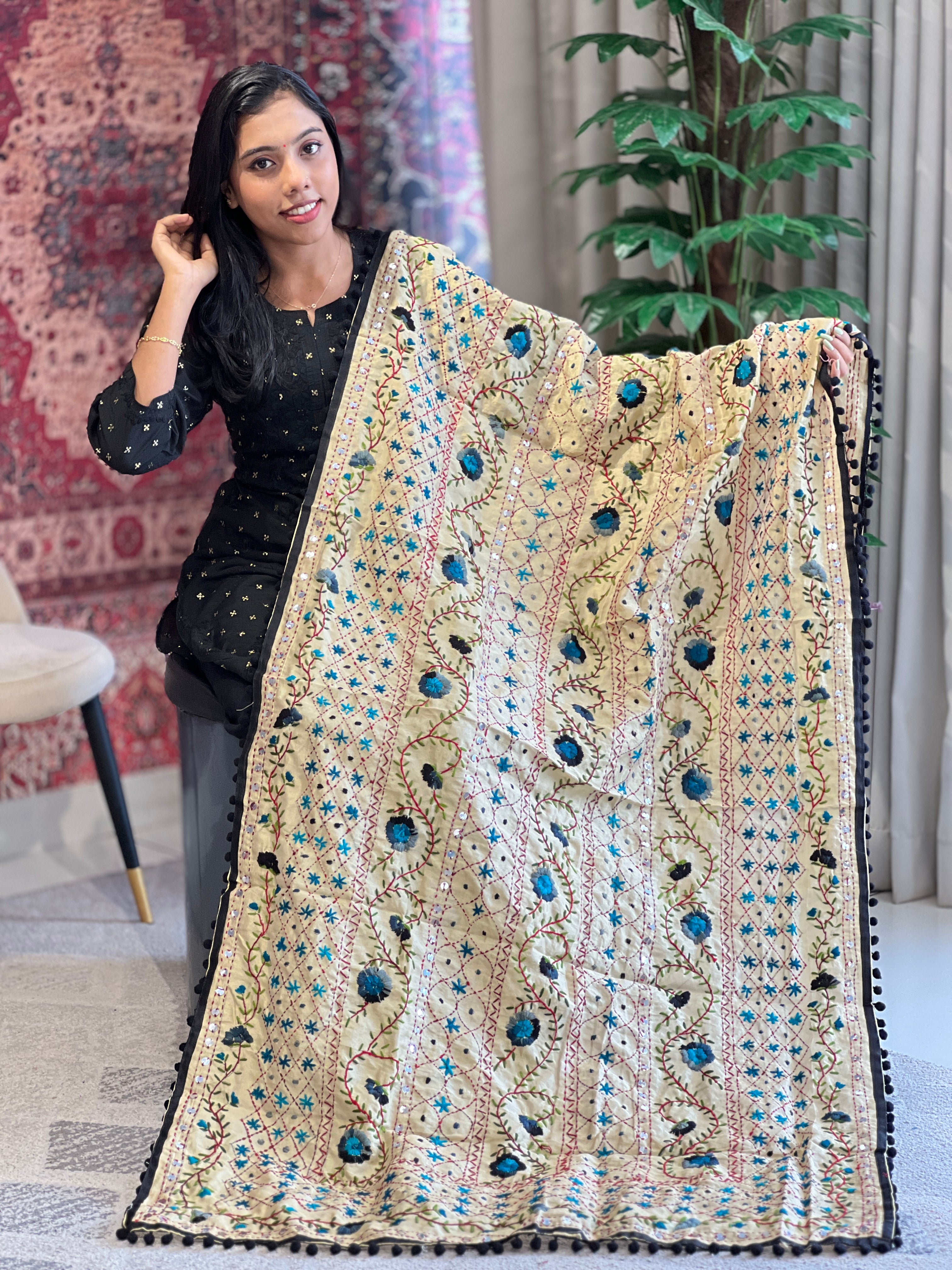 - Style: Multi-Color Thread Embroidery Floral Pattern, Kantha Embroidery, Hand Work, Pompom Tassels Detailing, Flat Facing Edges