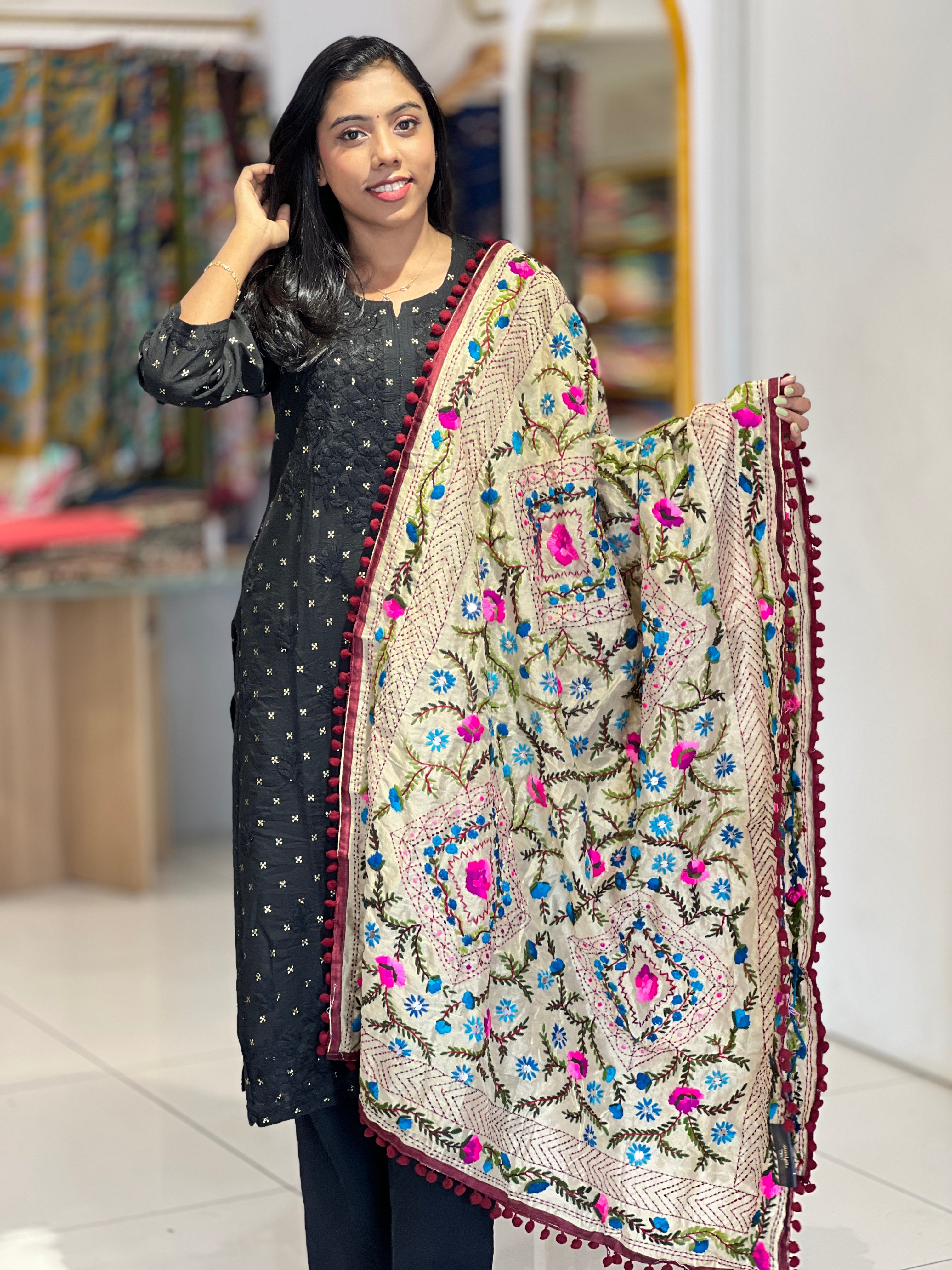 • Traditional Thread Embroidery Detailed Chanderi Finish Dupatta | VET285