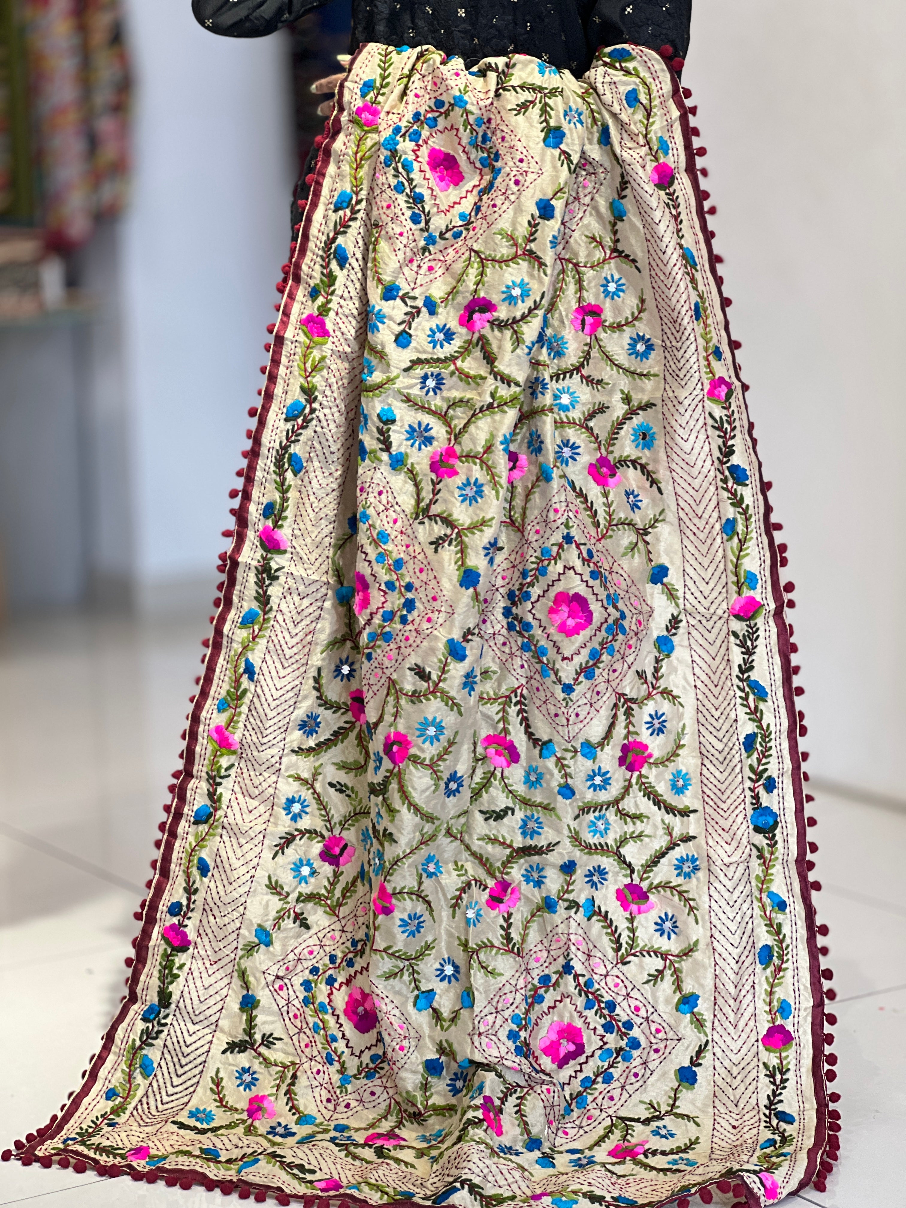 • Style: Multi-Color Thread Embroidery Floral Pattern, Kantha Embroidery, Hand Work, Pompom Tassels Detailing, Flat Facing Edges