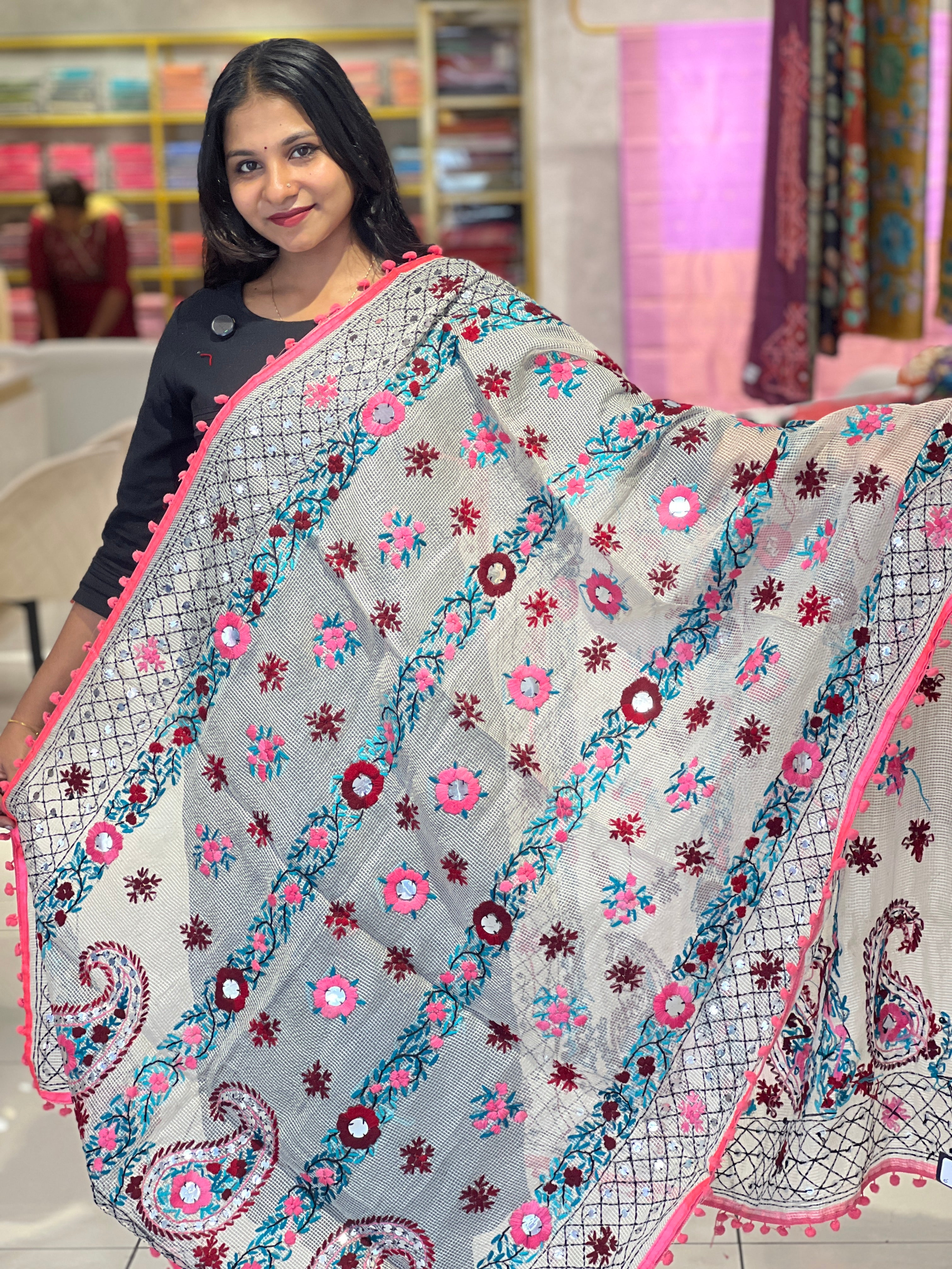 - Style: Multi-Color Thread Embroidery Floral Pattern, Kantha Embroidery, Hand Work, Pompom Tassels Detailing, Flat Facing Edges