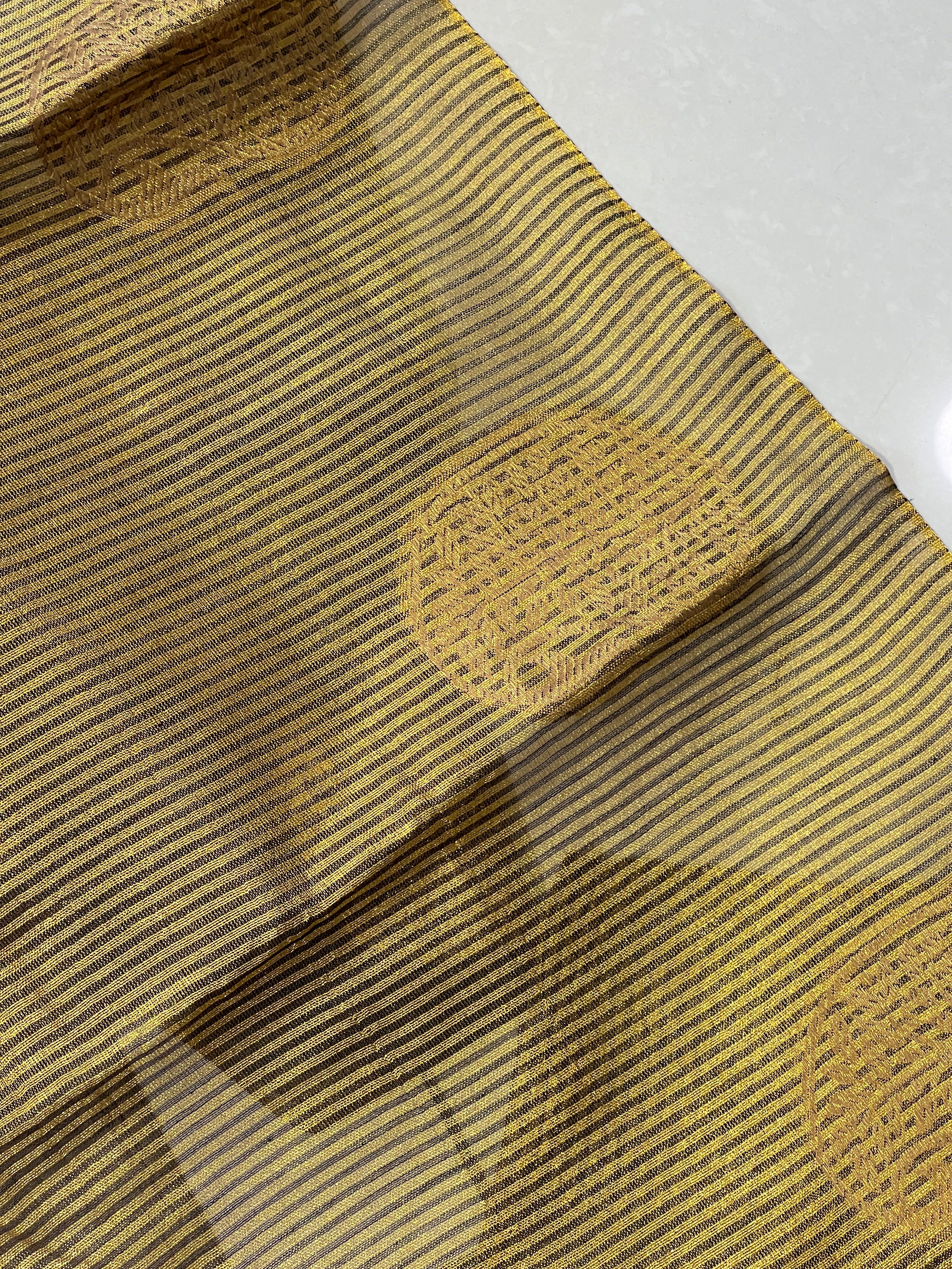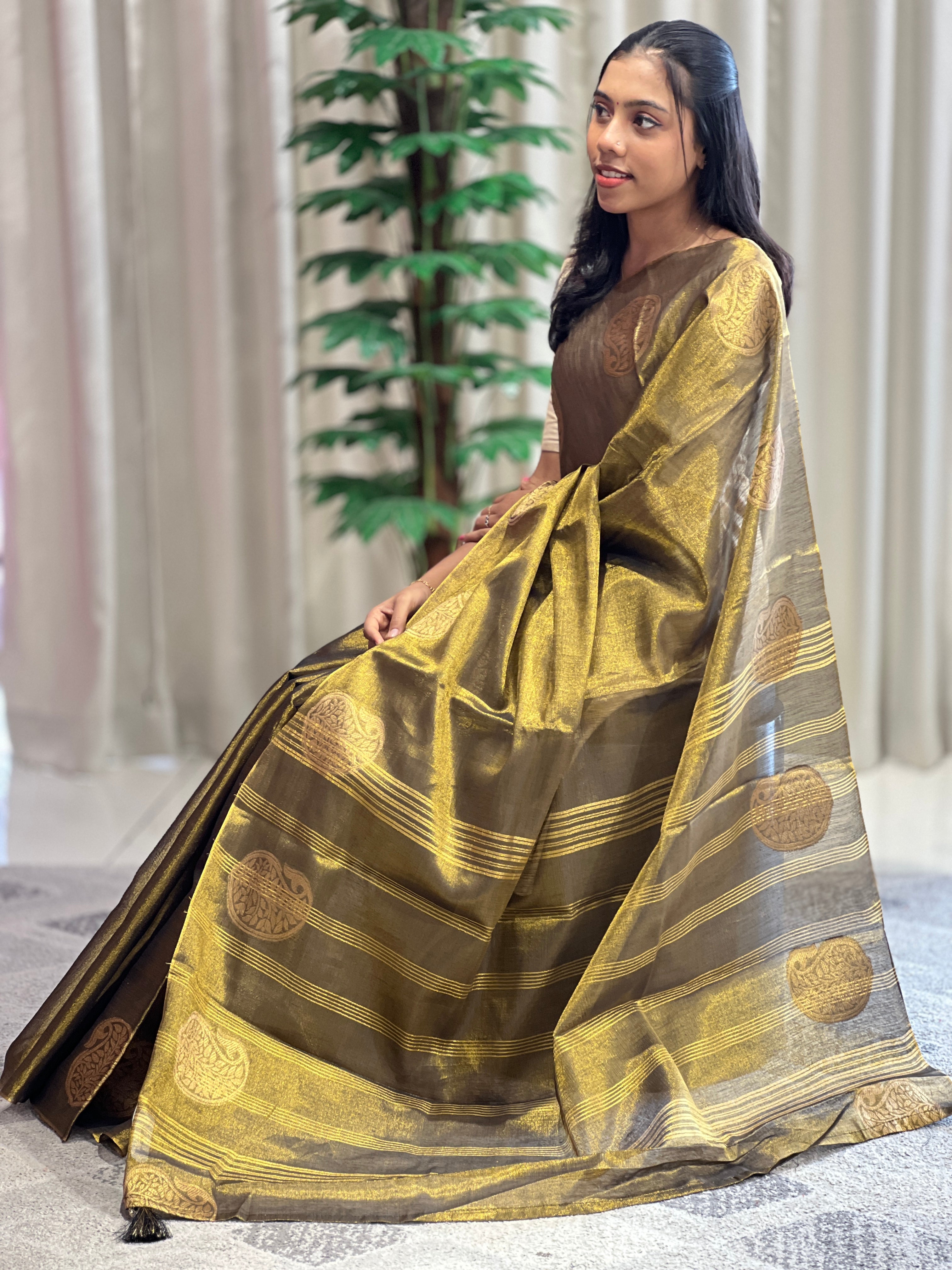 - Style: Golden Zari Woven, Traditional Buta Detailed Borders, Zari Stripe Patterned Pallu