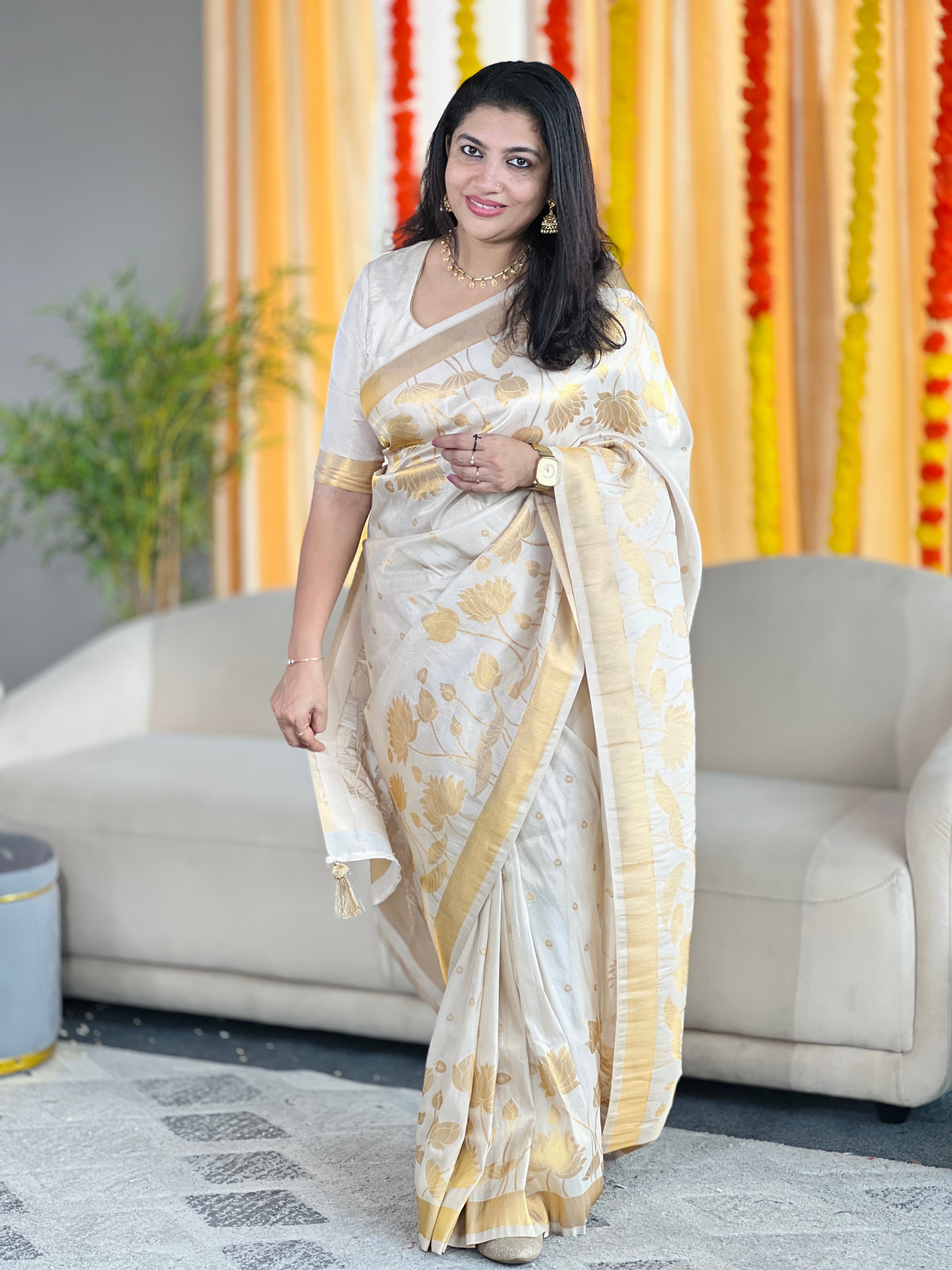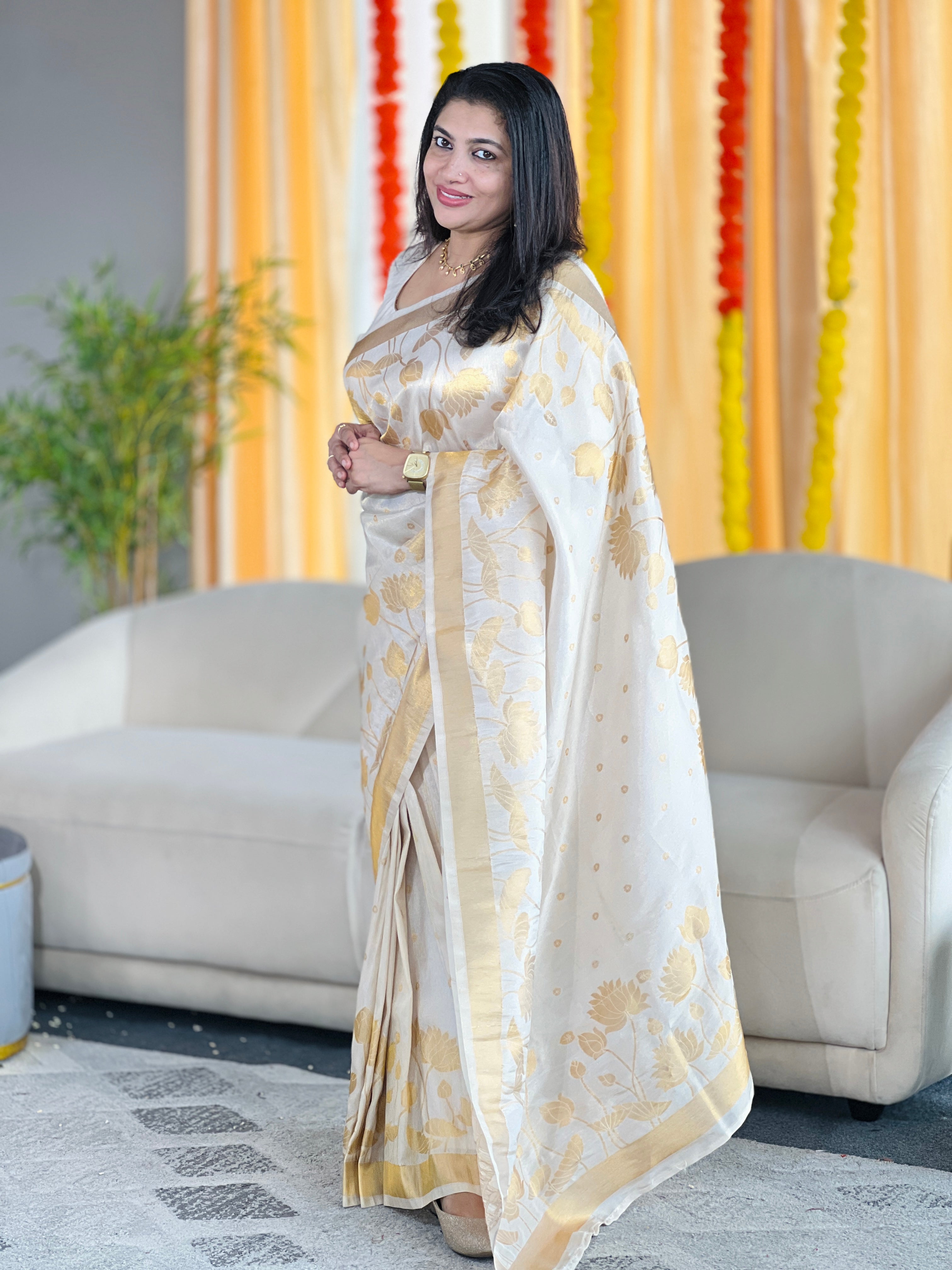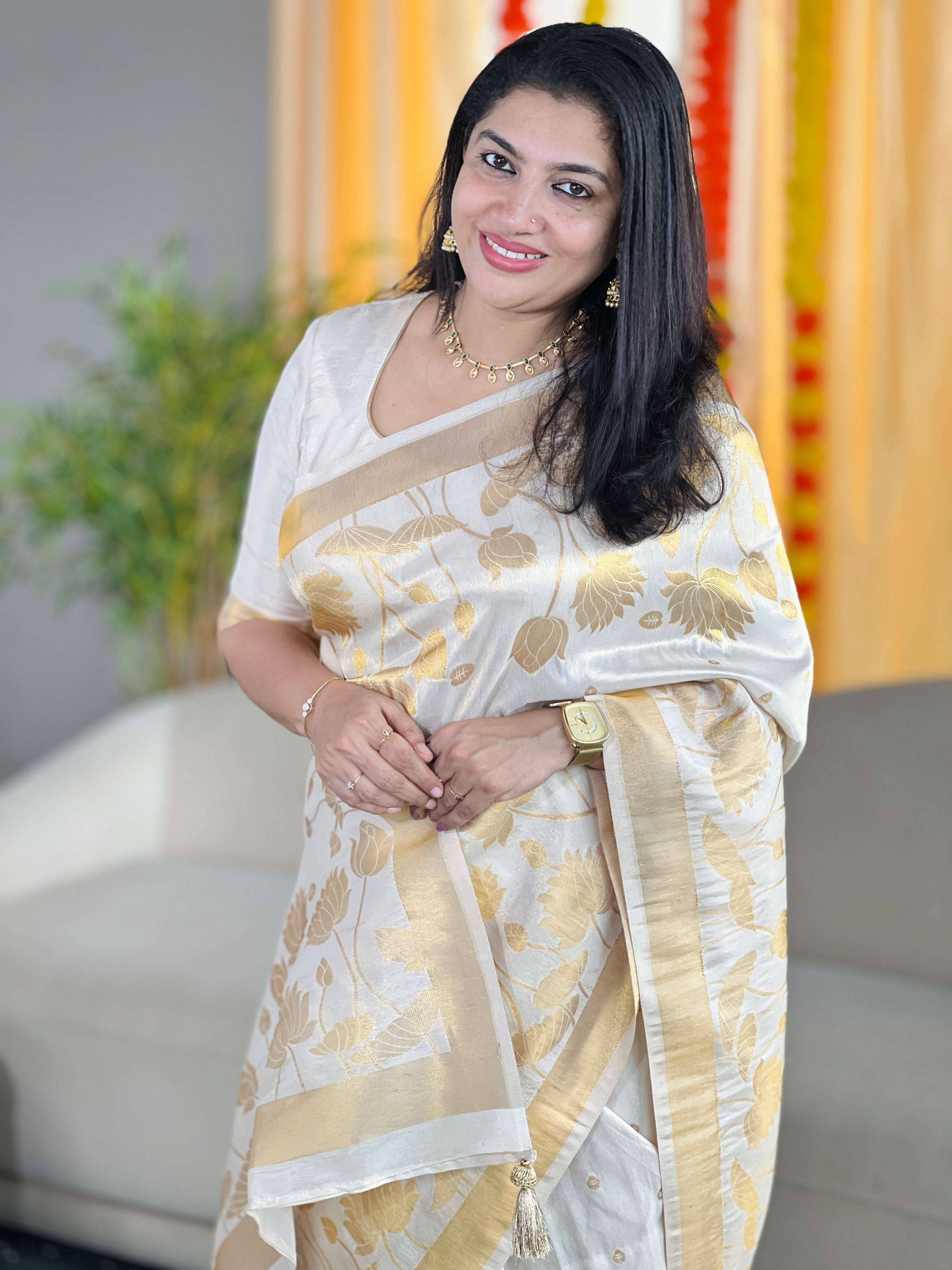 - Style: Tissue Weaved, Scattered Zari Weaving Butta Detailing, Traditional Lotus Patterned Placement Detailing On Borders & Pallu, Jhumka Tassels Detailing