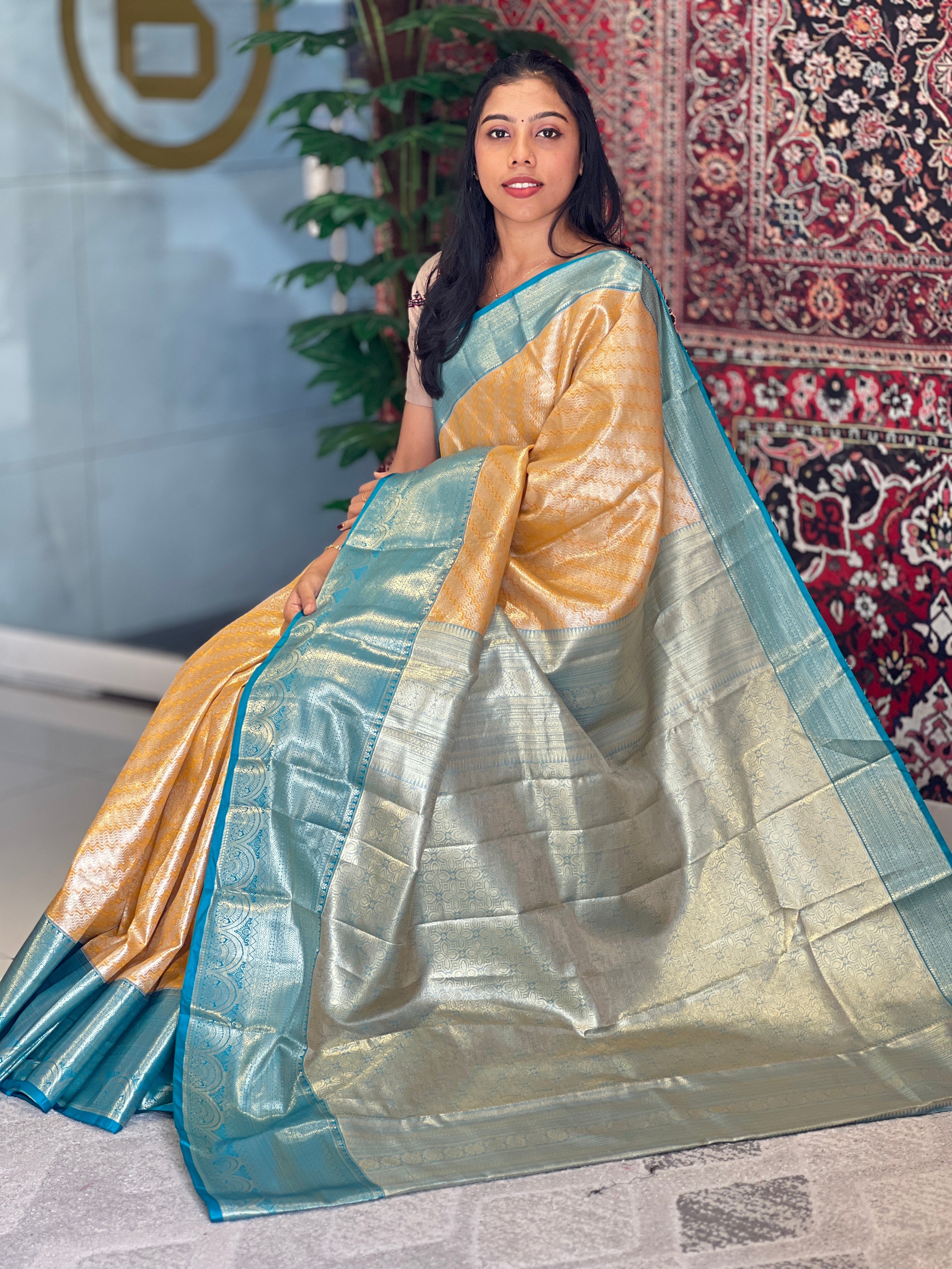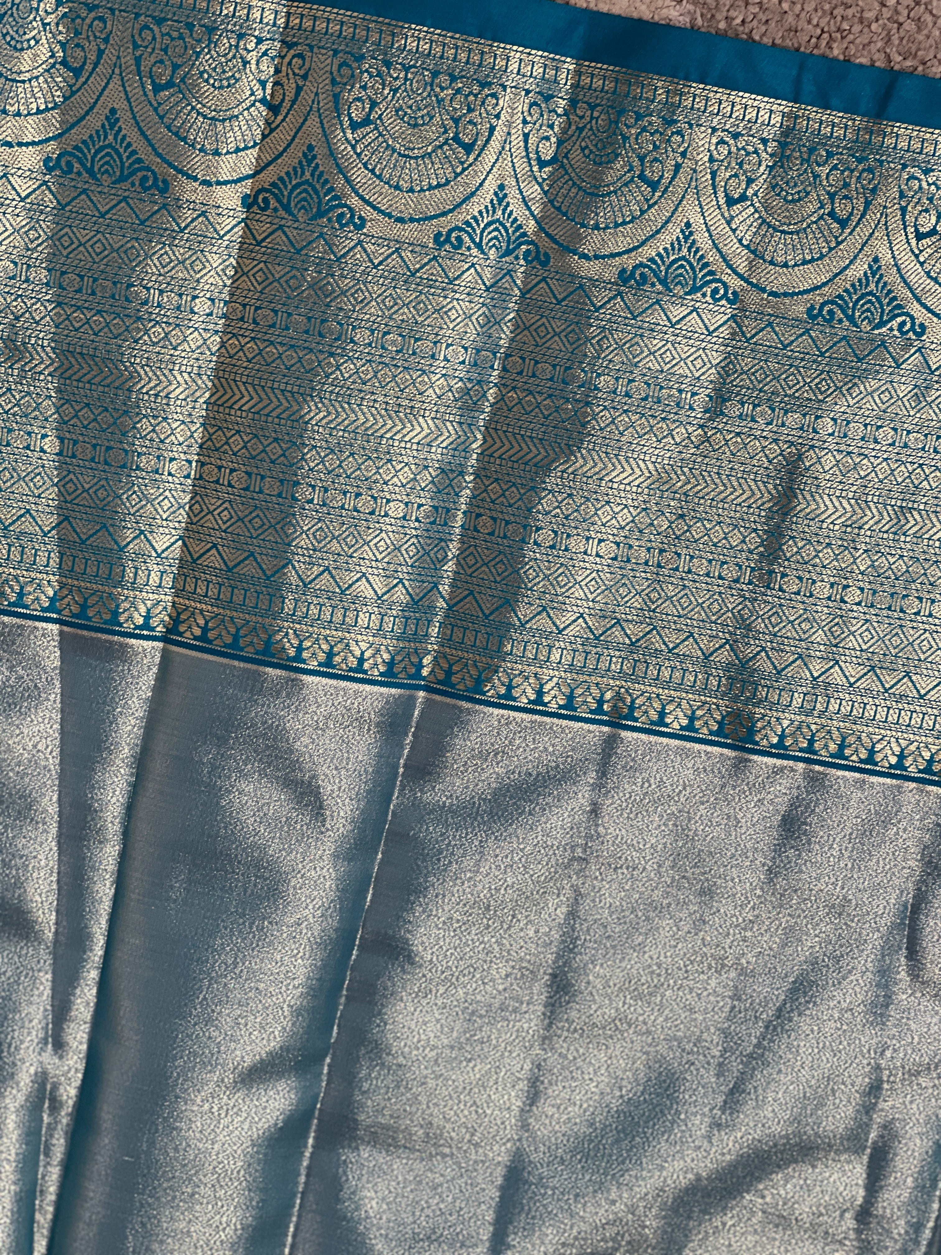 - Style: Contrast Traditional Banarasi Border Pattern, Silver Zari Woven Zigzag Patterned Body, Geometric-Floral Patterned Pallu, Tissue Weaved