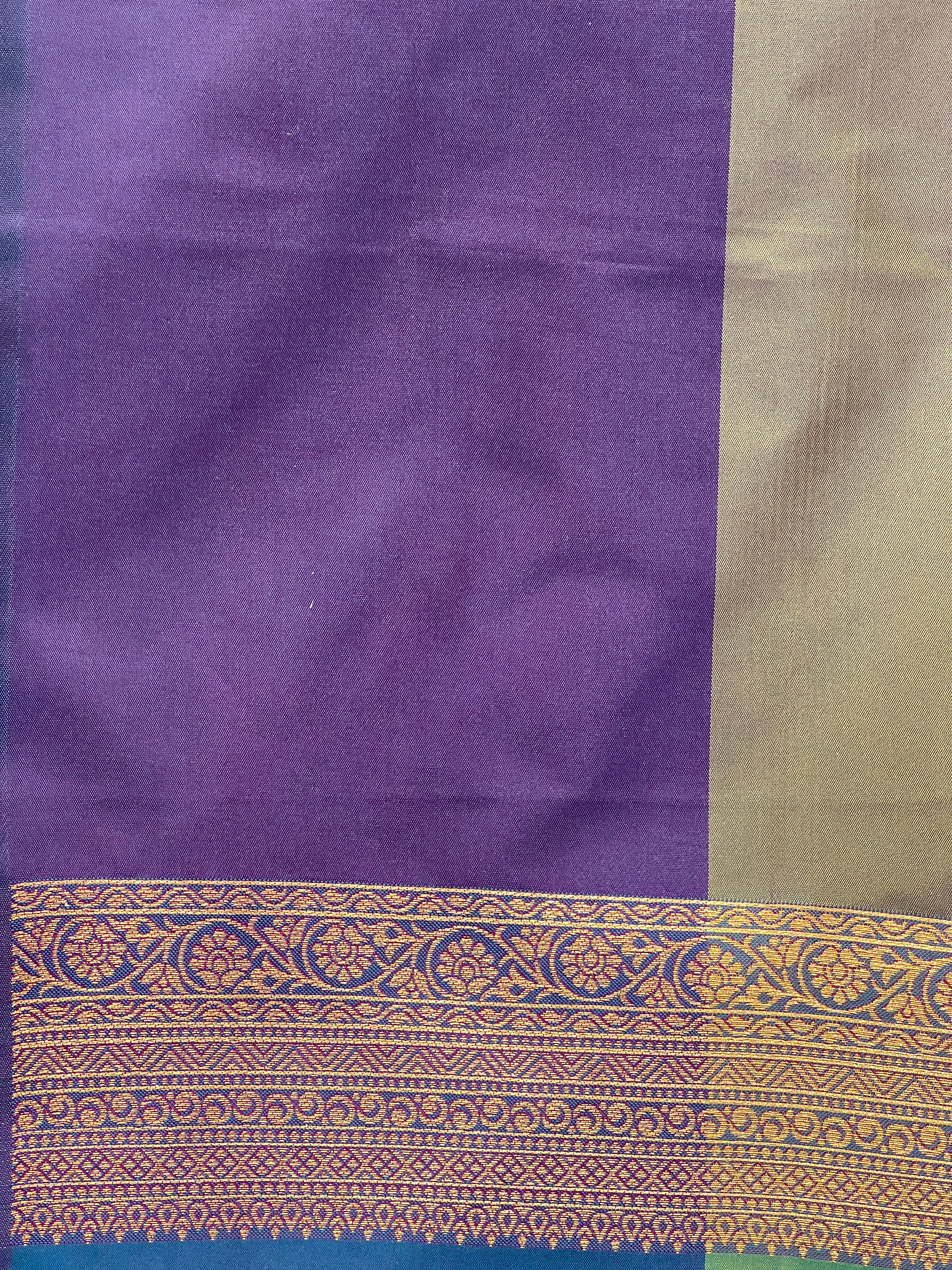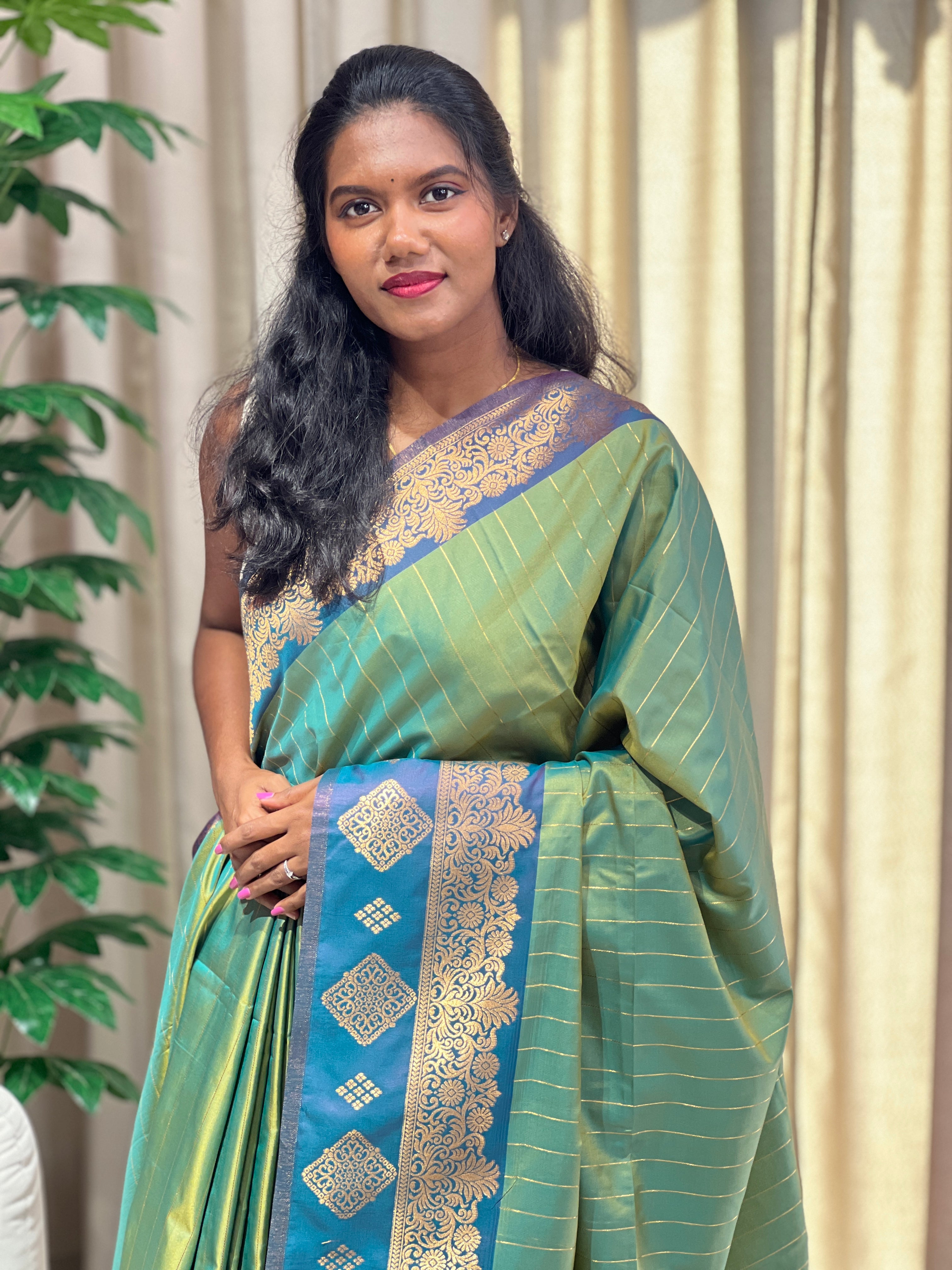 • Style: Zari Woven Stripe Pattern, Traditional Zari Woven Borders, Diagonal Patterned Pallu, Contrast Borders